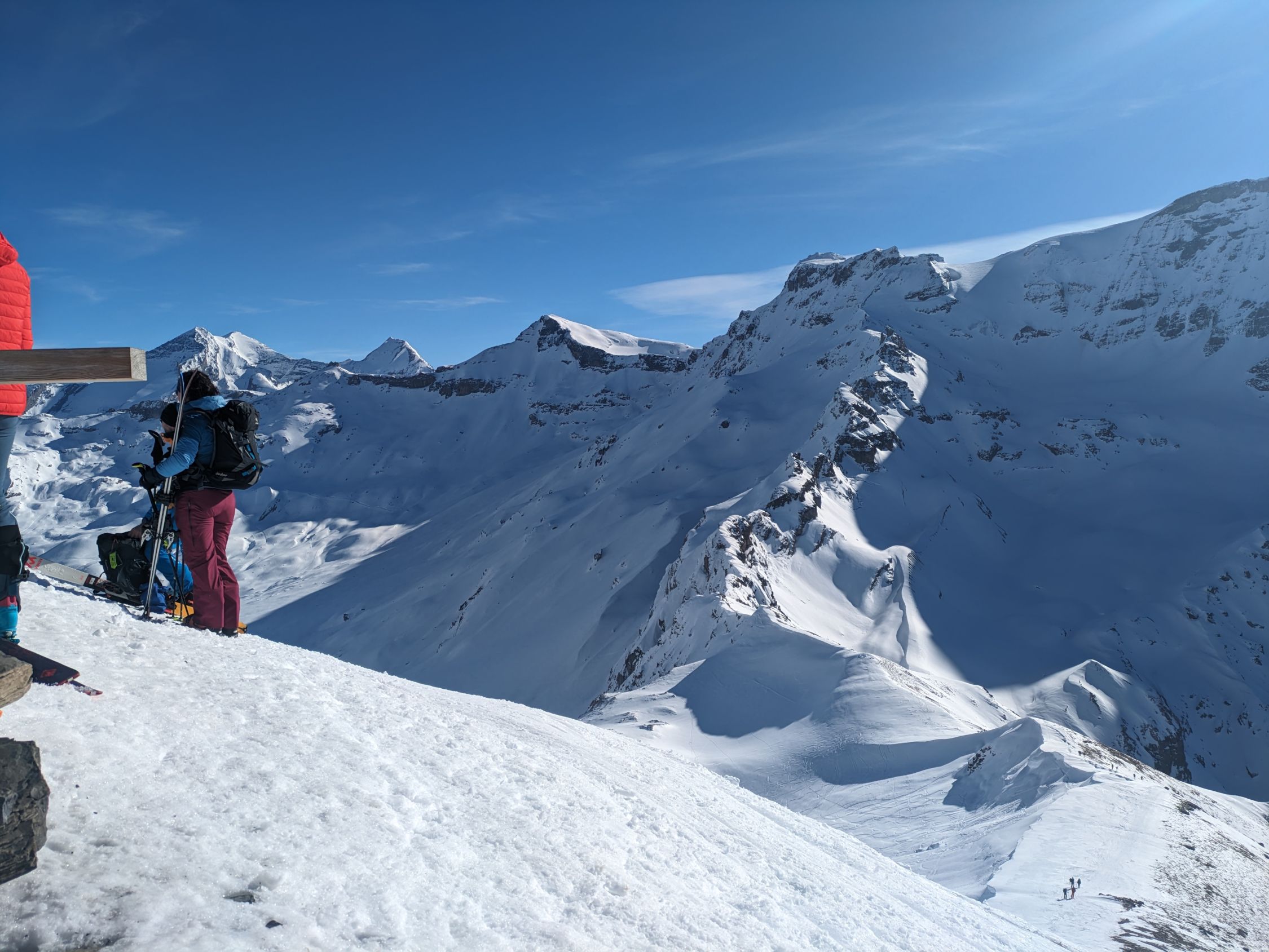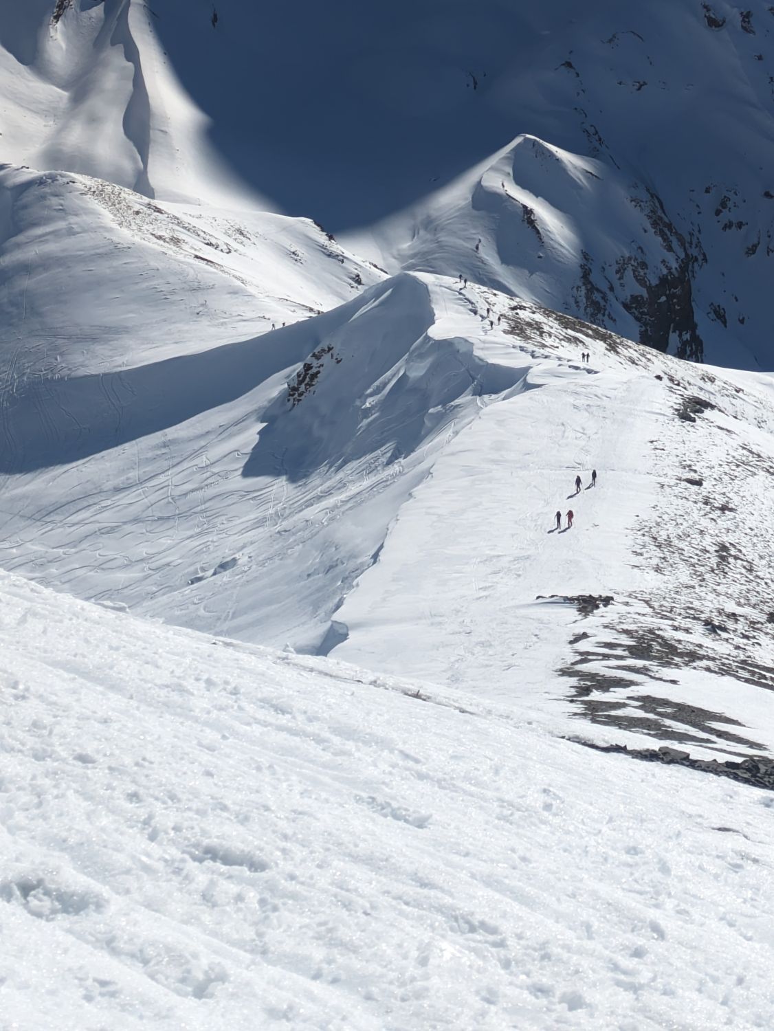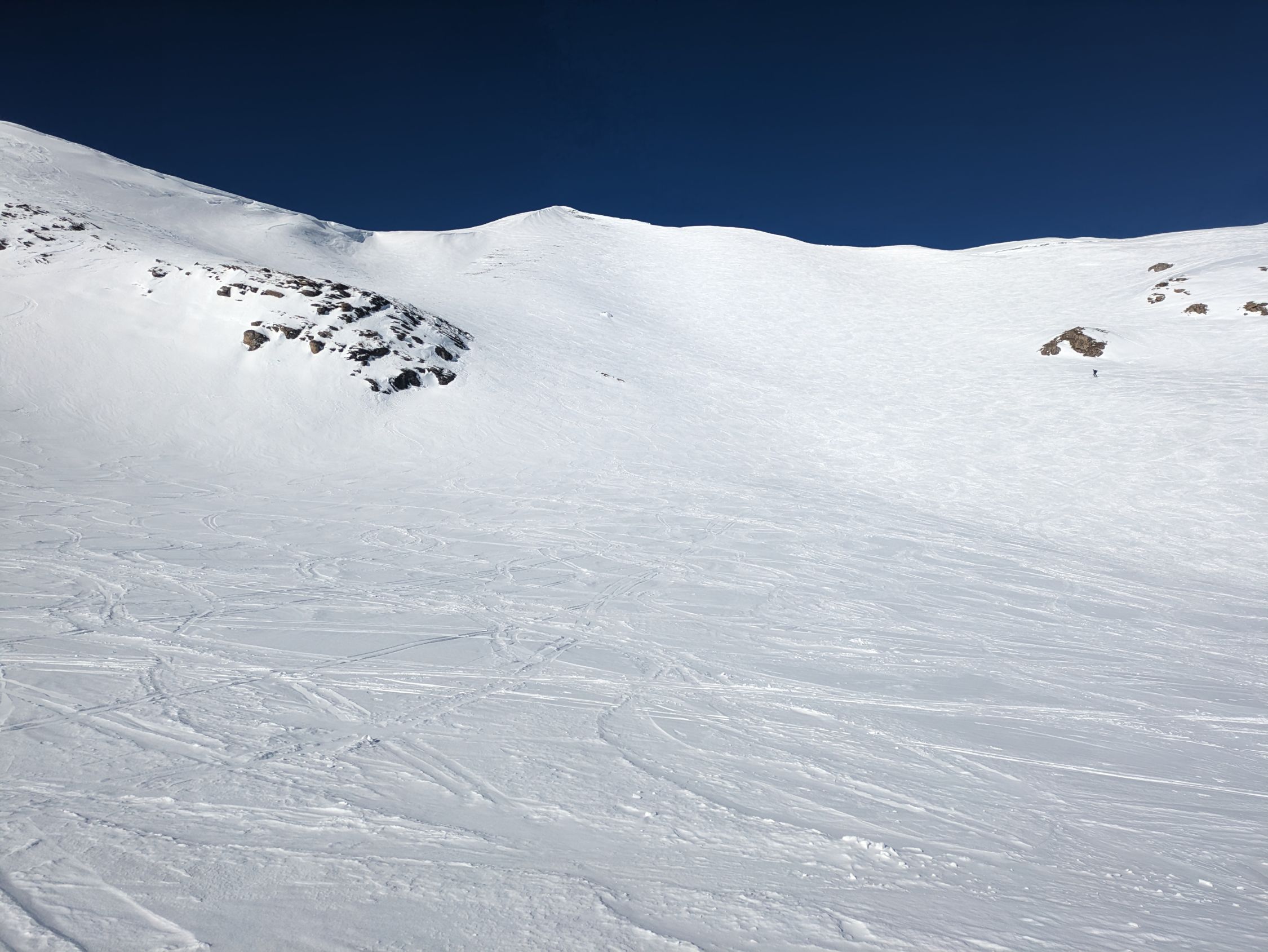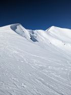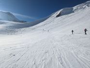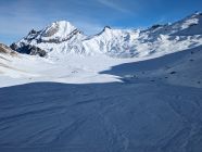 Durchgehend Schnee, aber teilweise glasig im Aufstieg. Am Südost-Gipfelgrat zwar abgeblasen, aber es hat dort für den Aufstieg noch genug Schnee (siehe Fotos).