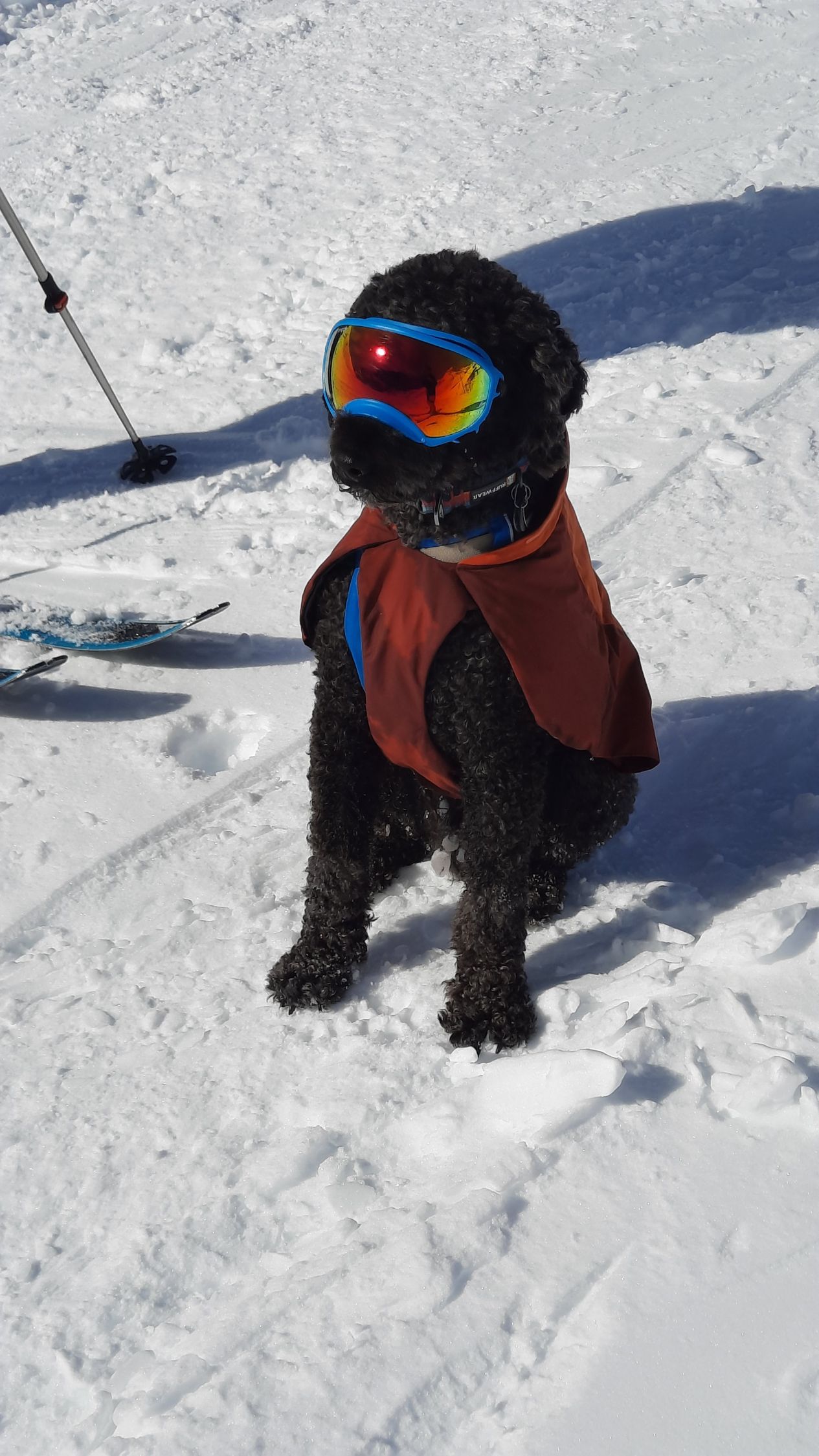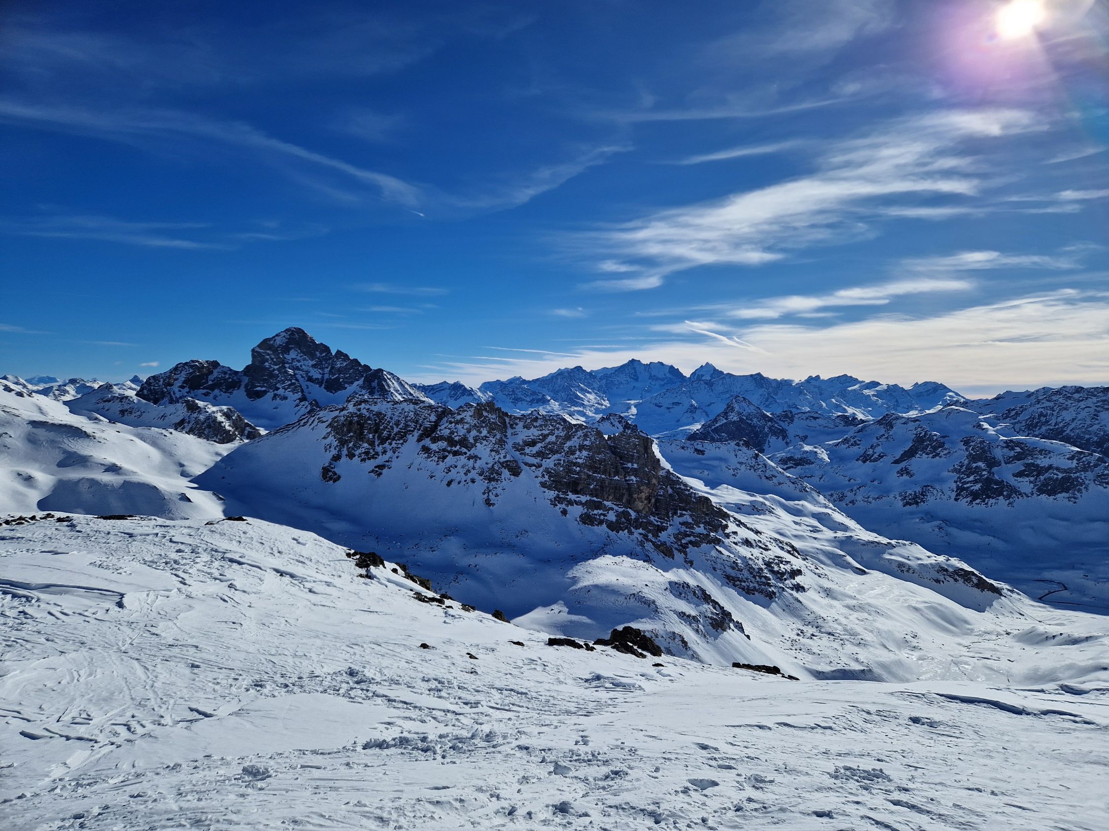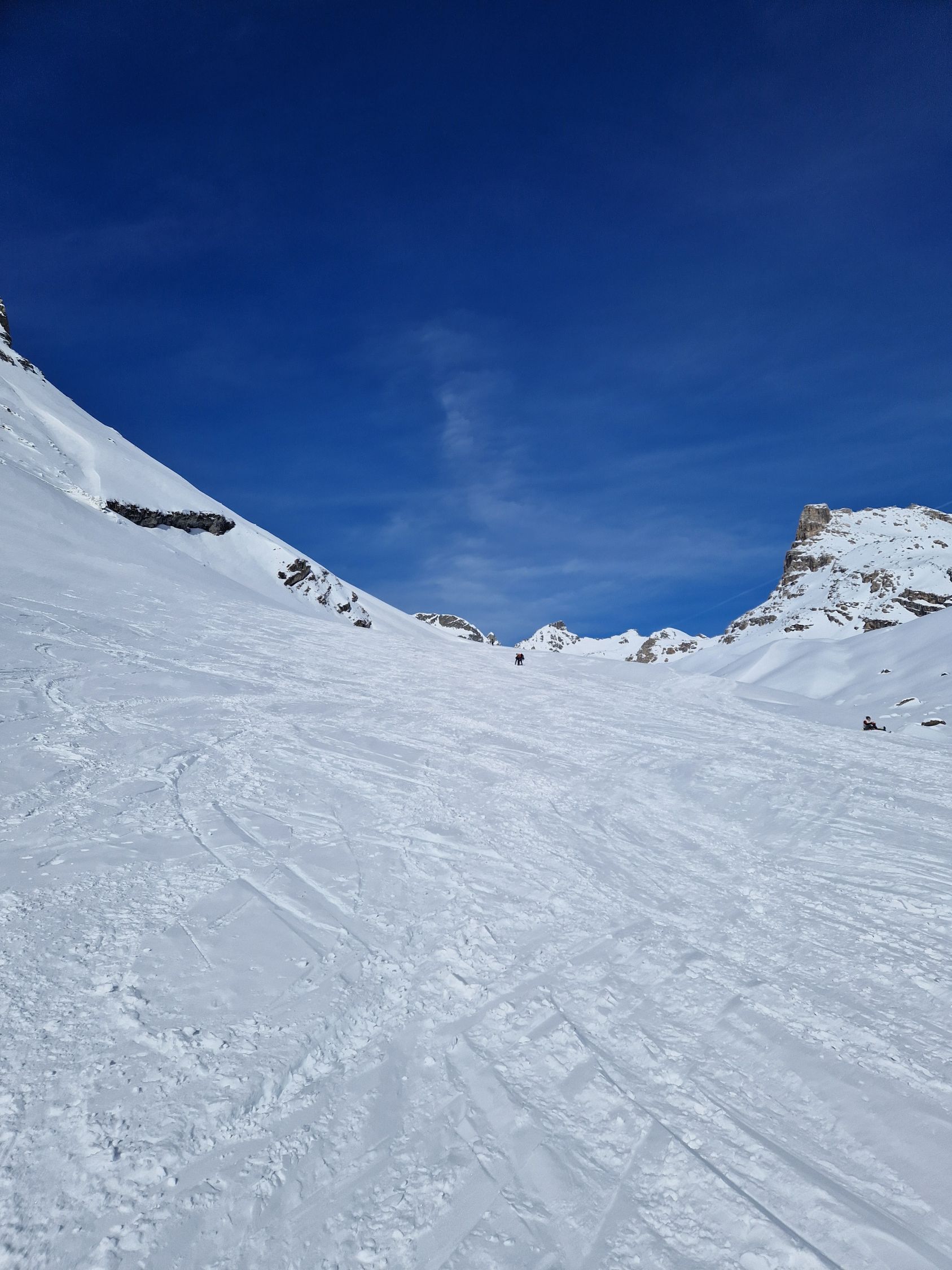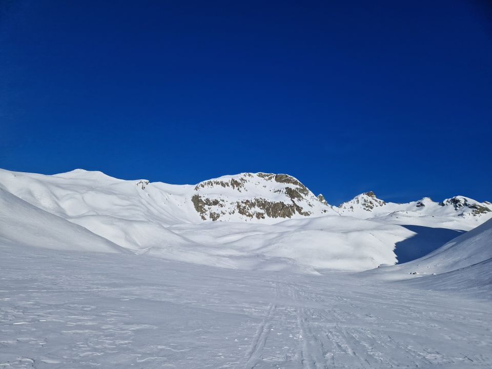 Die Abfahrt war vom Gipfel bis P. 2782 meist pistenartig, aber schon leicht angweicht. Kurz oberhalb P. 2782 wählten wir die quasi unverspurte steilere Abfahrt unn konnten ein Paar schöne Schwünge und natürlich Sprünge im quasi-Pulver ziehen. Danach via Normalroute zurück in die lange Querfahrt im Val d'Agnel. Der untere Teil dann wieder pistenartig mit einigen schönen Firnschwüngen.
