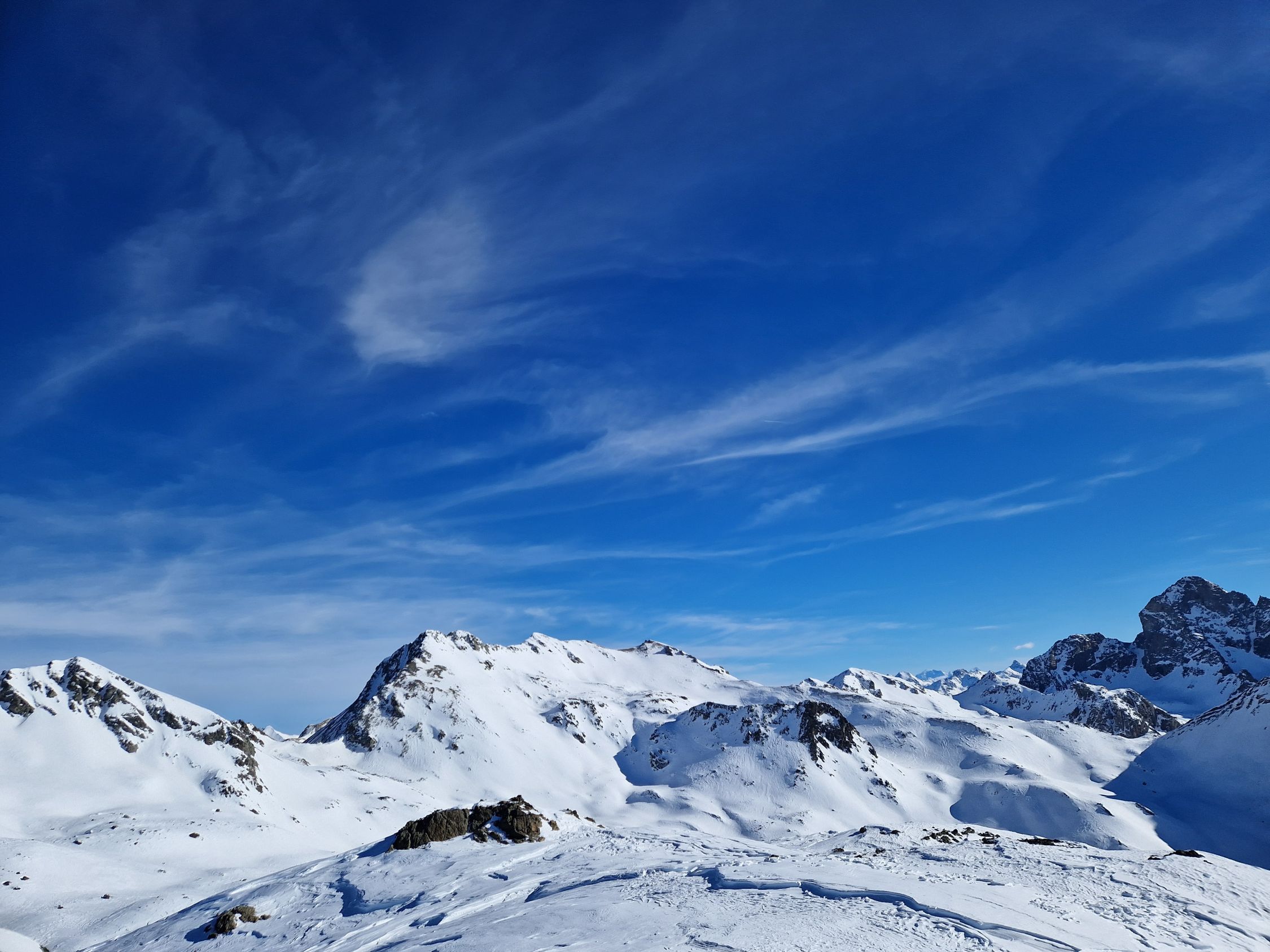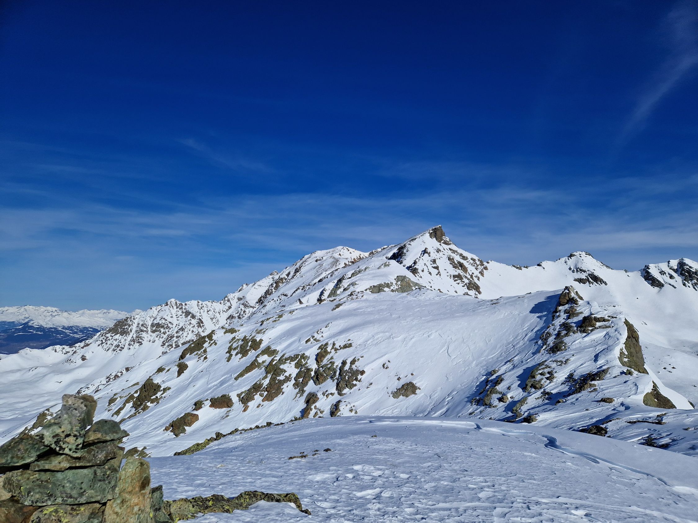 Bis P. 2537 auf gewöhnlicher Autobahn im Val d'Agnel. Nach Abzweig in Richtung Piz Campagnung waren wir alleine unterwegs und die Spur oft zugeweht, so dass wir hier und da eine neue legen konnten. Bei P. 2782 ging die Steilstufe gut ohne Harscheisen, danach haben wir sie aber montiert, was an der ein oder anderen Stelle auch hilfreich war. Es wehte ein recht kräftiger Wind aus Nord-Ost, zuerst böig, als wir am Gipfel waren dann recht konstant.