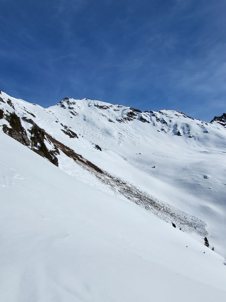 Von der Bergstation für ca. 30-40 min bis Schiben (ca. 1400 müM) entlang der Skiroute getragen. Davor gäbe es zwar einzelne Schneefelder, laufen ging aber schneller. Ab da geschlossene und am Morgen harte Schneedecke mit teils glasiger Spur. In den Sunnenblanggen sind diverse Gleitschneelawinen runter und wir sind über den Grat bis zum Vorgipfel P2163. Abfahrt um ca 12:30, oben schön angesulzt, unten dann aber fast schon Bremsschnee und frühlingshafte Tempereraturen. Abfahrt direkter bis auf ca. 1400 oberhalb des Reservoirs, von da wieder tragen.