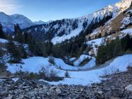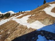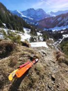 Etwa beim Punkt 1972 habe ich Harscheisen montiert, weil die Hänge noch ziemlich hart waren. Durch die Ladholzchume ging es wieder gut ohne Harscheisen, erst im Aufstieg zum Ladholzssattel waren diese wieder hilfreich.