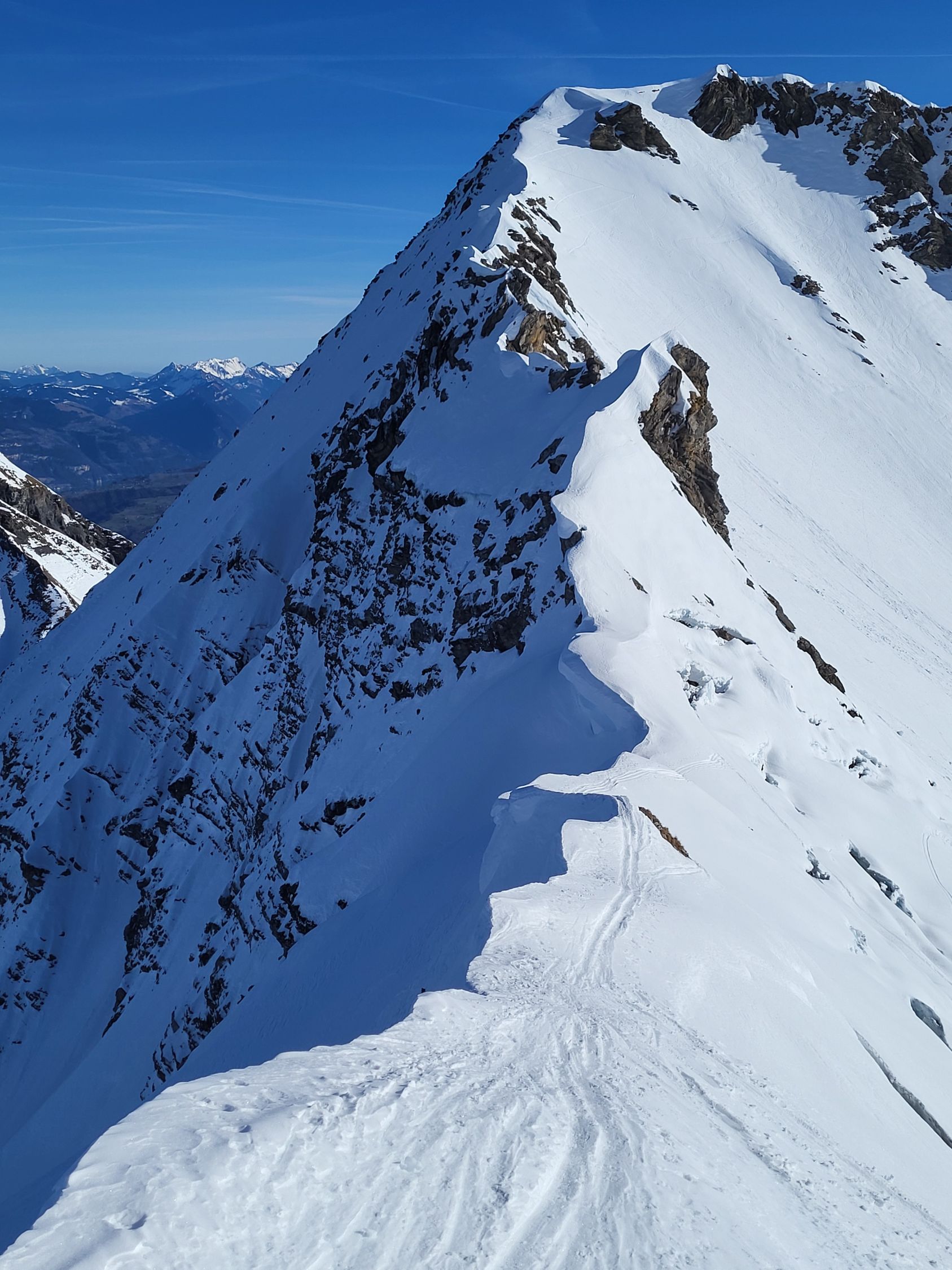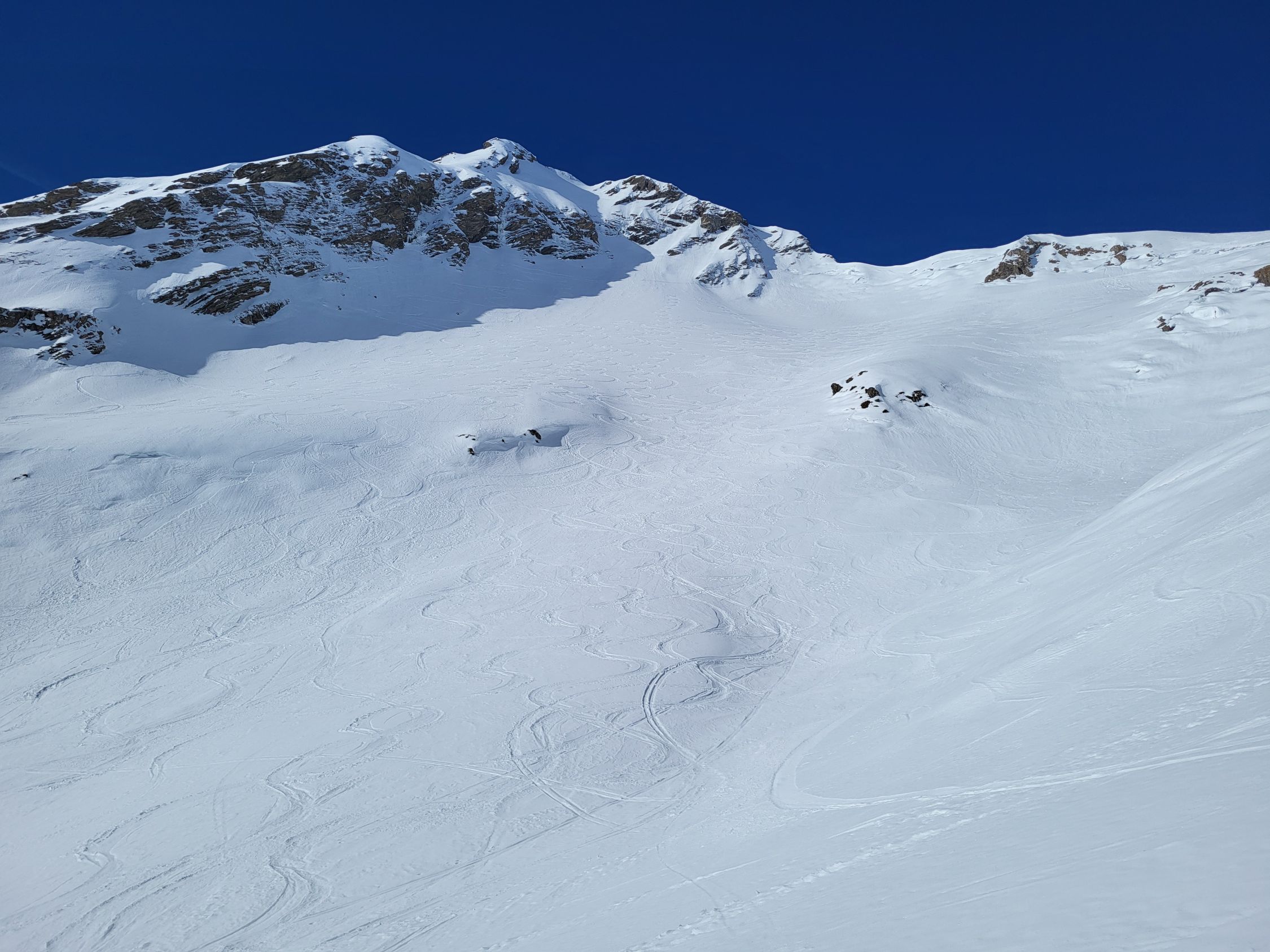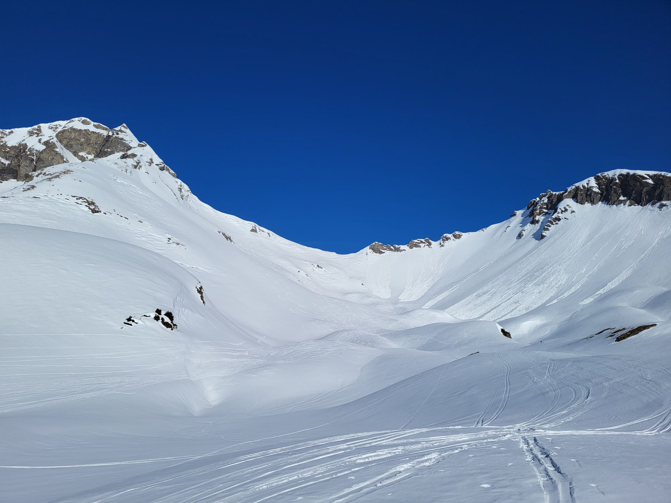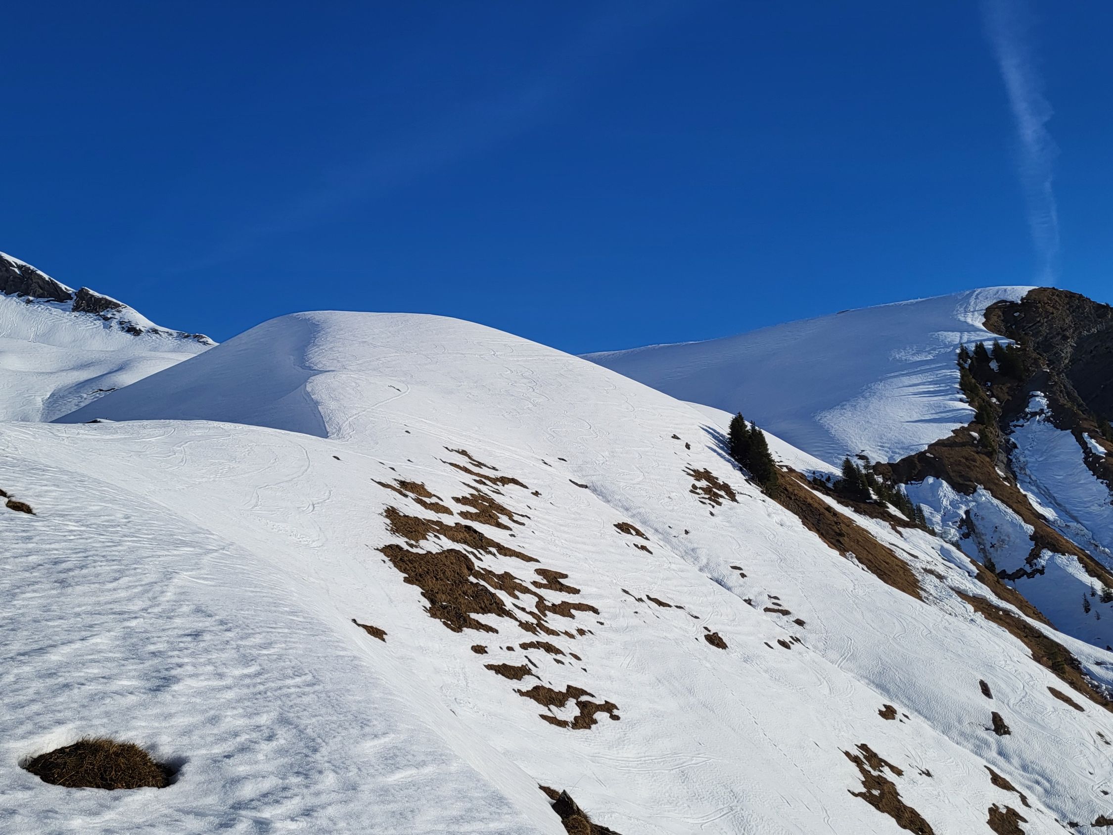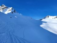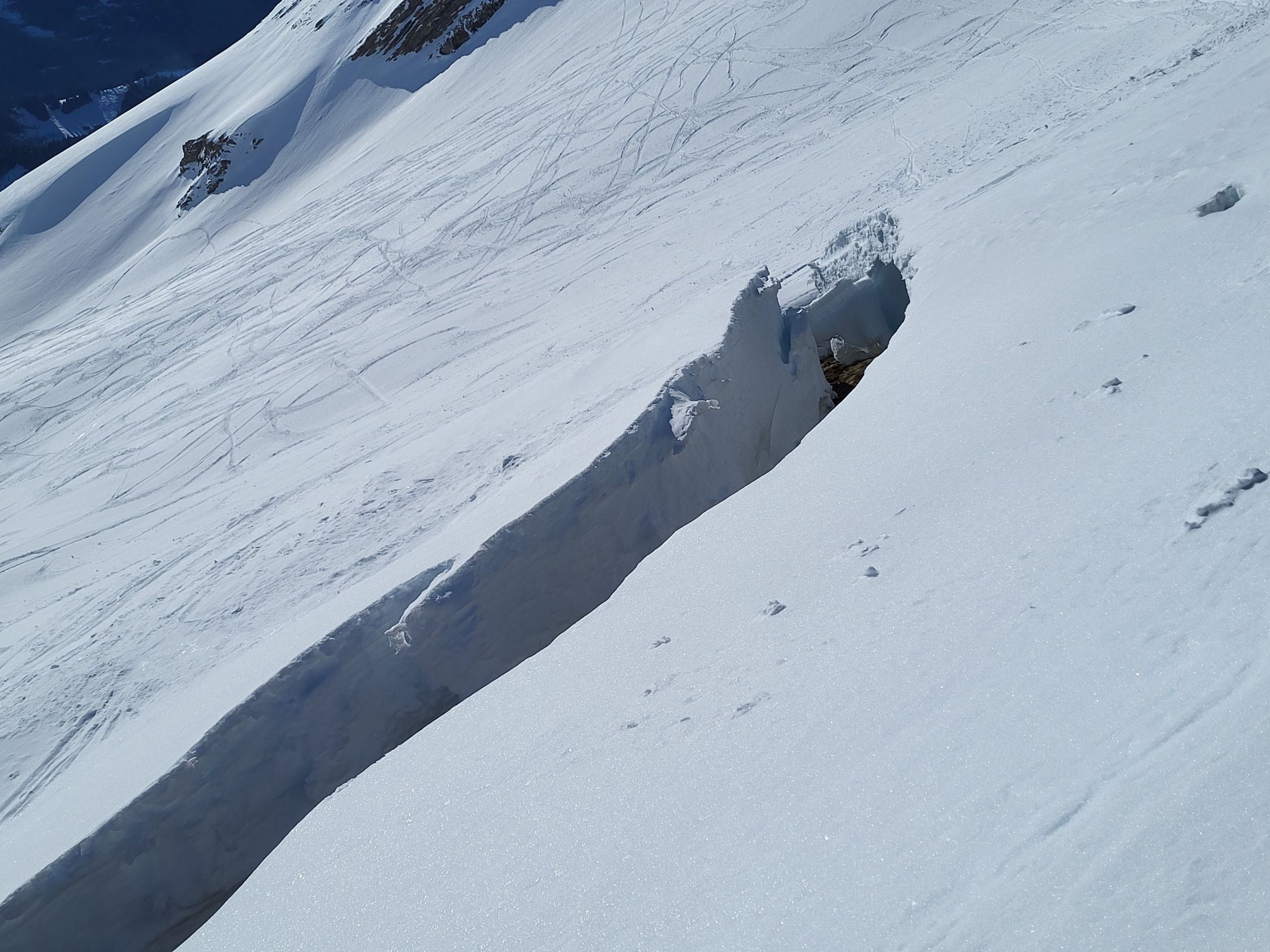 Beim Ladholzsattel hat es fast auf der ganzen Breite ein grosses Fischmaul, welches man sowohl beim Aufstieg als auch bei der Abfahrt passieren muss. Ich hatte ein ungutes Gefühl, aber es ist nichts passiert. Auf der Nordseite war der Schnee pulvrig und es hat eine gute Spur bis zum Gipfel.
