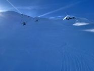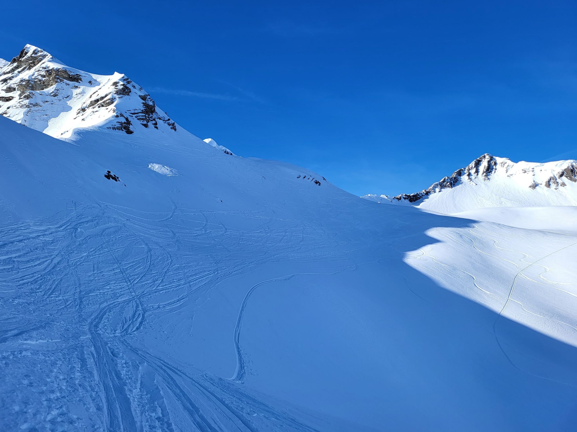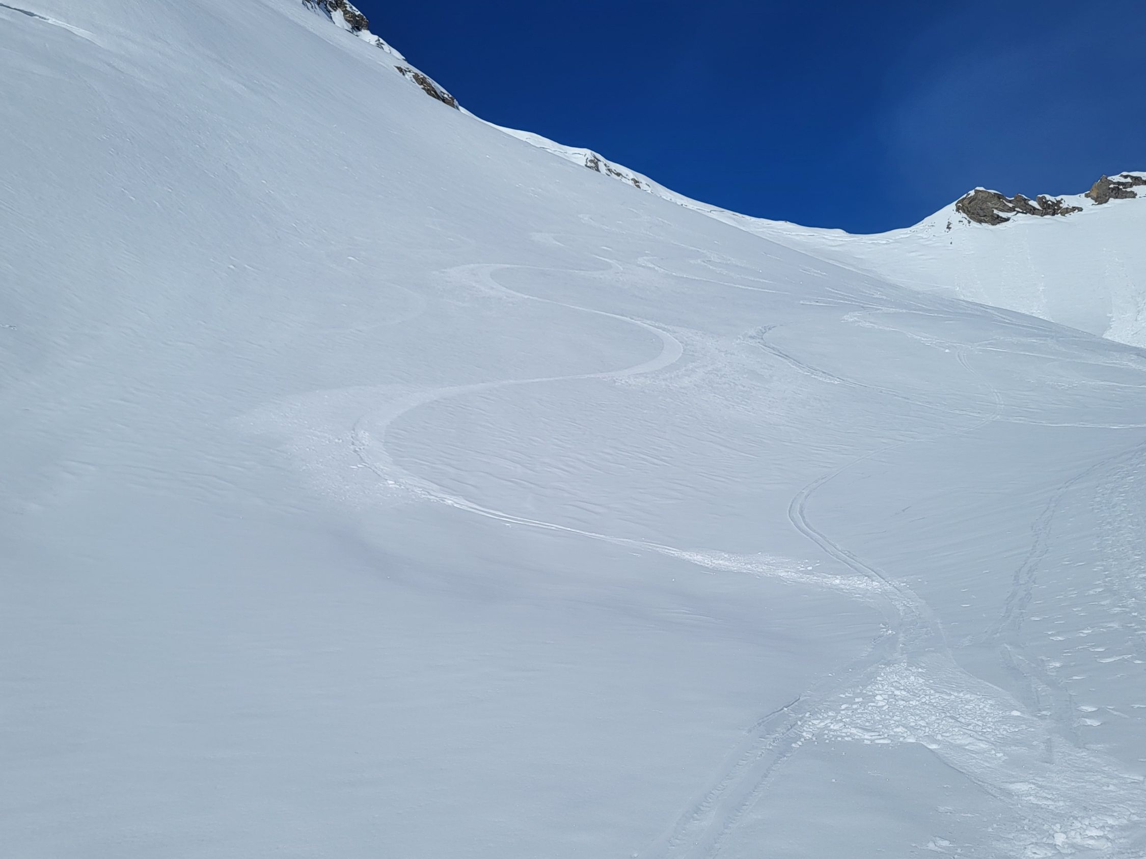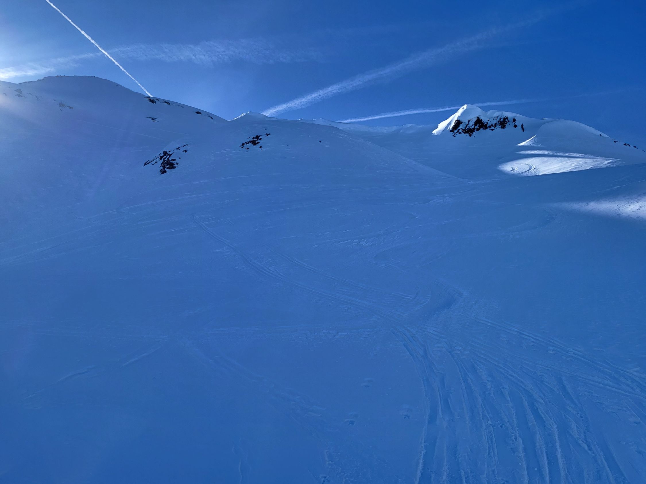 Kurz nach 11 Uhr bin ich abgefahren. Zuerst ein paar Schwünge im Pulverschnee und dann über wunderschöne Sulzhänge bis zur Alp Ottere. Auch auf der Fahrstrasse nach der Alp war der Schnee schön weich.