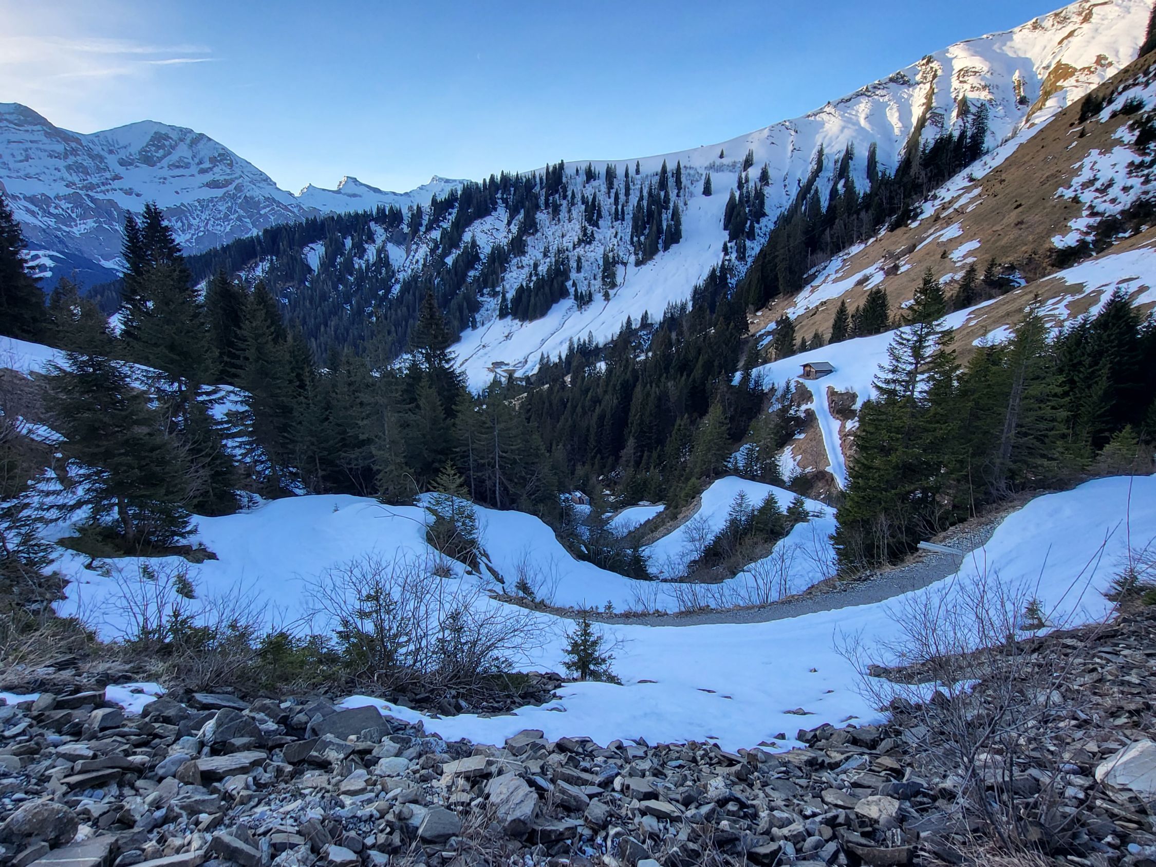 Um 08:05 Uhr bin ich gestartet, zuerst zu Fuss bis zu den Häusern Im Schwand. Zwei andere Tourengruppen haben dort parkiert. Kurz nach der Talstation der Transportgondel hat es durchgehend Schnee auf der Fahrstrasse zur Alp Ottere und der Aufstieg war problemlos möglich.
