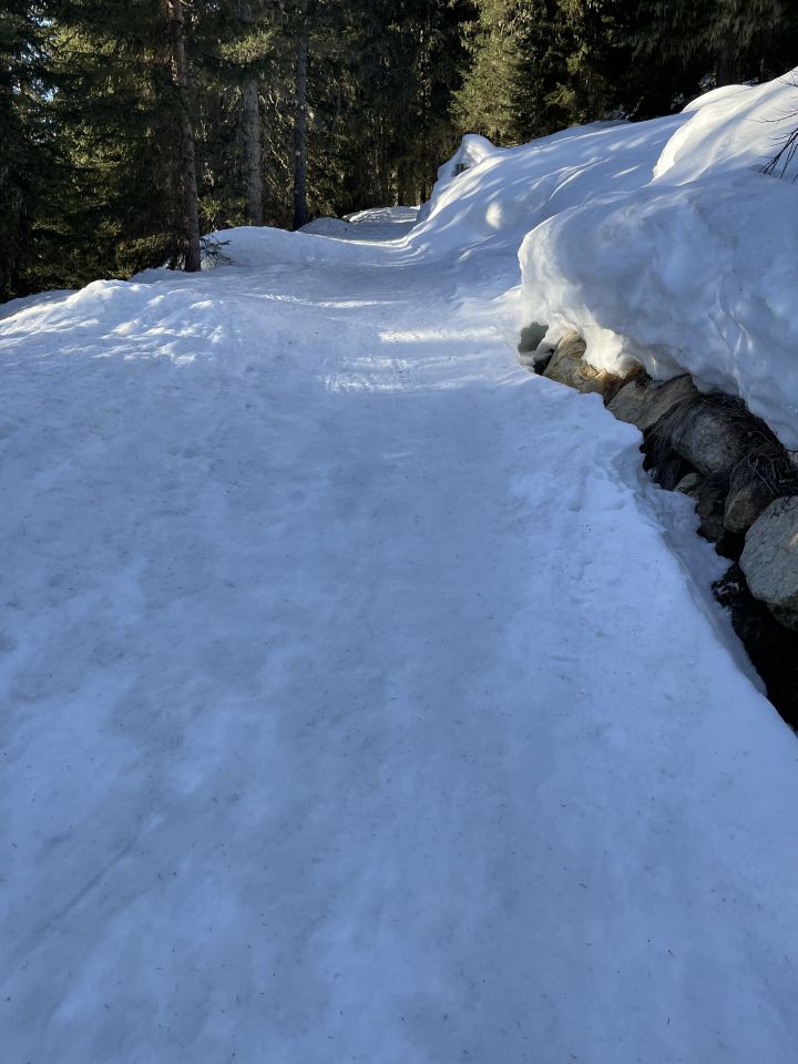 Es hat noch gerade genug Schnee, um zur Kurve 1638 direkt hochzusteigen (Harscheisen, 1x ganz kurz Ski getragen). Weiter auf der Waldstrasse gut eingeschneit, teils dazu auch gut eingenadelt aber alles auch fahrbar. Oberhalb 1914 Schneeart je nach Expo und Neigung. Steile Südhänge sind rasch sehr weich.