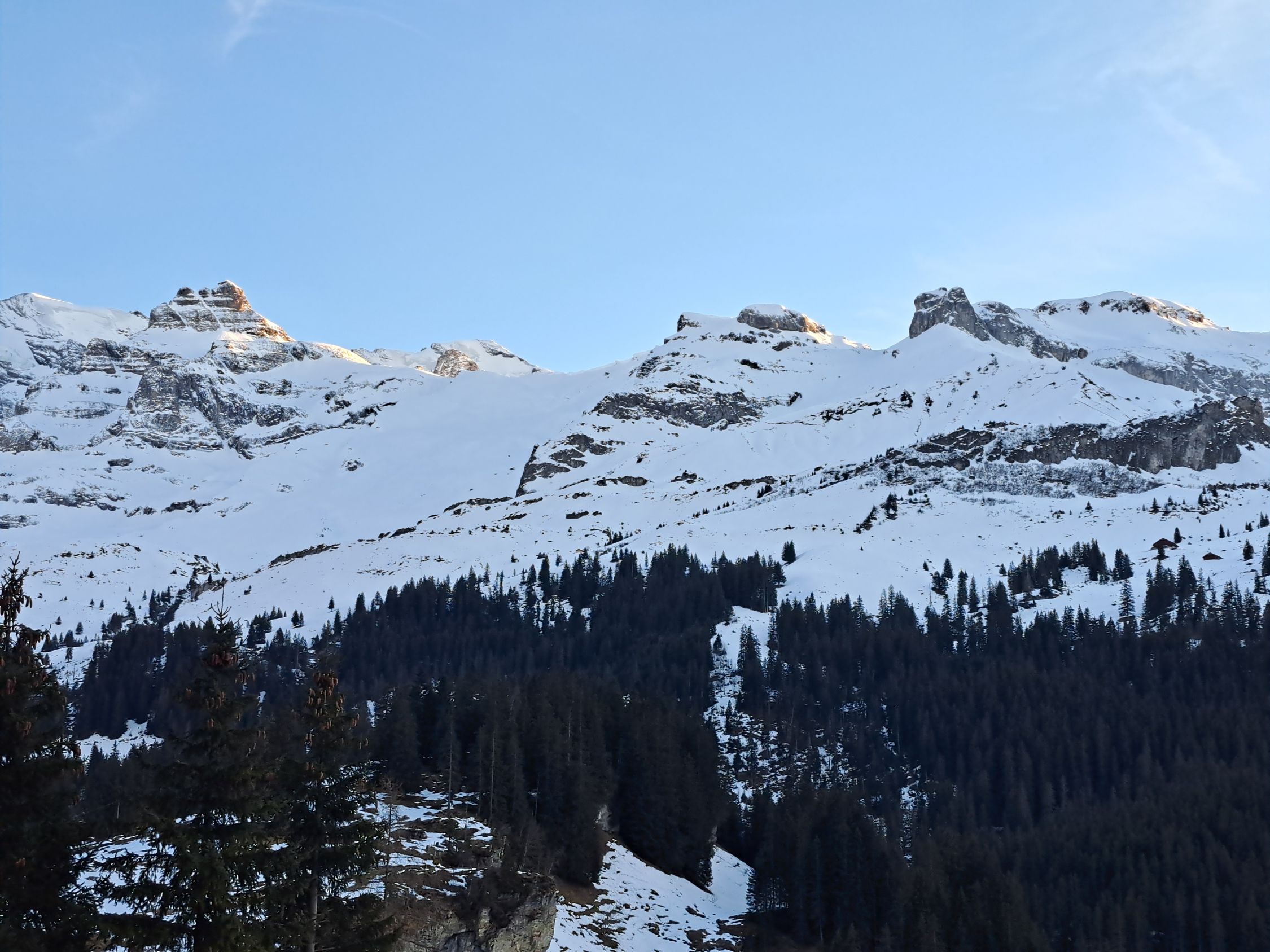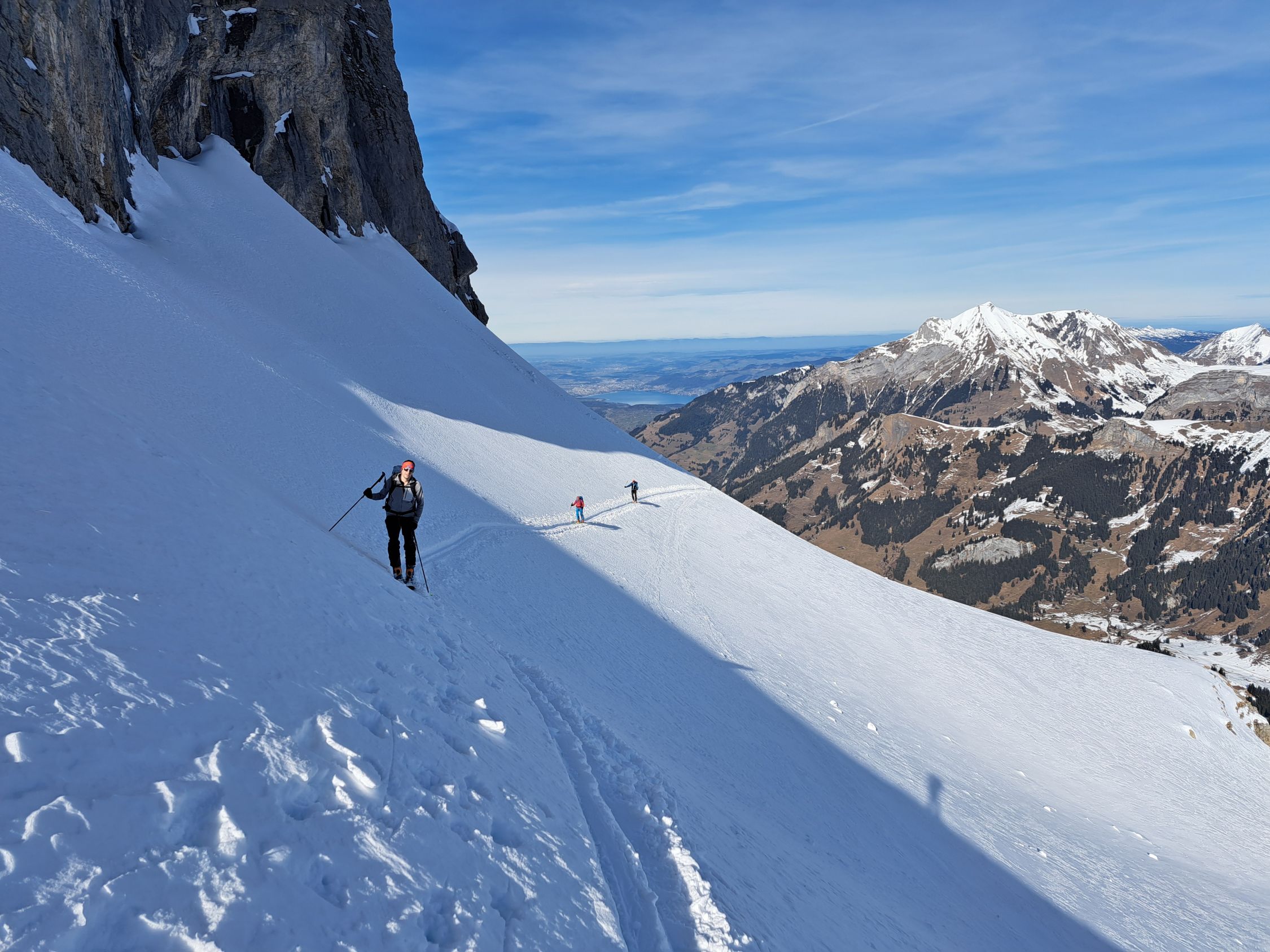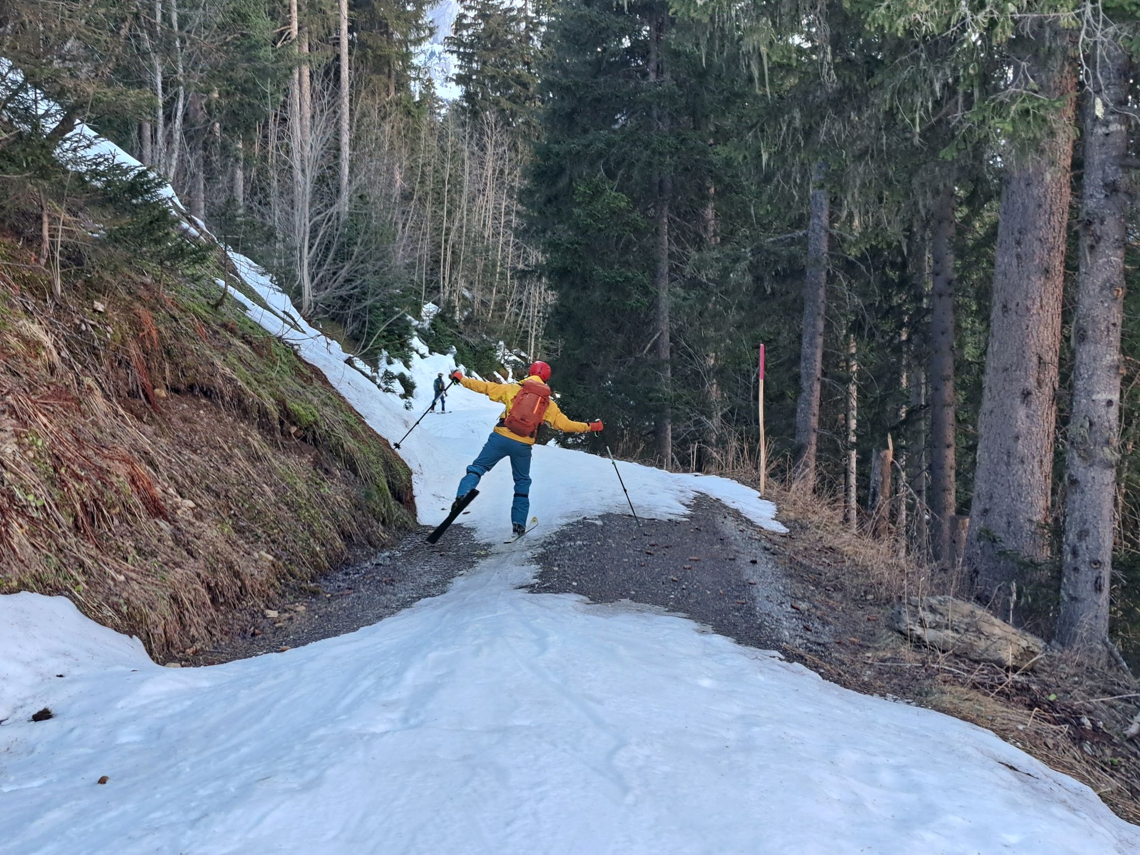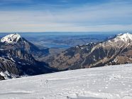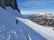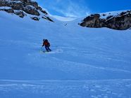 Abfahrt am Rand der Wächte, direkt vom Gipfel 200 Hm im Pulver der Bundstock Nord-Ostflanke, dann eisig-hart, dann Bruch, dann holprig-hart über Oberi Bundalp und bis ganz hinunter zur Griesalp. Im Bereich des Waldes gibt es die ersten aperen Stellen auf der Strasse.