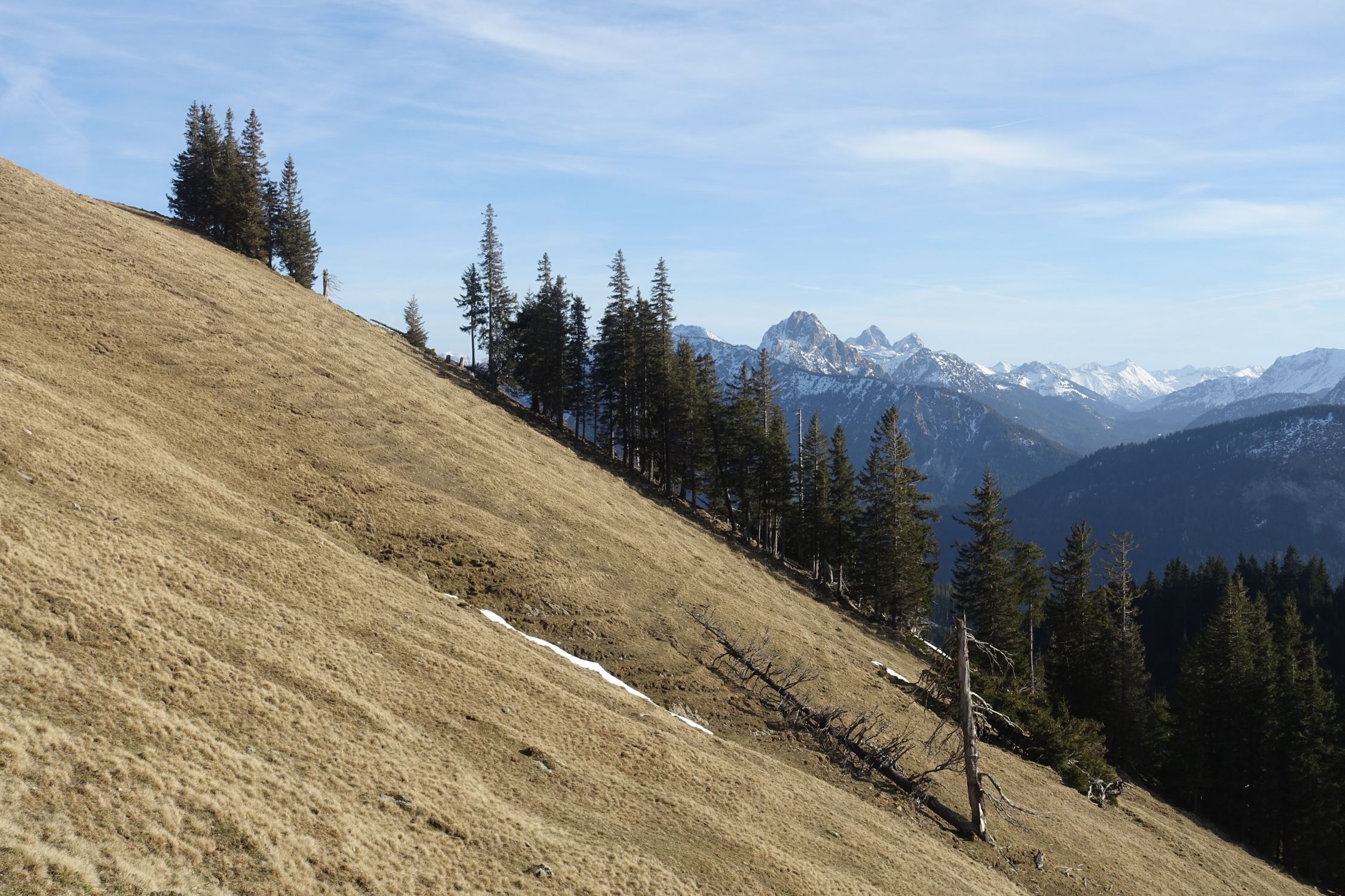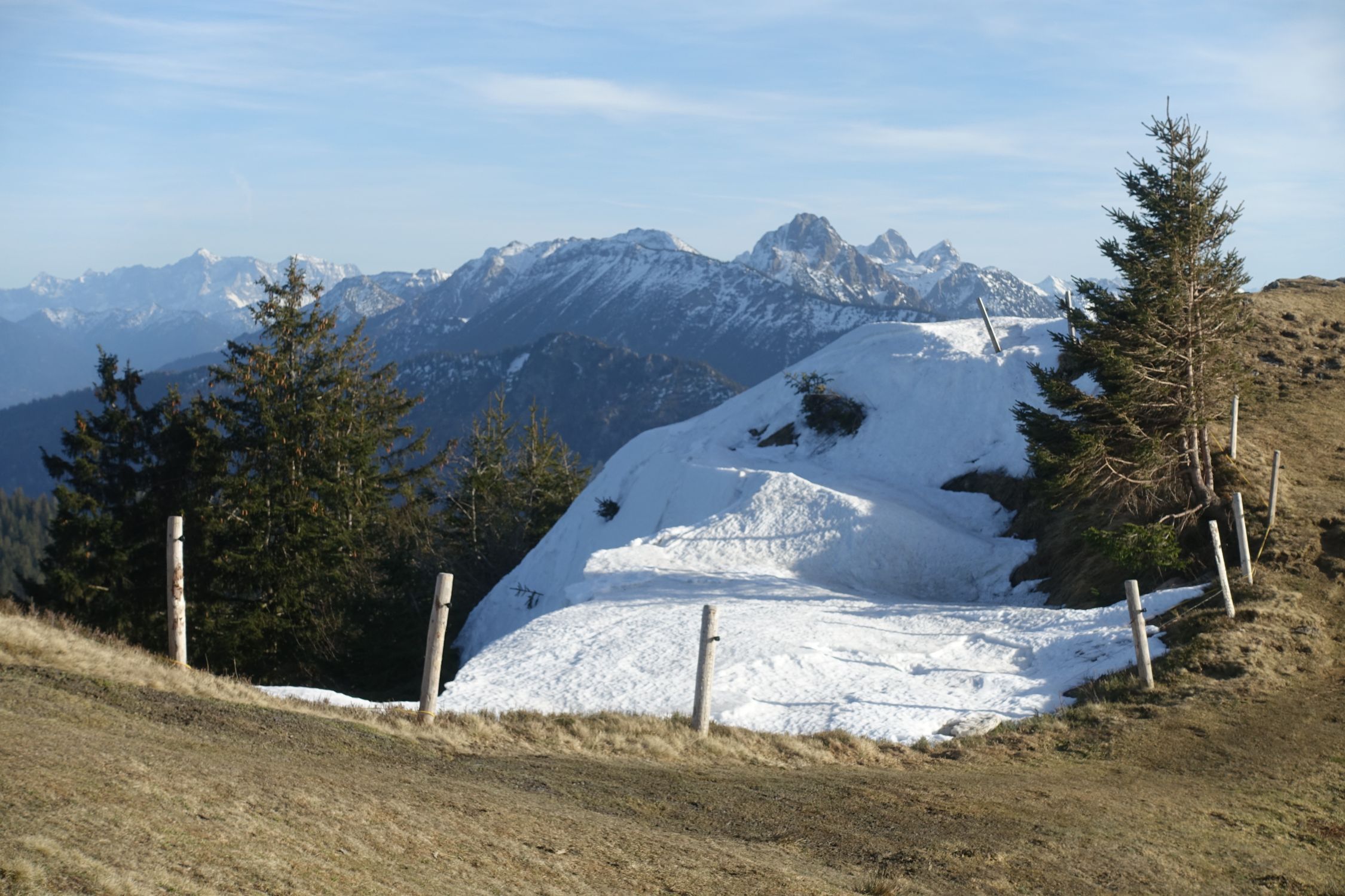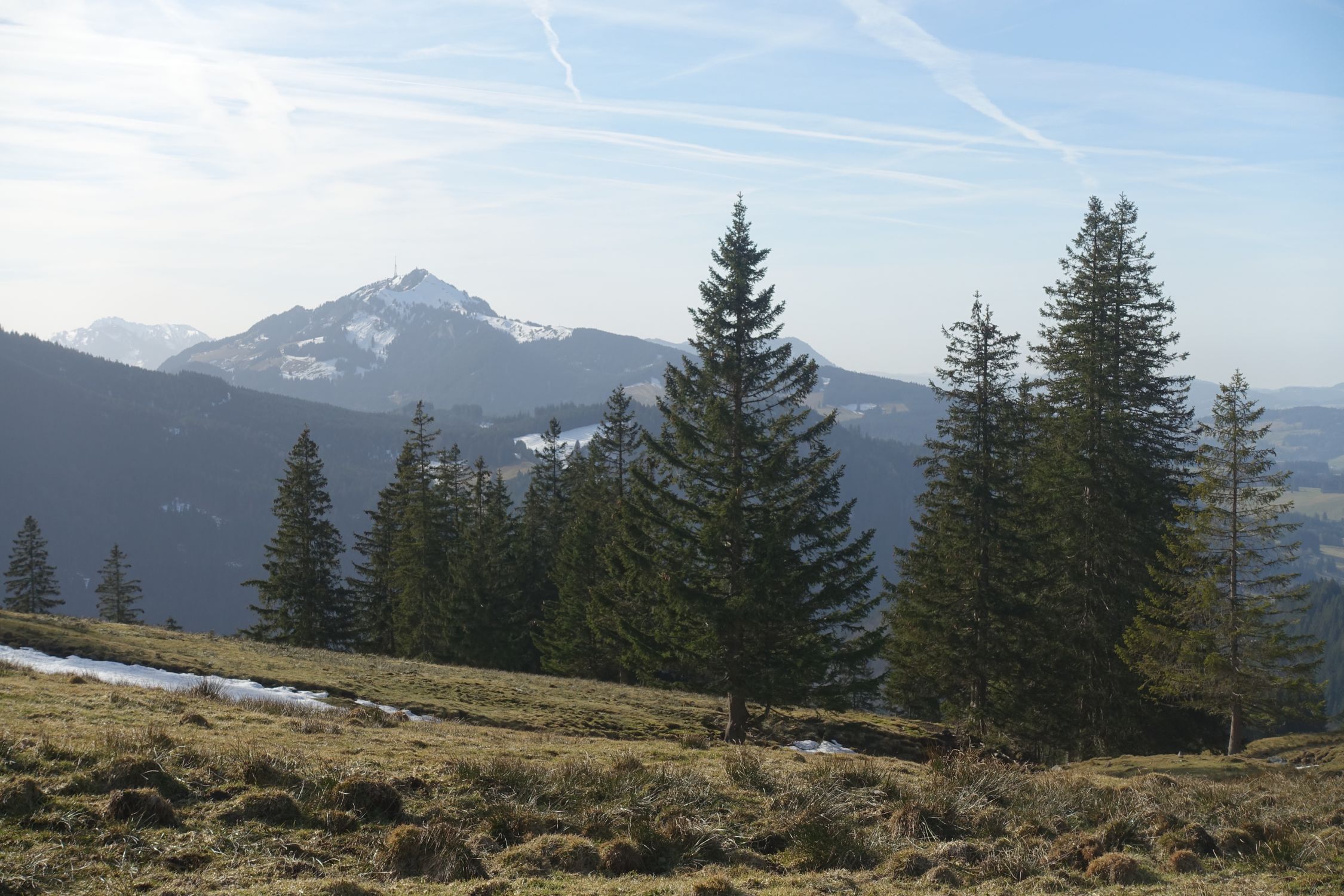 Sehr milde Temperaturen (ca. 12 Grad) und Wind beim Start in Langenschwand. Sonnig, ganz leichter Dunstschleier, v.a. beim Blick in die Allgäuer Alpen. Der Aufstieg ist bis auf ca. 50 m komplett schneefrei, oft auch schon recht trocken, daher sehr gut zu gehen. Im Abstieg auf der Nordseite des Pfeifferberg Schnee, aber sehr gut und breit gespurt, trittfest. Schnee endet ca. 50 Hm oberhalb der Stubentalalpe. Alpe geöffnet, Einkehr lohnend.