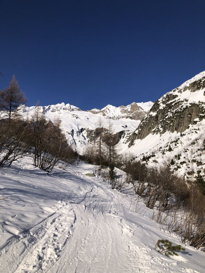 Im unteren Teil hart gefroren und Aufstiegsspur nur noch bedingt vorhanden (pistenänhlich) - Harsteisen leisten hier am Morgen gute Dienste.