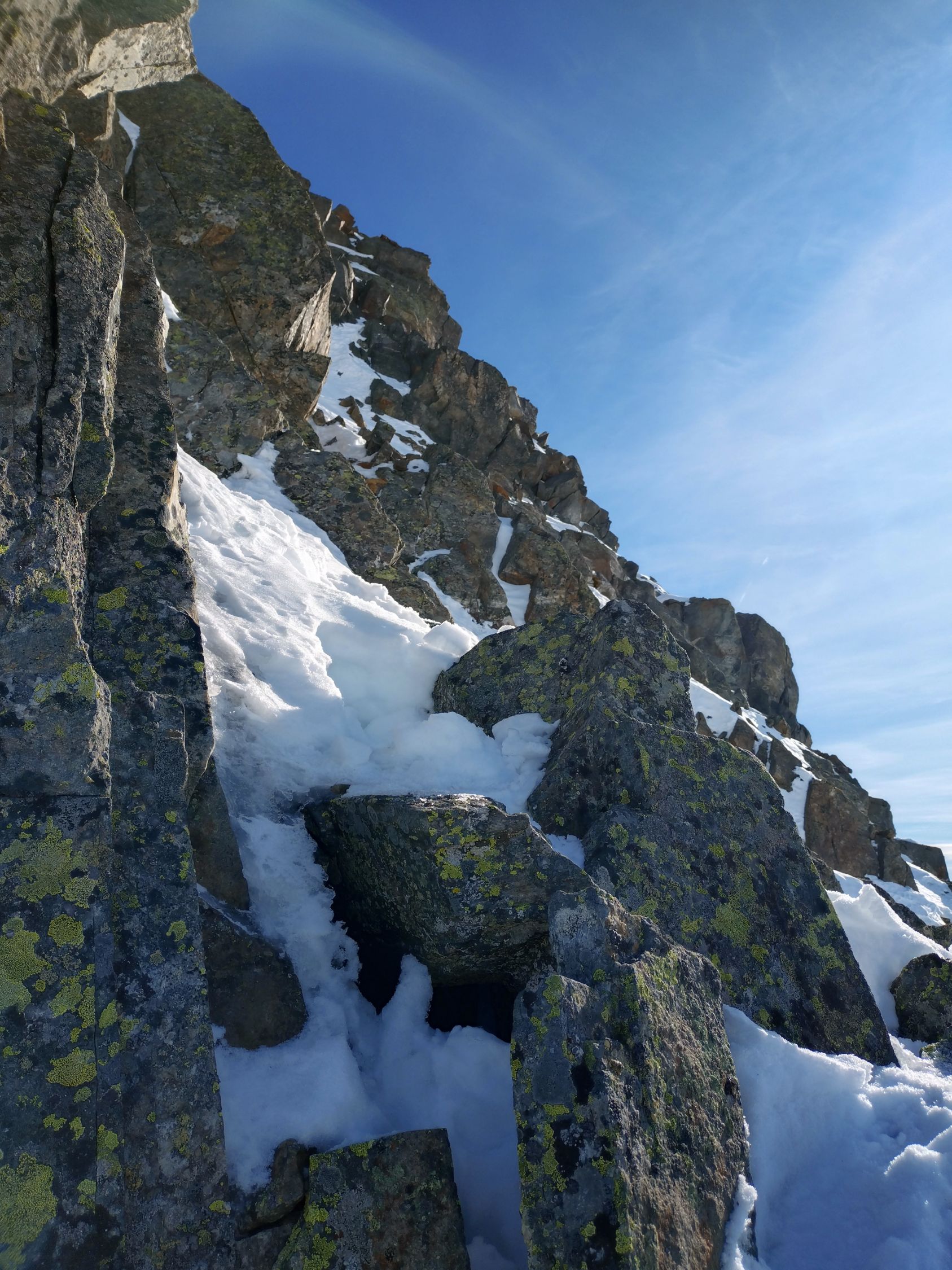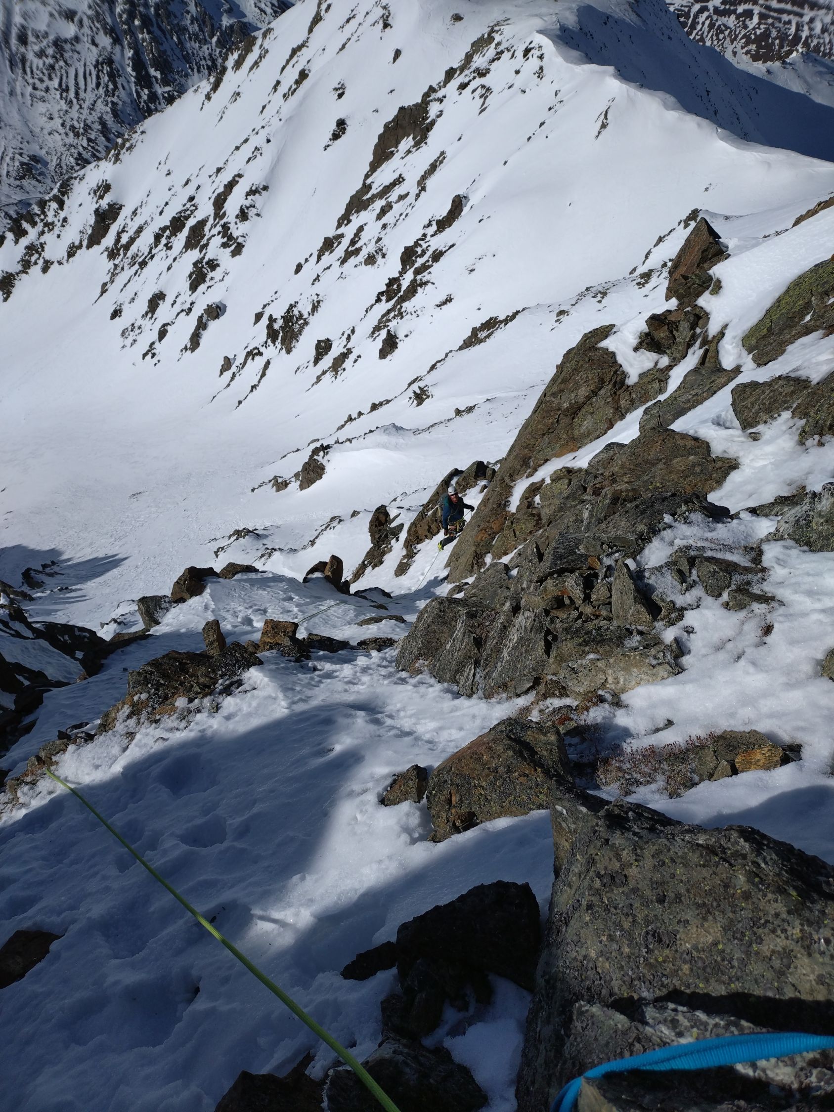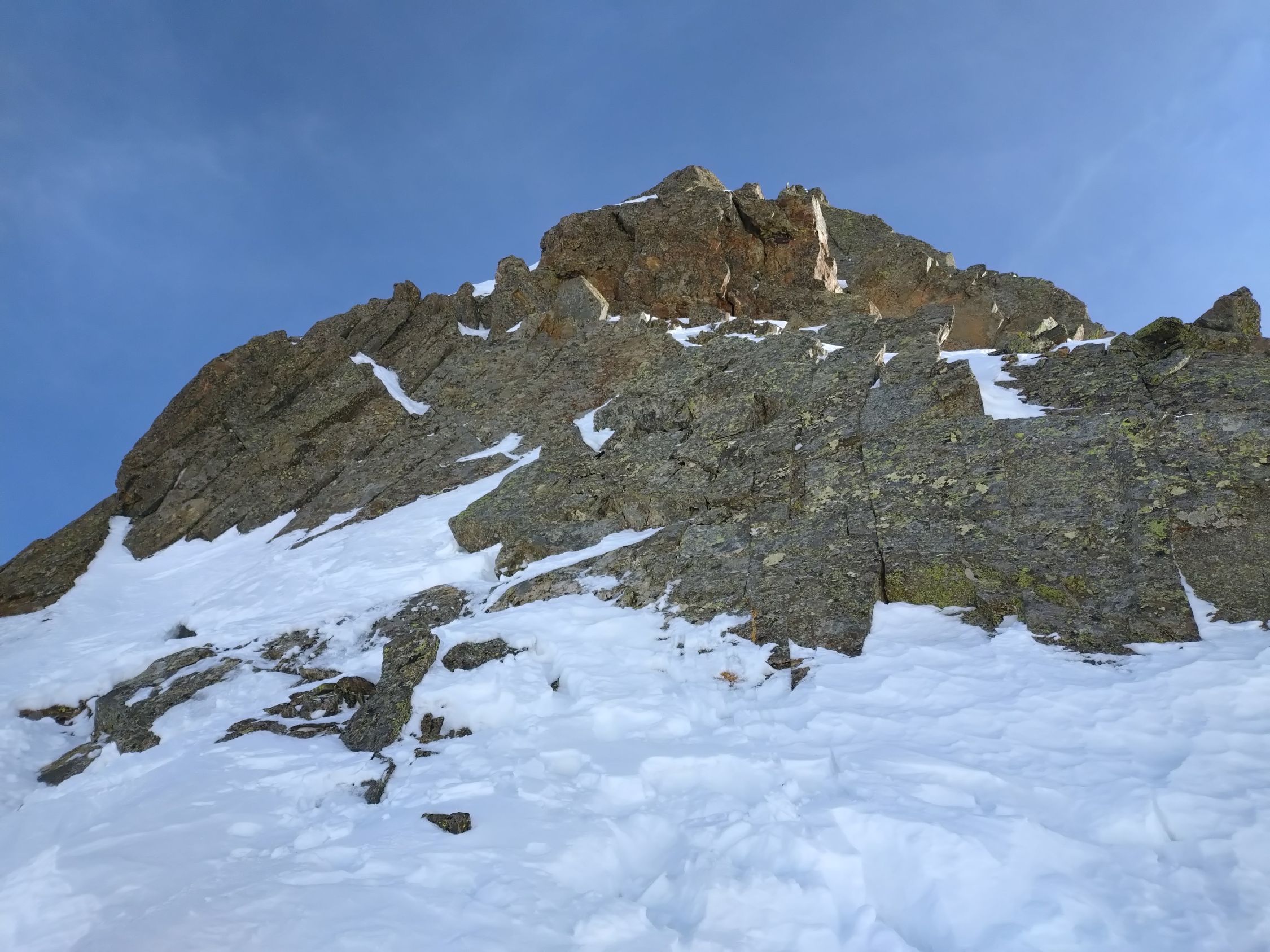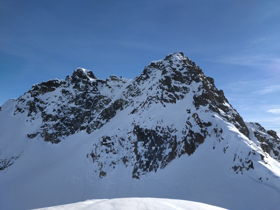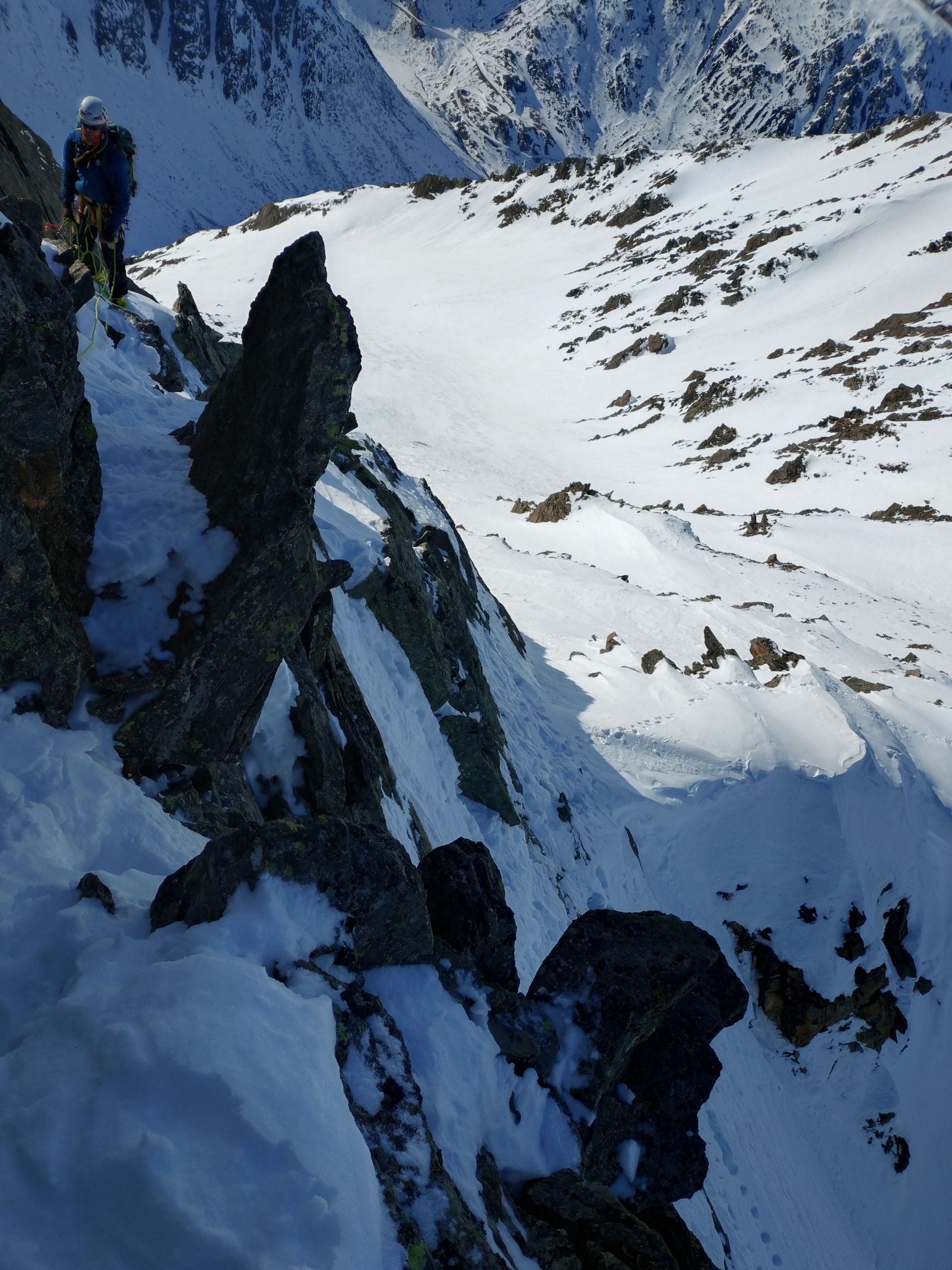 Bis zum Skidepot im Sattel zwischen Pt. 2883 und Chastelhorn problemlose Verhältnisse. Ob der Fussaufstieg überhaupt möglich ist, wussten wir nicht - probieren war das Motto. Einträge fand man bisher im Internet keine. Gemäss altem SAC-Führer solls WS, 2+ und brüchig sein. Nun denn, brüchig war kein Problem, das meiste ist gut zusammengefroren oder mit Schnee bedeckt. Aber den Gipfel gibts nicht geschenkt. Die Plattenzone im Bereich wo der Grat beginnt steiler zu werden hat uns extrem Zeit gekostet. Es sind nur 15 m, aber ich habs an 4 Orten versuchen müssen, bis ich sie irgendwo überwinden konnte. Von weitem siehts aus, als ob man hier einfach kurz steil über Schnee und etwas Fels hochsteigen kann. Aus der Nähe ists dann aber so, dass die Steigeisen bei den aktuellen Verhältnissen immer durch die komplette Schneedecke auf die darunterliegende Platte kommen und sich das ganze dementsprechend eierig anfühlt. Vielleicht wirds etwas besser, falls sich unsere Spuren nun verfestigen. Danach in kombiniertem Gelände meist steil bergauf. Seilsicherung empfehlenswert.