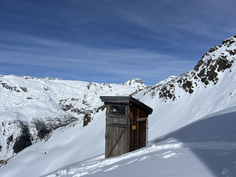 Der Eingang zur Hütte ist tief eingeschneit - der Zutritt würde grösseren Grabaufwand bedingen (keine Schaufel vor Ort).