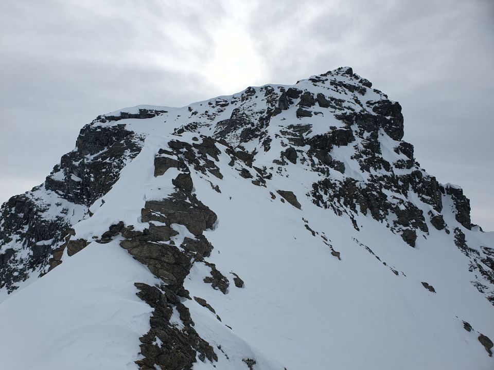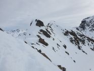 Die Schneeverhältnisse für eine Nordabfahrt, so wie gestern, sollten besser sein als auf der Aufstiegsroute bei Hartschnee abzufahren. Auf dem Nordwestgrat vom Sattelhorn habe ich Trittspuren und davor eine kleine Gruppe von 4 Leuten dort entlang laufen gesehen.