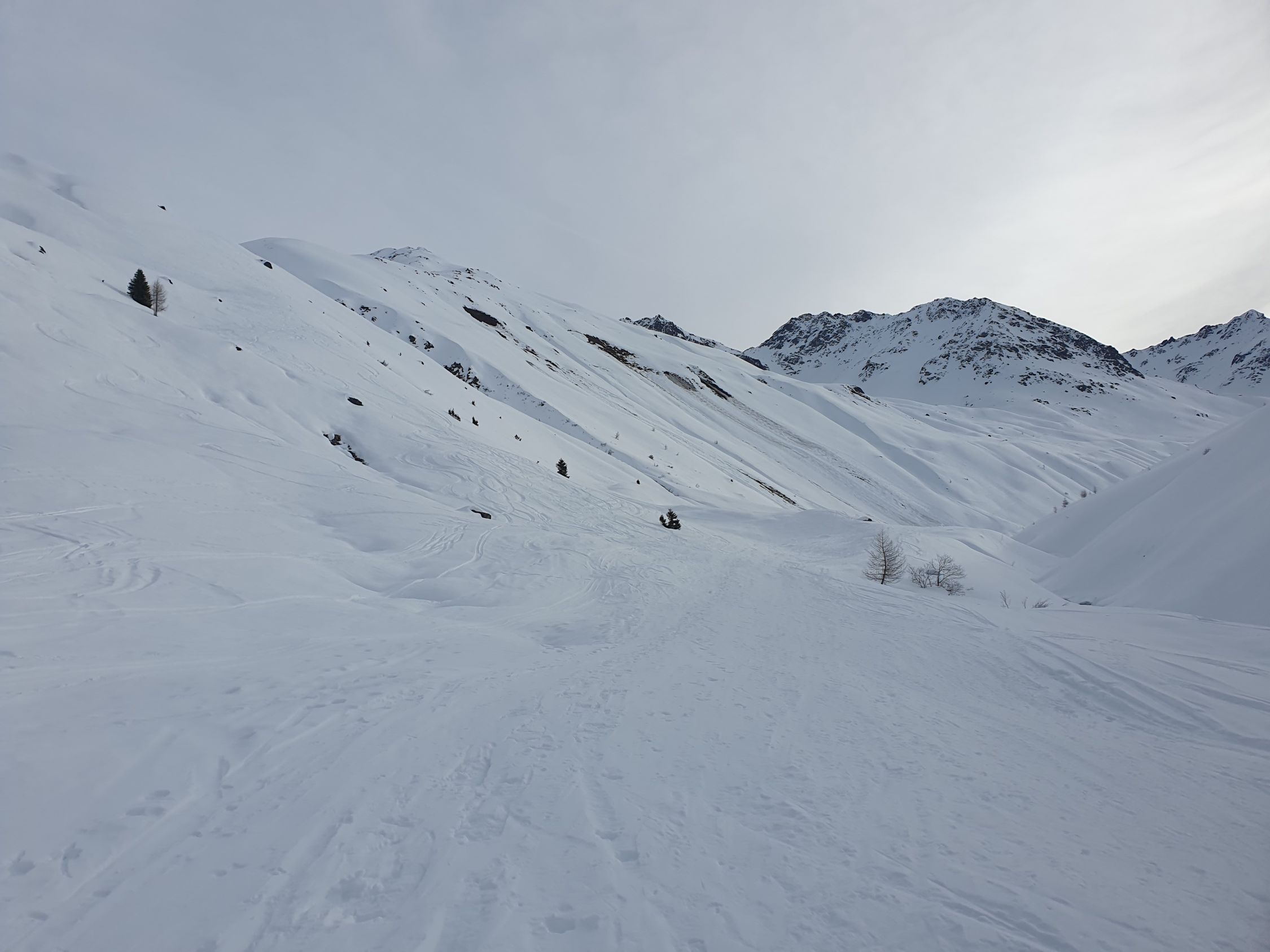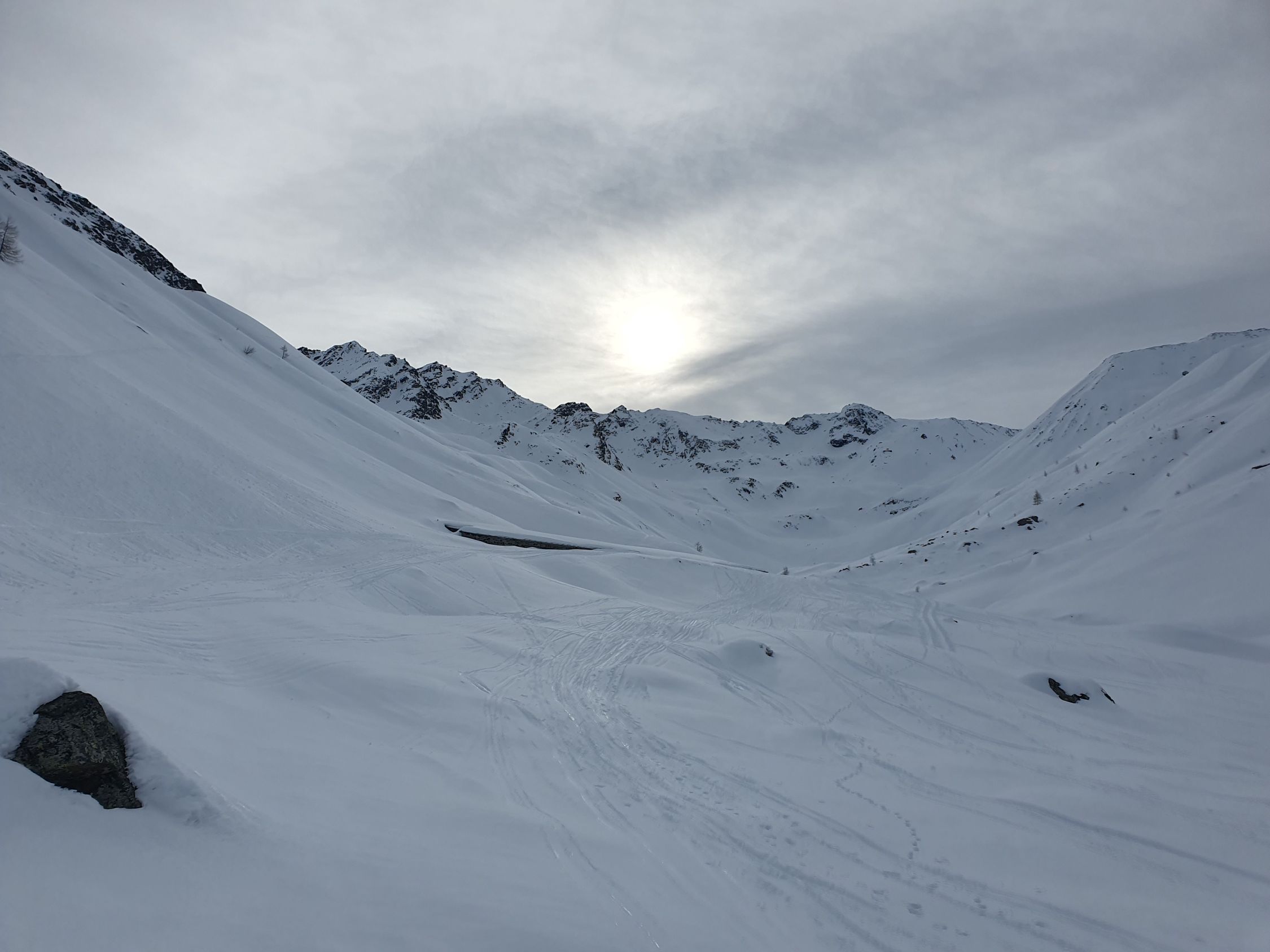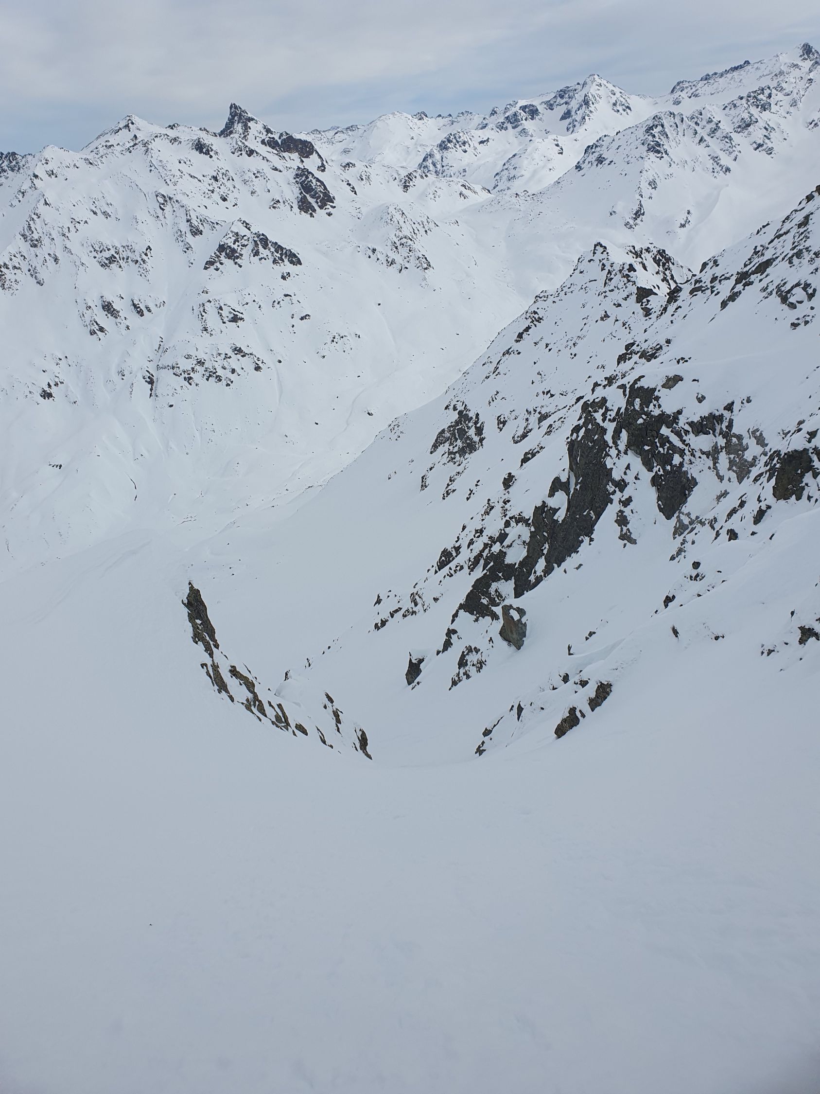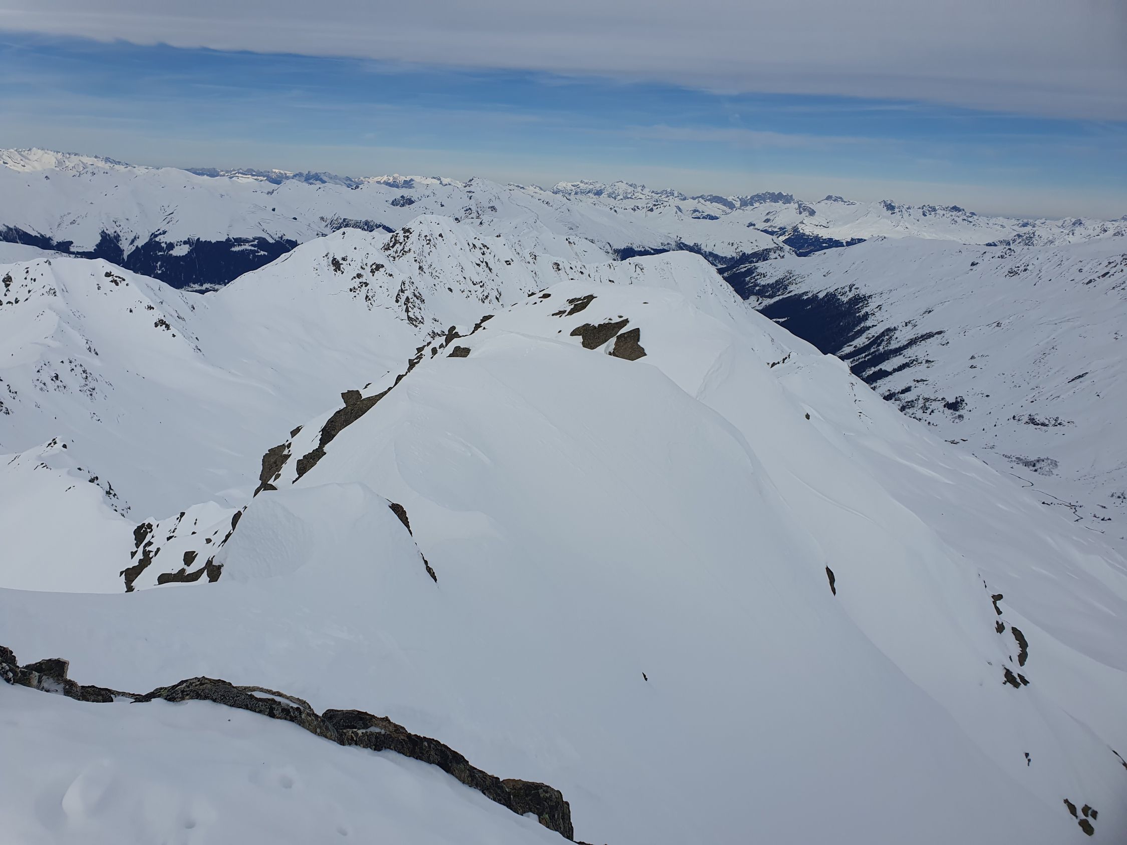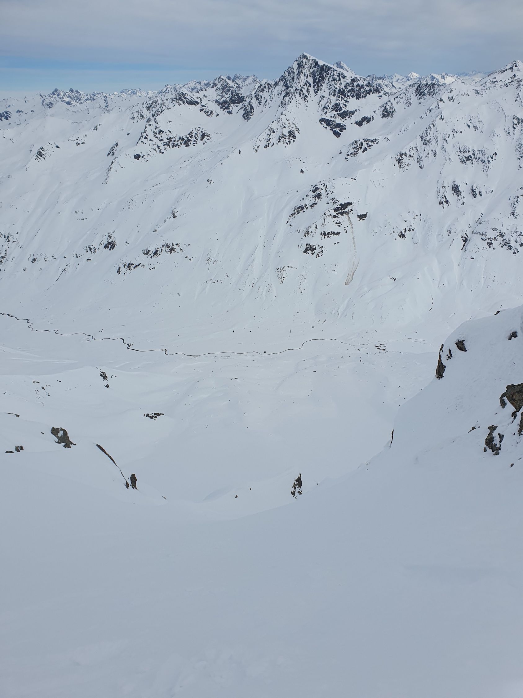 Da ich Neues liebe, bin ich der Gruppe auf dem Nordwestgrat des Sattelhorns gefolgt. Kurz nach dem Sattelhorn muss eine kleine Stufe hinabgestiegen werden und dort aufgrund der Steilheit zu Fuss ein steiles Gelände überquert werden, Kurz danach kann man wieder hoch zum Grat aufgestiegen werden. Trotz Hartschnee und guten Trittspuren der Gruppe ist dies ohne Steigeisen und Pickel möglich. Auf dem Nordwestgrat ist es möglich einen Couloir abzufahren (bis 40°), der danach rechts in einem neuen Couloir via Chummertälli ins Dischmatal mündet. Guter Pulver in beiden Couloirs, danach meist Pulver, aber leider auch manchmal eine harte Schicht obendrauf. Die Abfahrt ab Leidhorn gestern hatte jedenfalls deutlich besseren Pulver auf der ganzen Abfahrtsstrecke.