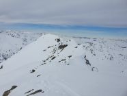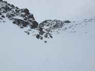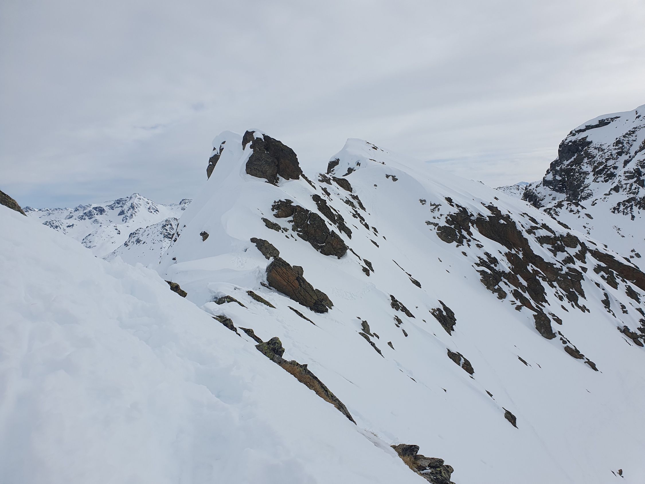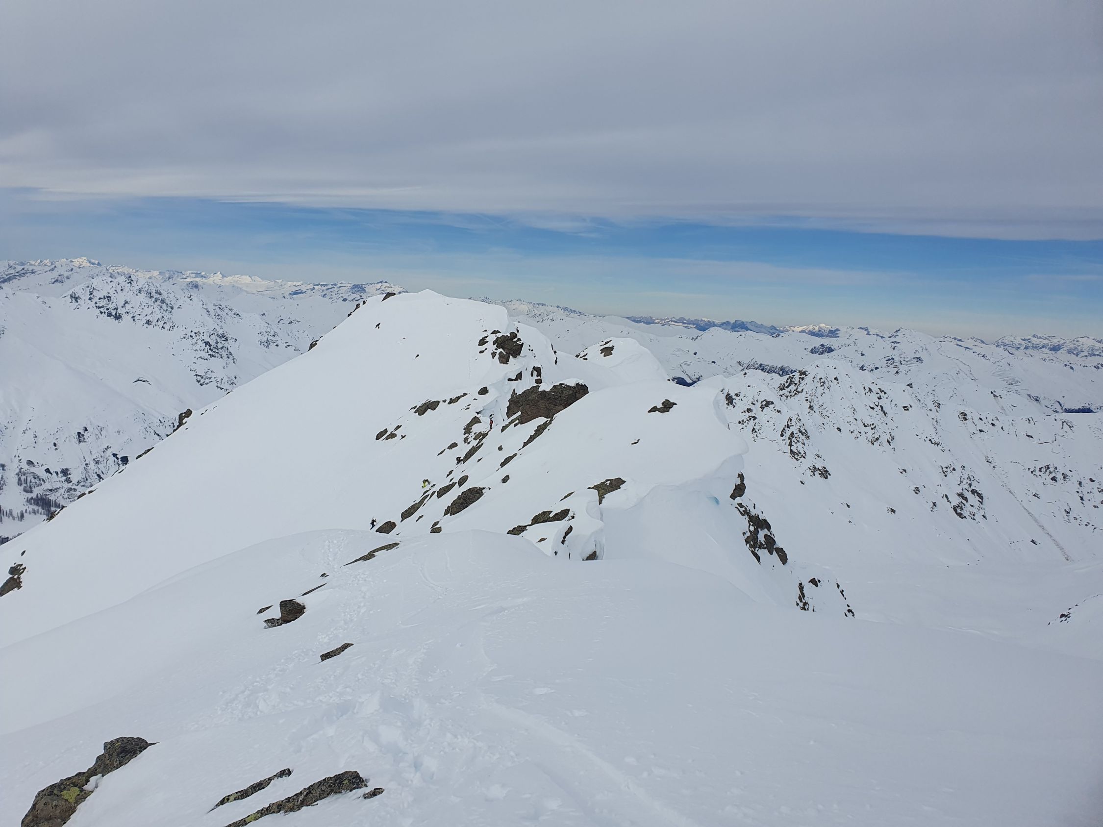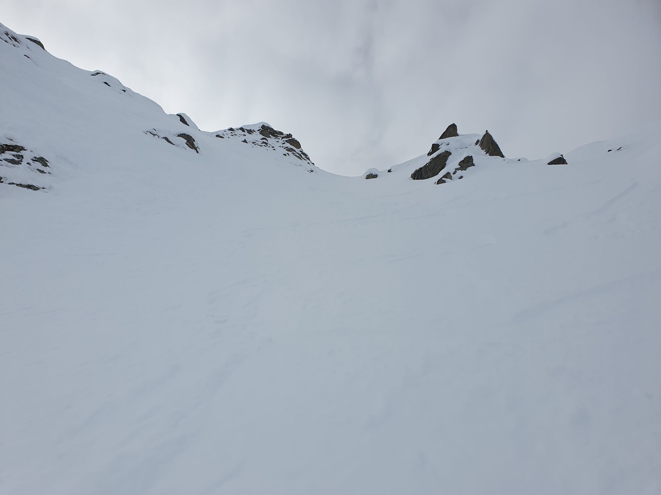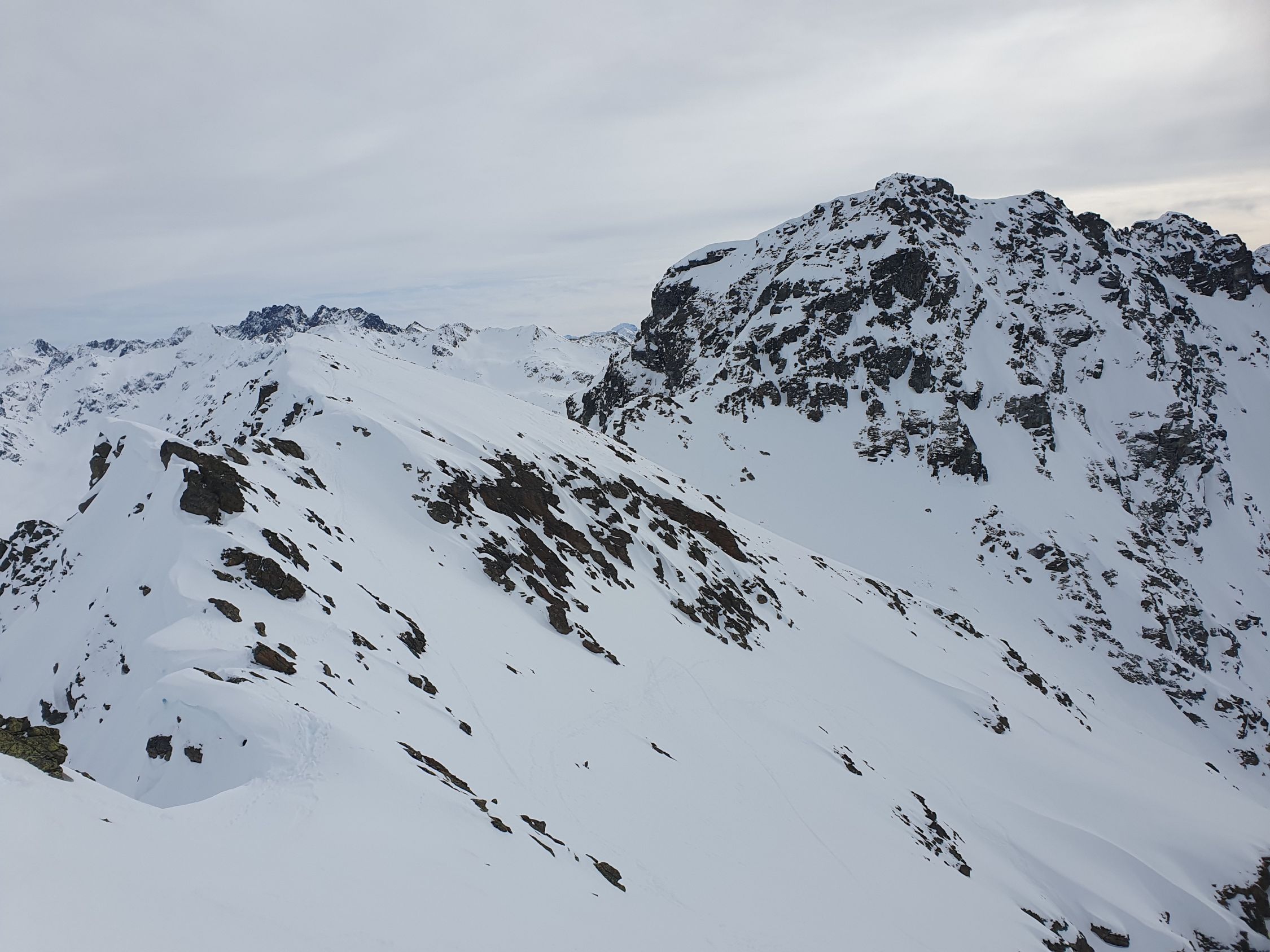 Da ich Neues liebe, bin ich der Gruppe auf dem Nordwestgrat des Sattelhorns gefolgt. Kurz nach dem Sattelhorn muss eine kleine Stufe hinabgestiegen werden und dort aufgrund der Steilheit zu Fuss ein steiles Gelände überquert werden, Kurz danach kann man wieder hoch zum Grat aufgestiegen werden. Trotz Hartschnee und guten Trittspuren der Gruppe ist dies ohne Steigeisen und Pickel möglich. Auf dem Nordwestgrat ist es möglich einen Couloir abzufahren (bis 40°), der danach rechts in einem neuen Couloir via Chummertälli ins Dischmatal mündet. Guter Pulver in beiden Couloirs, danach meist Pulver, aber leider auch manchmal eine harte Schicht obendrauf. Die Abfahrt ab Leidhorn gestern hatte jedenfalls deutlich besseren Pulver auf der ganzen Abfahrtsstrecke.