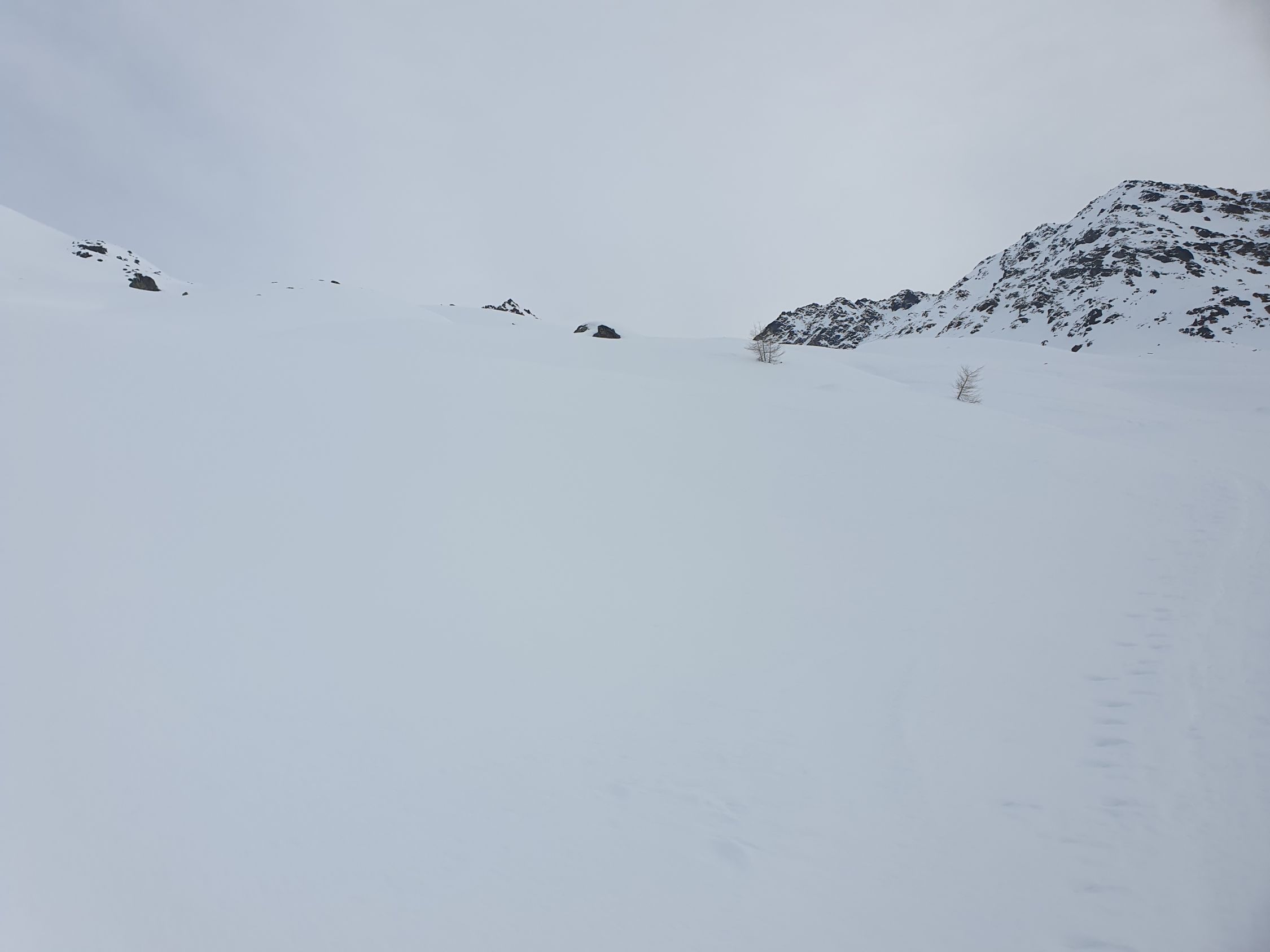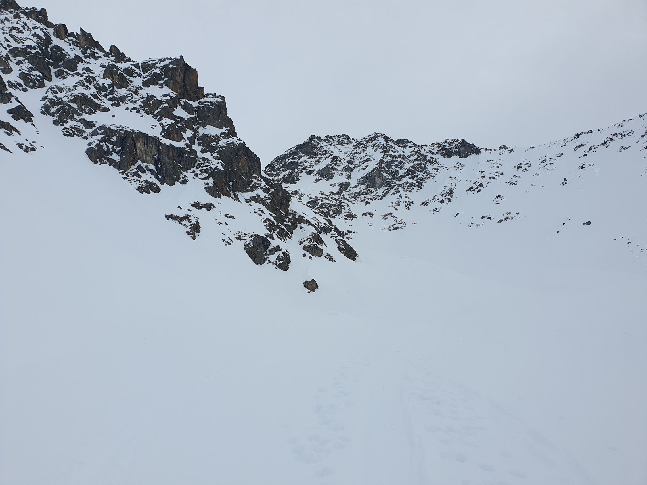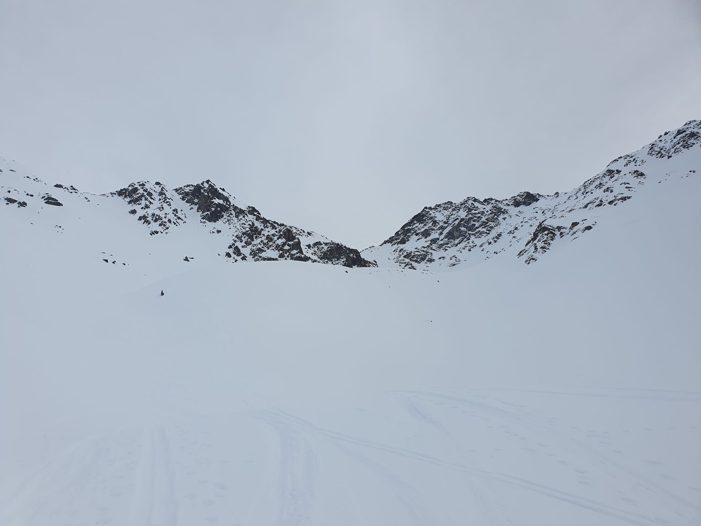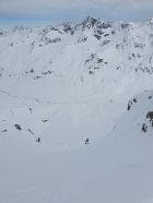 Auf der Piste rein ins Chüealptal bis bei P2100. Ab hier hat es zwei Spuren in östlicher Richtung hoch zum Plattentälli. Die Spuren auf der ersten Steilstufe ab P2100 waren glasig (Harscheisen wären von Vorteil gewesen), ab ca. 2400hm immer besser werdende Spuren mit leichtem Pulver oben drauf bis zum Sattel (P2921). Auch die steile Rinne (bis 35°) kurz vor dem Sattel war heute problemlos mit Skis zu bewältigen. Ab hier die letzten Höhenmeter mit Hartschnee und sehr rutschig bis zum Sattelhorn (Harscheisen wären auch hier gut gewesen).