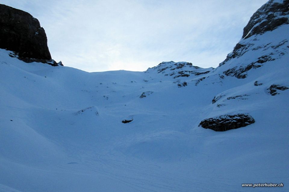 Abfahrt: Meist hart, überall gut tragend, in einigen Mulden auch etwas Pulverschnee. Es hat schon viele alte Spuren.