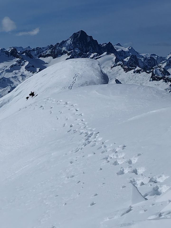 Aufstieg von Realp alles ohne Harscheisen möglich. Kurzer Fussaufstieg zum Rottälihorn. Von dort kurze Abfahrt und Traversierung zum Leckipass. Die wenigen Meter unterhalb vom Leckipass machte ich zu Fuss(wer weiss wie oft der Fellwechsel gut geht). Von dort kurze Abfahrt am besten ganz links halten um wenige Höhenmeter zur Muttenlücke zu verlieren. Danach Aufstieg entweder mit Ski oder zu Fuss zum Saaspass. Ich bin zu Fuss hoch da der Schnee gut trug und ich auch keine Lust hatte für die kurze Distanz aufzufellen. Der Aufstieg ab Skidepot zum Gipfel war noch ohne Spur. Es ging mit Pickel und Steigeisen hoch. Das spuren war ohne grosse Anstrengung machbar. Mein einziges Augenmerk war, dass ich genug Abstand zu den Wechten hatte. Die Wechten luden einen regelrecht ein auf denen zu laufen, da sie nicht schräg abfallend waren. Also Vorsicht und lieber unbequem am abfallenden Grat hochsteigen. Zurück ging es über Leckipass Abstecher Stellibodenhorn um die 2000hm voll zu machen. Es waren alle Schneearten bei der Abfahrt anzutreffen.