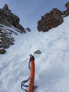 Das kurze Couloir auf den Spitzmeilen ist sehr steil aber gut ausgestapft. Weil alle Tritte vereist sind, ist ein Pickel notwendig.