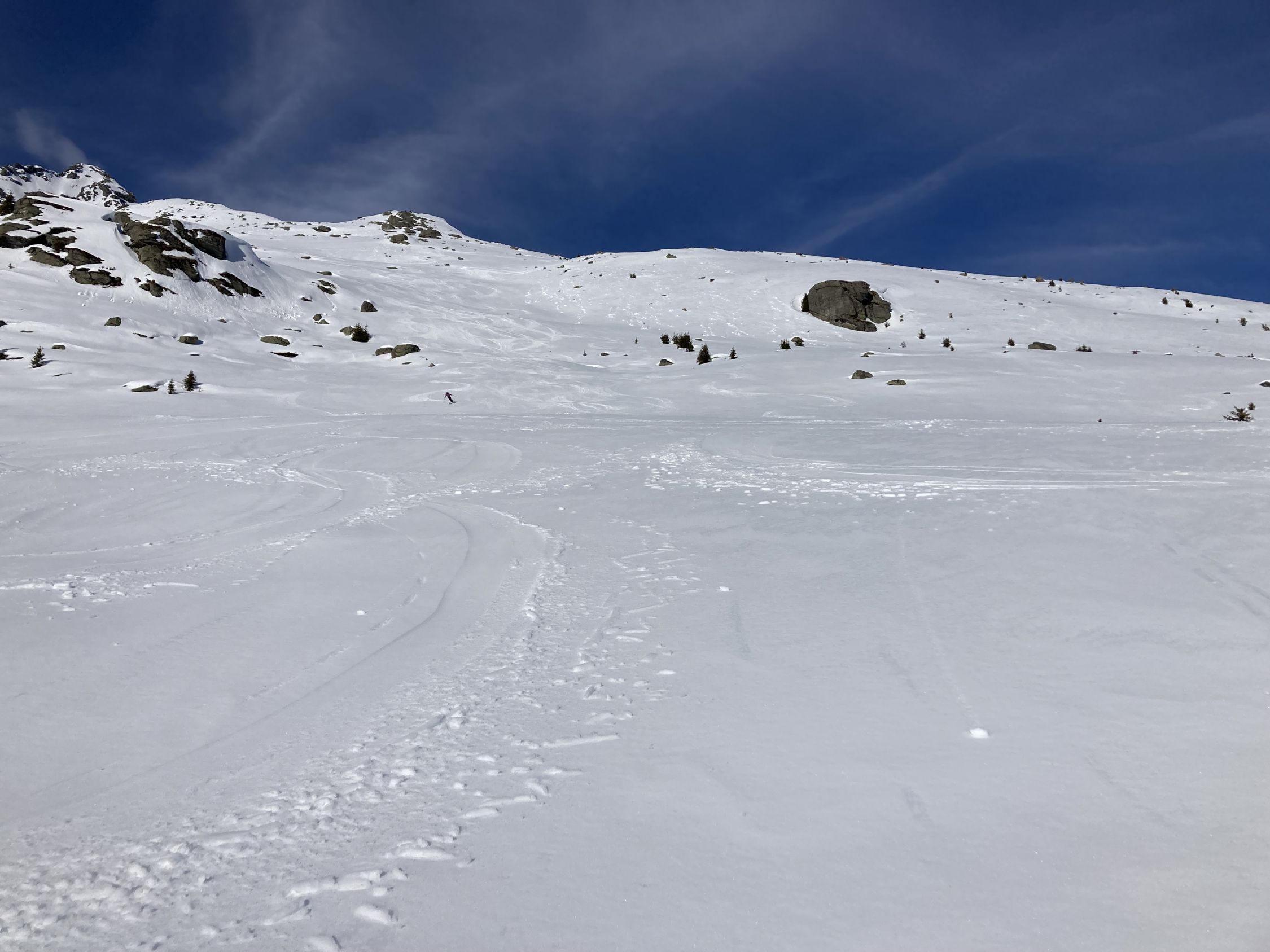 Für den Aufstieg von Brigels auf dem Forstweg noch ausreichend Schnee. Im Val Miez und in den Hängen Richtung Tschegn Dadens schöne Sulzverhältnisse. Der obere Gipfelhang sehr vom Wind gezeichnet.