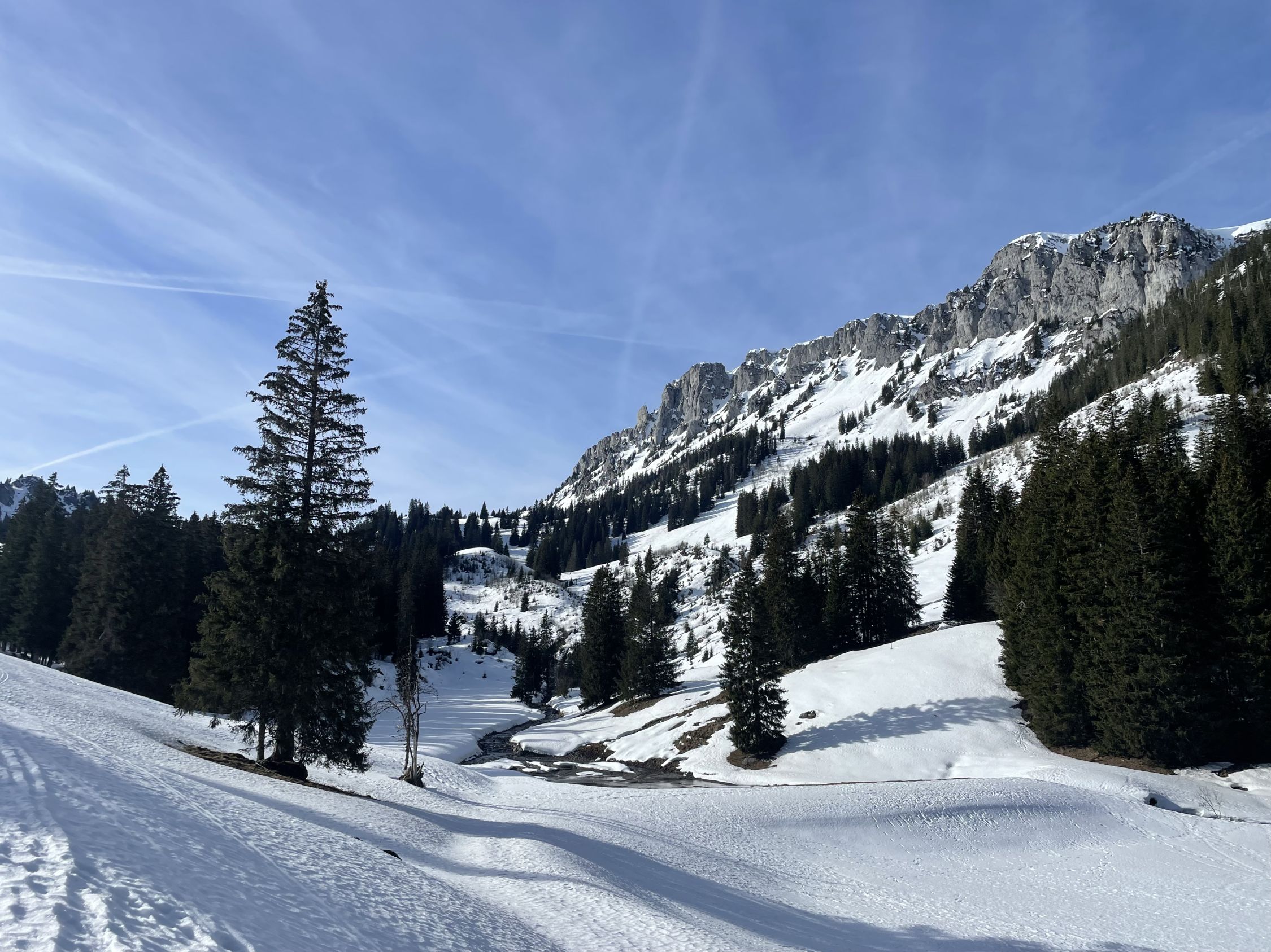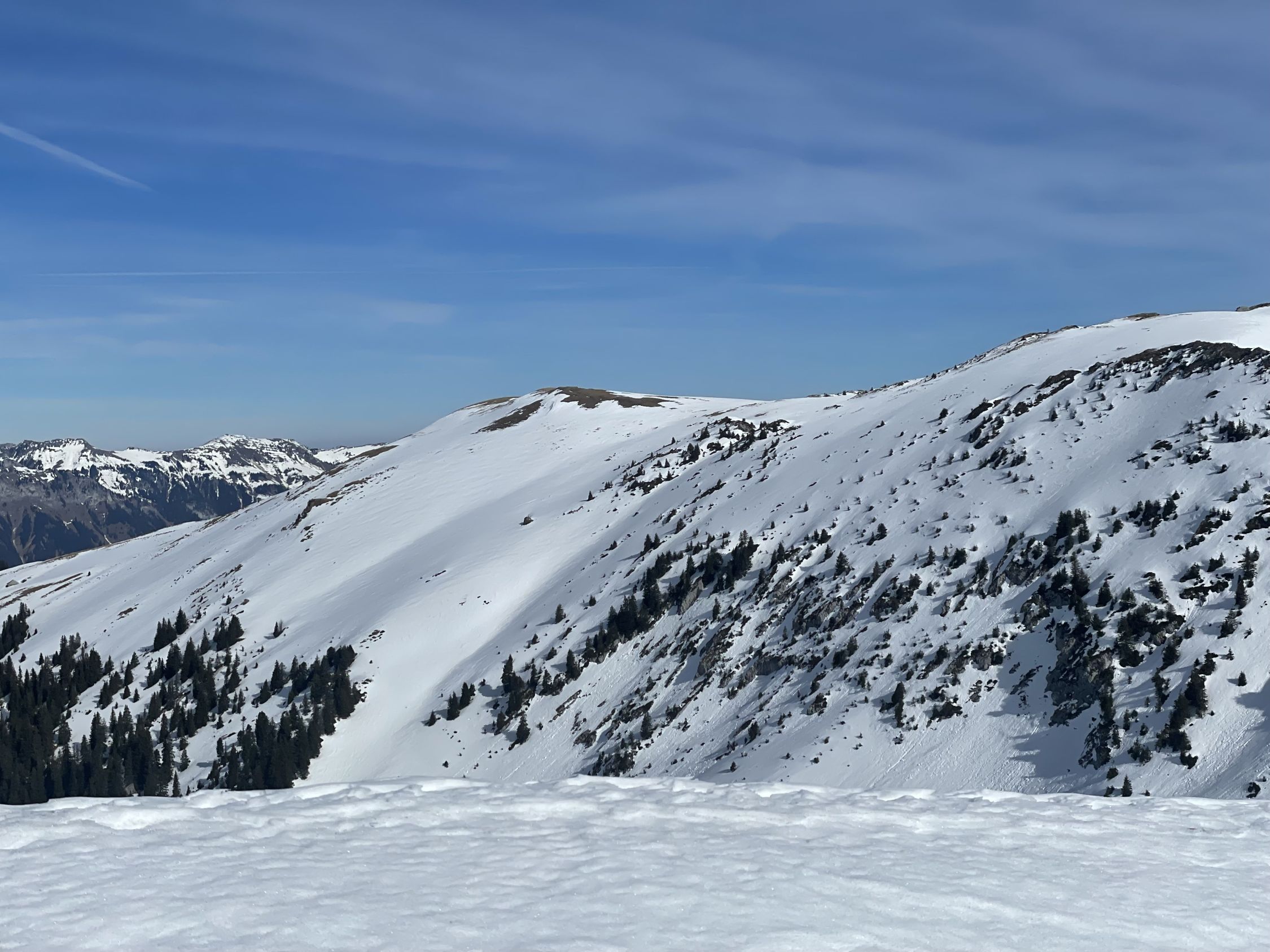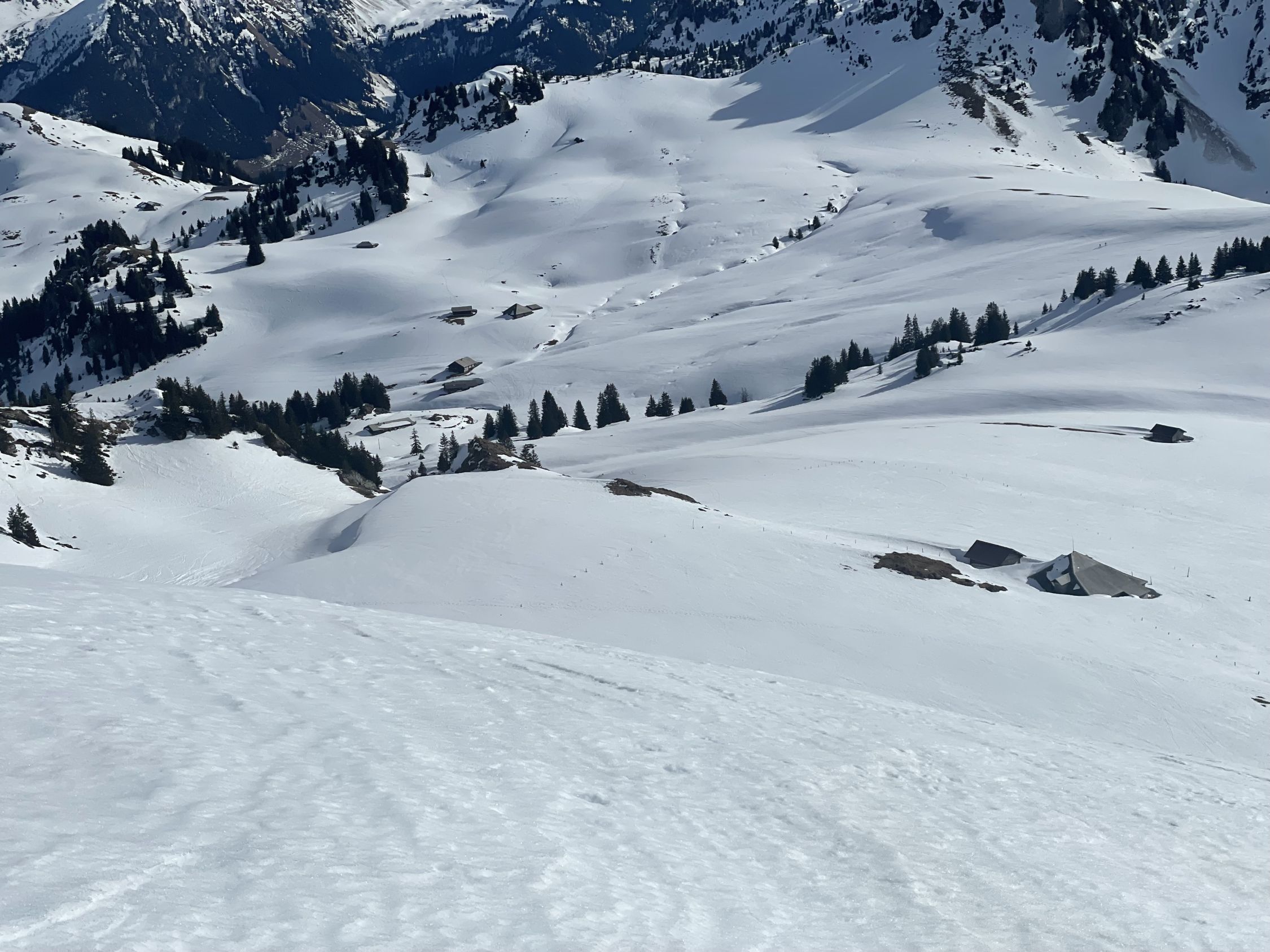 Das ausgezeichnet bezieht sich auf das Wetter (schön, 5 Grad) und den Genuss, an einem hundskommunen Dienstag eine schöne Tour unternehmen zu können. Ich zielte auf den Lueglespitz, weil ich annahm, hier schöne Firnverhältnisse anzutreffen. Aufstieg ab PP Meniggrund erst kurz zu Fuss, dann mit kurzen Lücken, die man übersteigen konnte, mit Skis. Ab Brätliplatz genügend Schnee, ab dem Brüggli 1600 reichlich. Ab 1700 MüM ein cm Pulver auf Unterlage, ich wusste kurz nicht, ob Nordhänge doch besser wären. Entschloss mich dagegen und blieb beim Plan. Am Gipfel Lueglespitz imposante Wächte mit Anriss, Vorsicht. Abfahrt effektiv bis Obergestele schön aufgefirnt, eigentlich sehr gut bis Brüggli. Danach die Strasse bis Brätliplatz, hart-schepprig. Ab Brätliplatz dann schlecht, Strasse unfahrbahr, weil ein paar Lustige mit dem Auto hoch wollten (Spurrillen) und die Abkürzung im Gelände teils vereist. Danach bin ich dem Sommerweg nach noch fast bis zum PP gefahren. Schlussteil machbar, aber über alles gesehen doch dunkelgrün heute.