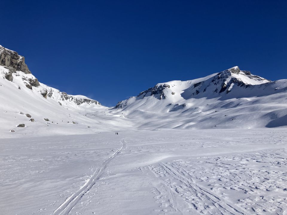 Der Schnee entlang der Aufstiegsroute ist hart und vom Wind gezeichnet. Die Schneebedingungen auf der Abfahrt von der Fuorcla Raschaglius nach Bargis sind besser, in den beiden Steilstufen hat es jedoch auch eine harte Schneedecke. Im unteren Talboden sind mehrere Lawinenkegel zu queren.