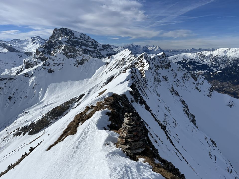 Geplant war der steile Aufstieg über Prattels. Er sah aber so schneearm aus, dass der Weg via Golitsche angenehmer schien. Hier zu Fuss bis in den Pass, im oberen Teil gut tragender Schnee. Dann mit Schneeschuhen auf tragendem Deckel zum Howang. Wieder zu Fuss zum First, Drahtseile weitgehend frei. SE-Flanke um 11 Uhr leider noch gar nicht aufgeweicht. Querung nach Ryharts ziemlich problemlos, nur ein grösserer Lawinenkegel zu queren.