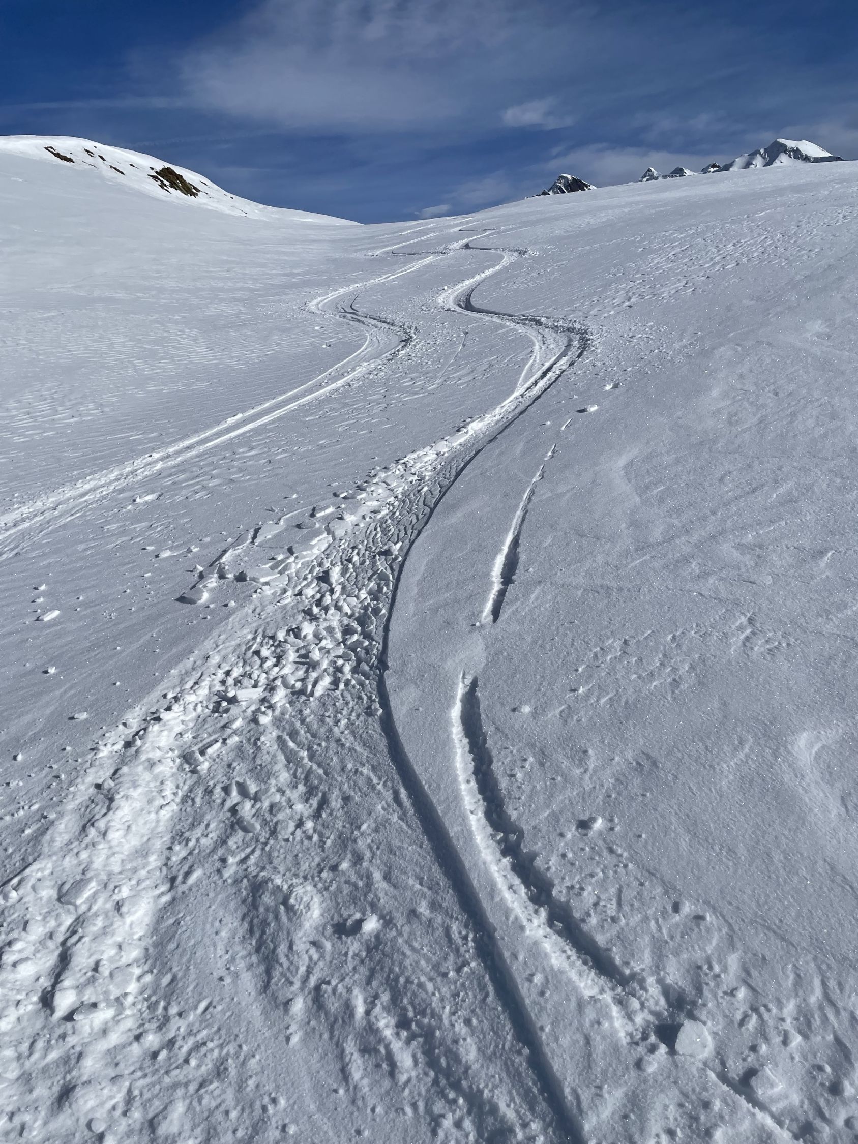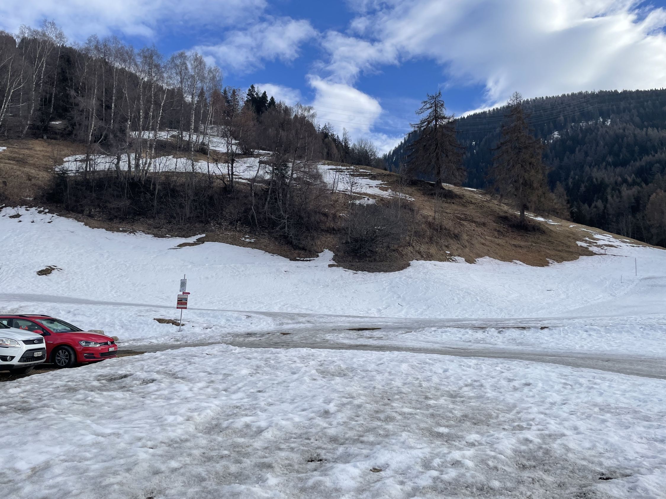 Der Reihe nach: vom Start ca 60m zuerst die Ski getragen und mehr links haltend als der Schneeschuhtrail. Danach gehts bis zur Kurve auf 1463 mit Ski. Da nicht klar war, ob die Strasse einigermassen schneebedeckt ist, sind wir bis 1700m zu Fuss über den Schneeschuhtrail, der meist aper war (aber Vorsicht bei vereisten Stellen). Ab 1700 dann wie eine normale Skitour bis auf 2300m. Oben wären die Verhältnisse mit der harten Unterlage optimal, um noch weiter über die Hochebene zu ziehen und in der Abfahrt schöne Linien zu zeichnen.