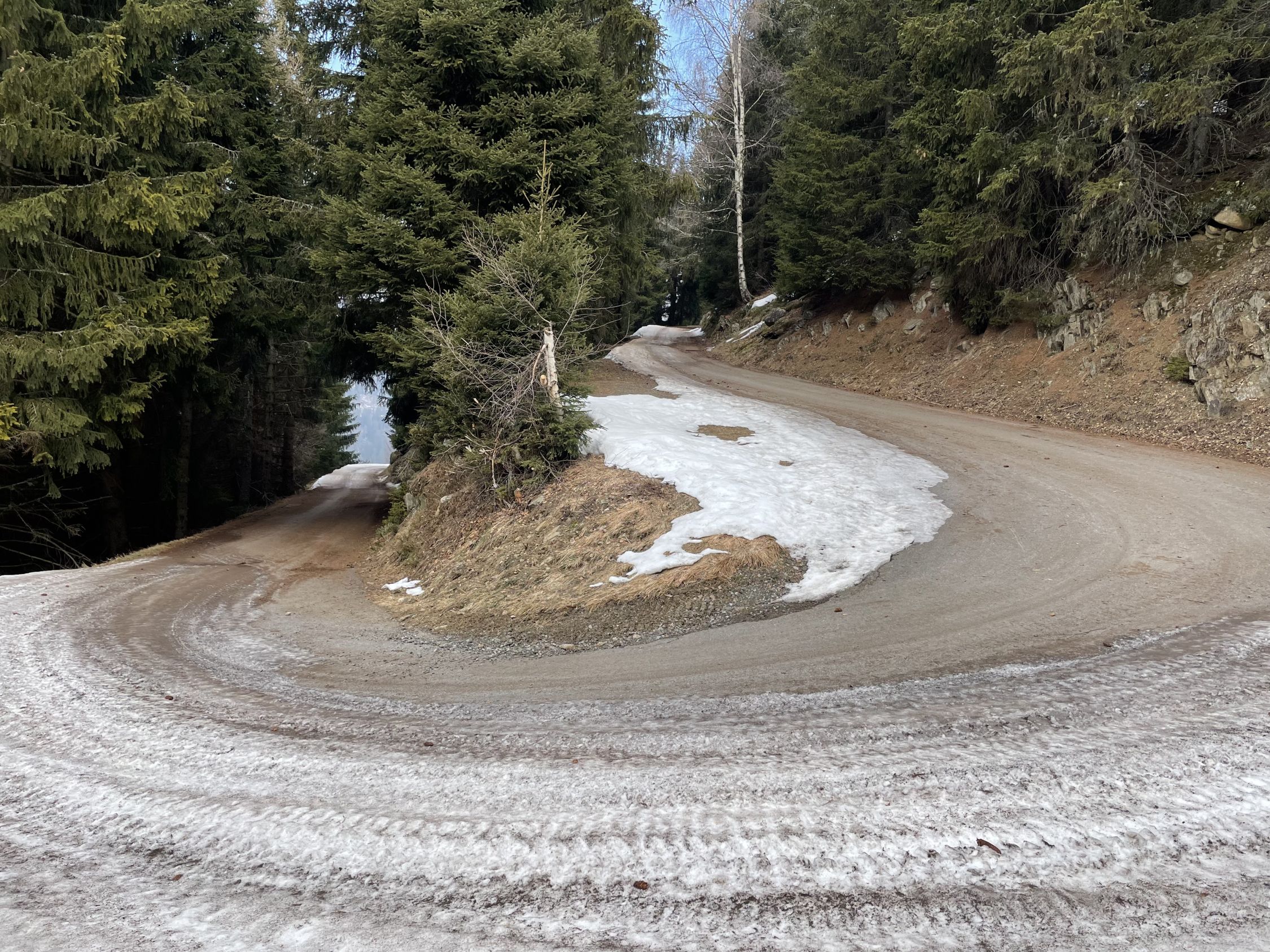 Leider war es heute recht lange wolkig, es blieb hart, kein aufsulzen, auch zuunterst nicht. Die Abfahrt ist zwischen 1700 und 1463 über die Strasse bei etwas Vorsicht ohne Kratzer machbar. Und eben, bis auf 50m Distanz und über zwei Grasmutten steigen ist alles fahrbar.