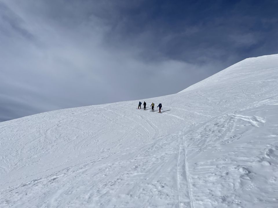 Schneeverhältnisse anfangs hart/verbunden/verblasen, in späteren Hängen teilweise mit Deckel der durchspurt werden kann, unter 2200 pistenähnliche Verhältnisse