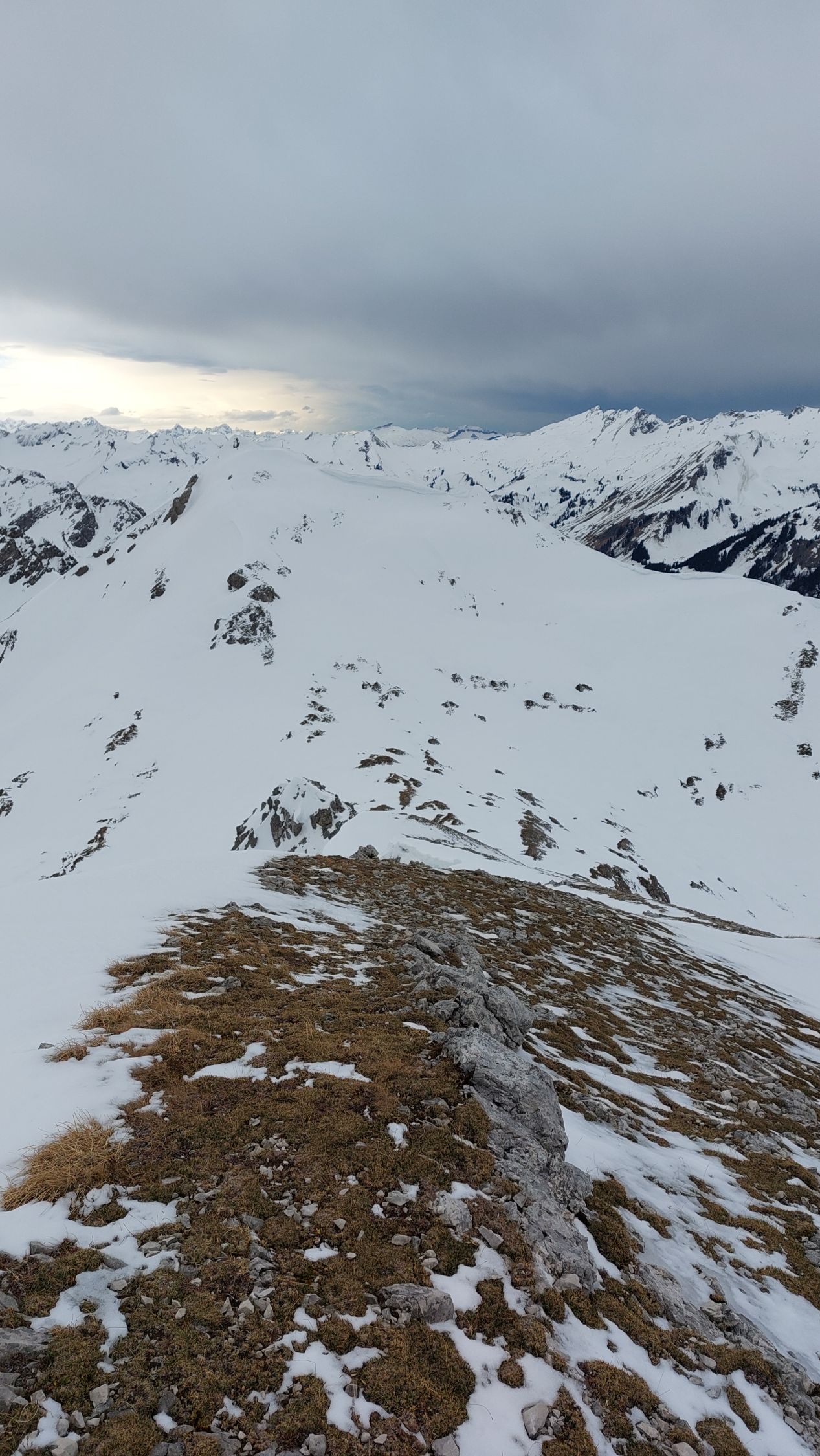 Solide Schneedecke in den frühen Morgenstunden. Grat ziemlich freigeblasen und mit etwas Kraxelei begehbar.