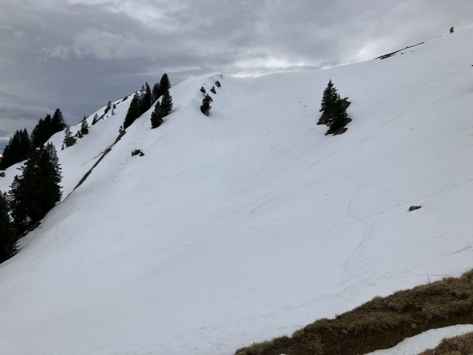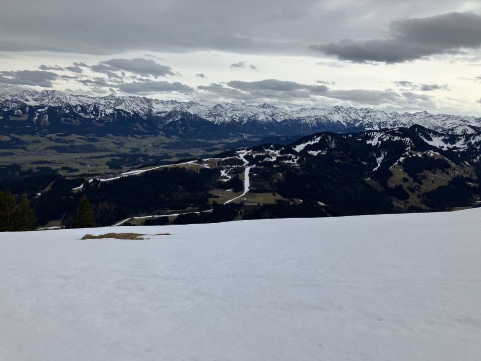 Natürlich bei der Schneelage (seufz) keine Skitour. Aber man weiß ja vorher, worauf man sich einlässt, daher die Figl mitgenommen. Mit dem Bio-Bike bis zur Schwand-Alp. Ab hier zu Fuß weiter, übers Bärenköpfle und den Sommerweg über die Leiter zum Steineberg. Dann 2x den Schlauch Richtung Grathöfle runter (Firn/Sulz), schließlich die ostseitige Skiabfahrt zurück Richtung Bärenköpfle. Ab Mittag Gipfelstation dann letzte tolle Abfahrt zurück zum Rad.