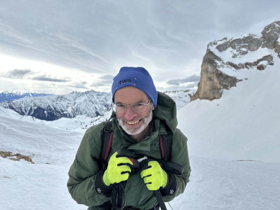 Vor uns liefen 6 Skitourengänger. Nach uns folgten 5 SS-Läufer und weitere Skitourengänger. Wir hatten vor, noch zum Vorderen Sonnwendjoch zu laufen , darum stiegen wir südseitig hinab zur Felsenschwelle, wo man sich rechts hält, um durch einen kurzen muldenförmigen Graben diese zu umgehen. Unterhalb einer Felswand stehen die 2 Hütten der Schermsteinalm (1855 m). Von hier steigt man südwärts in die 33° steile Westflanke vom Sonnwendjoch und folgt dem Sommerweg hinauf zum Issköpfl (1888 m), von wo man in das Inntal blickt. Den SW-Rücken „Auf der Iss“ umgeht man in linker Kurve, danach zickzackt man zu den südlichen Felsen vom Sonnwendjoch. Um nun zum SO-Rücken zu kommen, muss man einen kurzen, aber 50° steilen Hang queren. Zwar hatten wir die Steigeisen dabei, jedoch kein Eishandgerät zum Selbstsichern. Ohne dem erschien mir die Passage zu heikel. Darum drehten wir dort um. Am Issköpfl, später dann unterhalb der Schermsteinalm konnten wir eine Herde Gemsen beobachten (wurden so 11,5 km; 1035 Hm in 7¼ Std.).