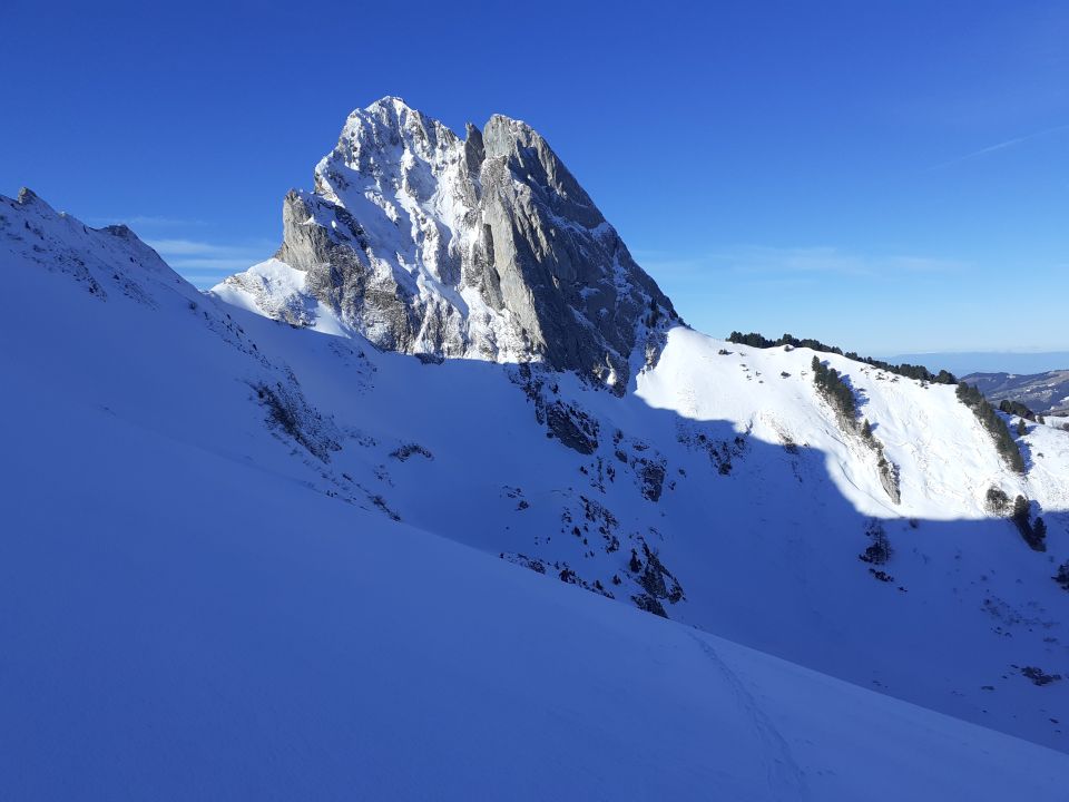 Eisig im Aufstieg (Harscheisen von Vorteil). Lohnende Abfahrt auf hartem Untergrund mit ca. 10cm Pulverauflage. Wir haben uns beim Abfahren in der Mulde gehalten, wo es am meisten Schnee hatte.