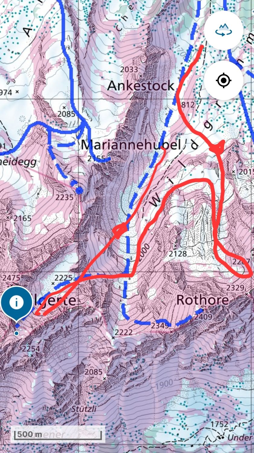Start um 11 bei -1Grad, bis 1500m mit dem Stahlhengst, dann zuerst in Richtig Chalberhöri unter den Rothorngipfel und danach noch zur Spillgerte.