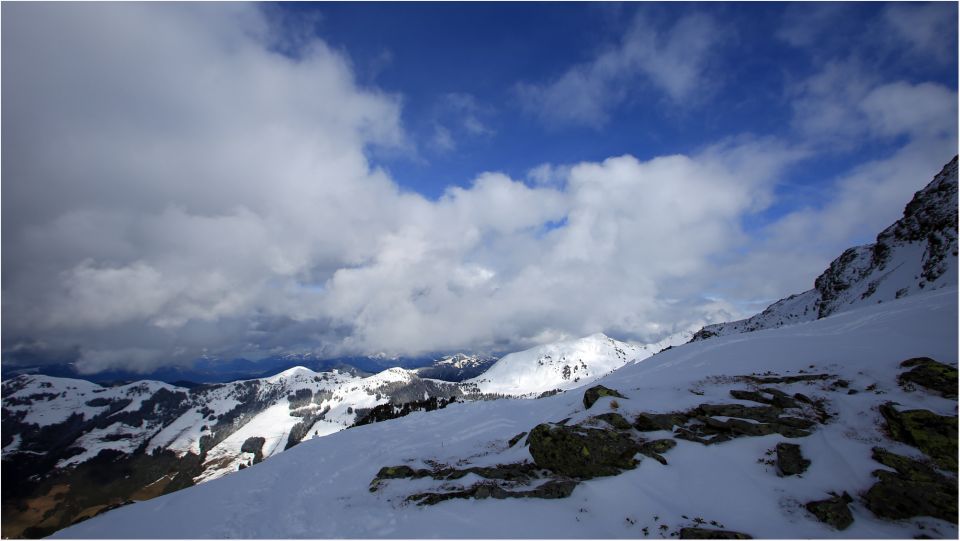 Blick in die Runde: Aktuell kann man überall noch bis runter fahren, es geht halt gerade noch so. Heute wenig Sonne, konnte sein, dass es morgen noch Pulverschnee gibt.