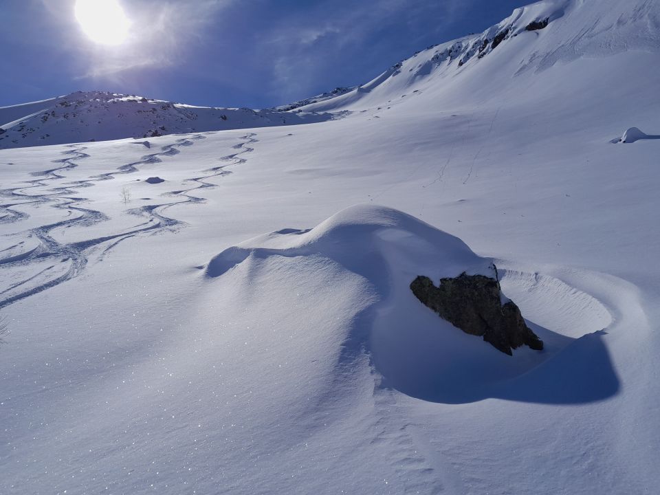 Perfekter Pulver auf harter Unterlage. Allerdings ist auf dem Gratrücken mit Steinkontakt zu rechnen.