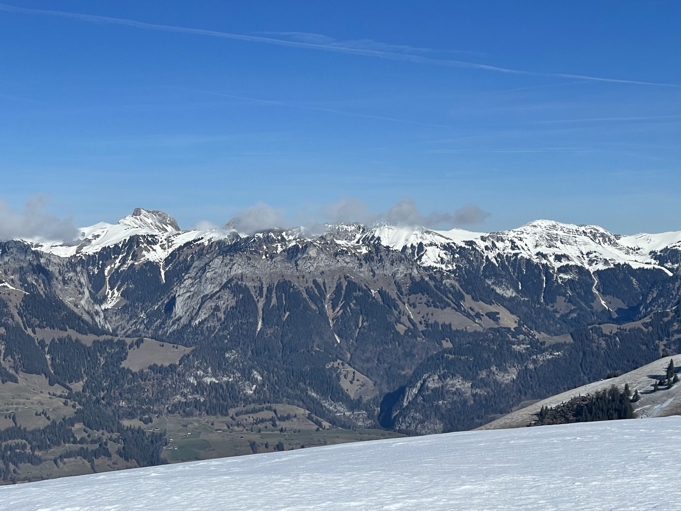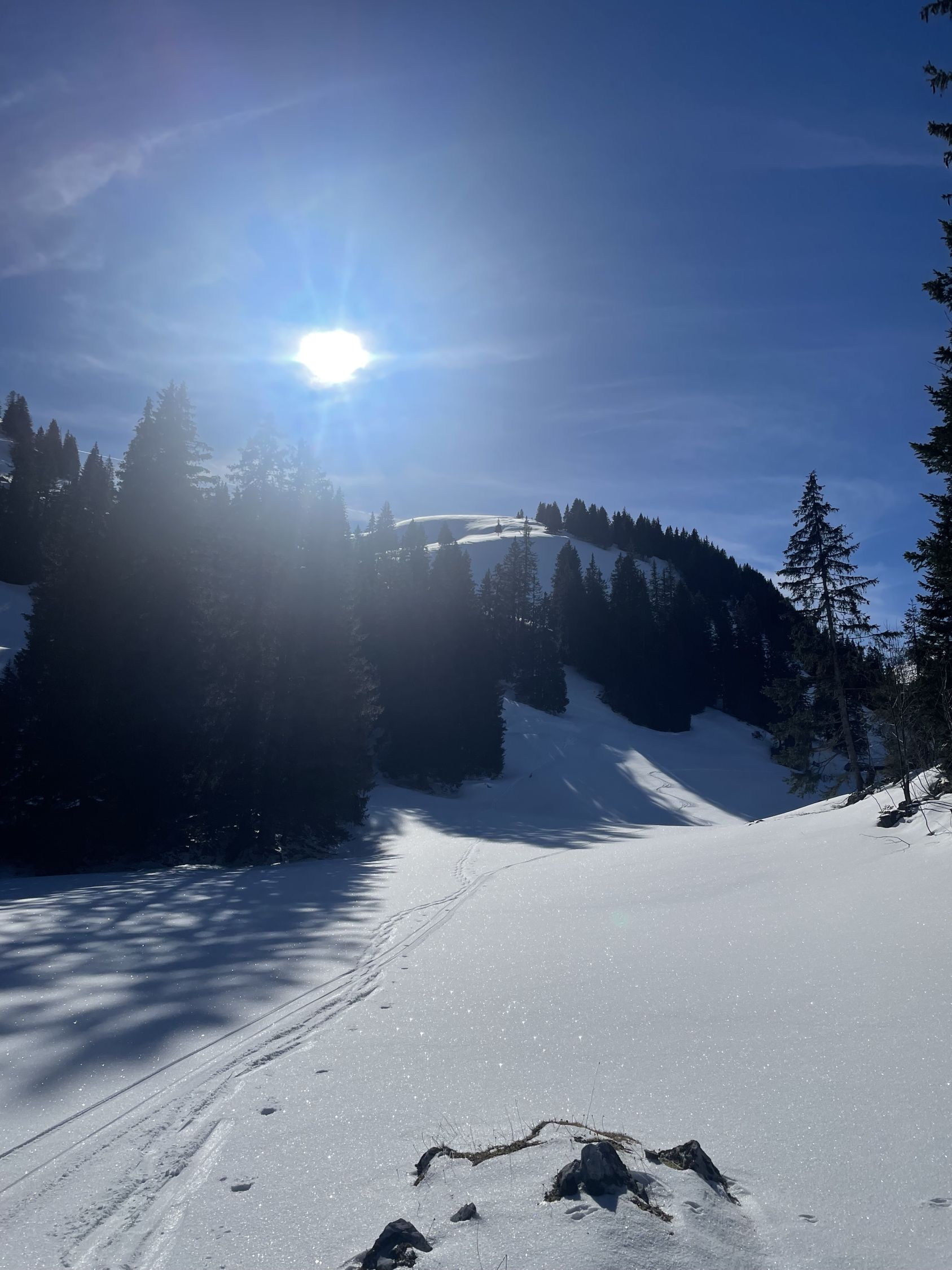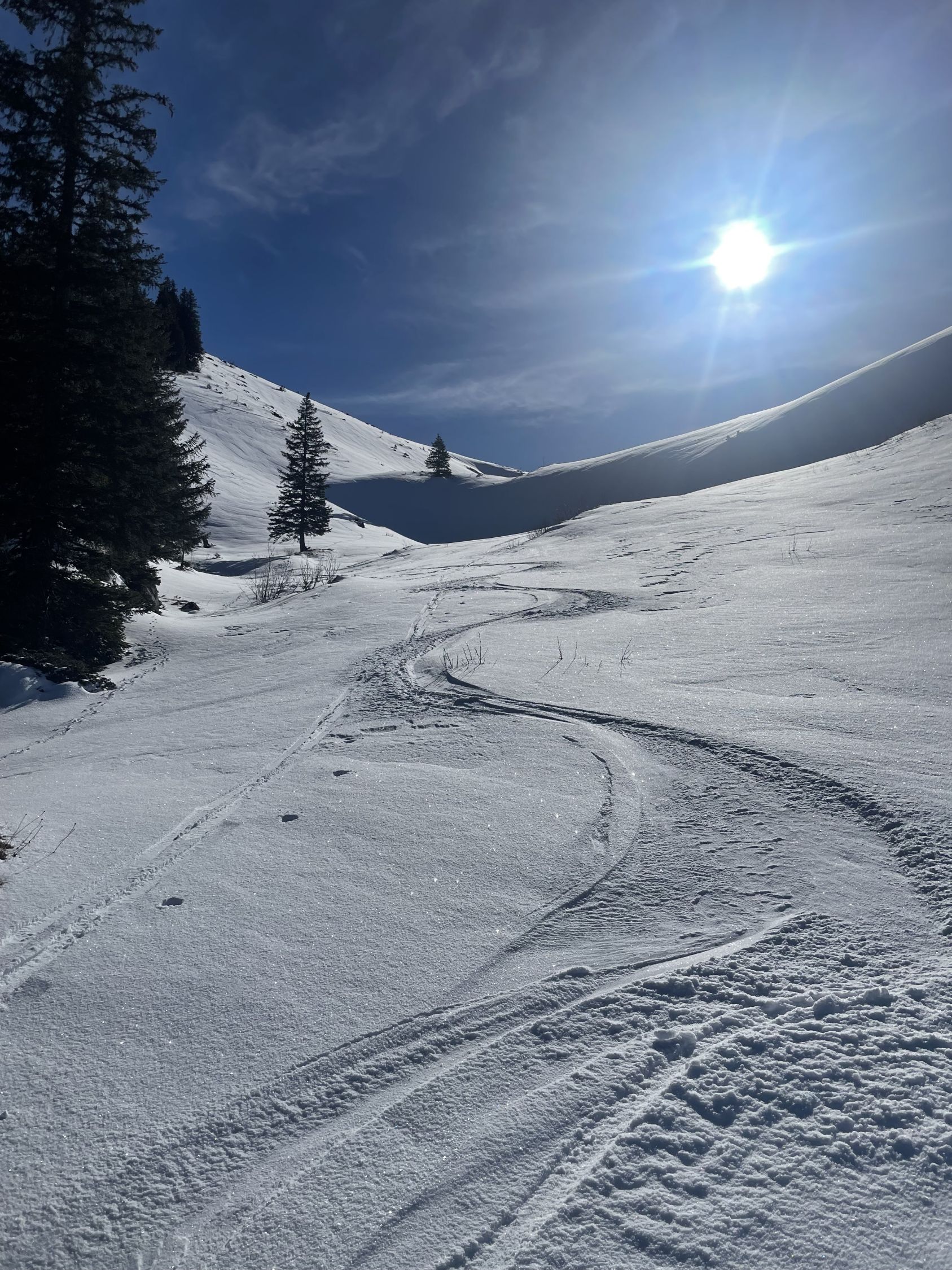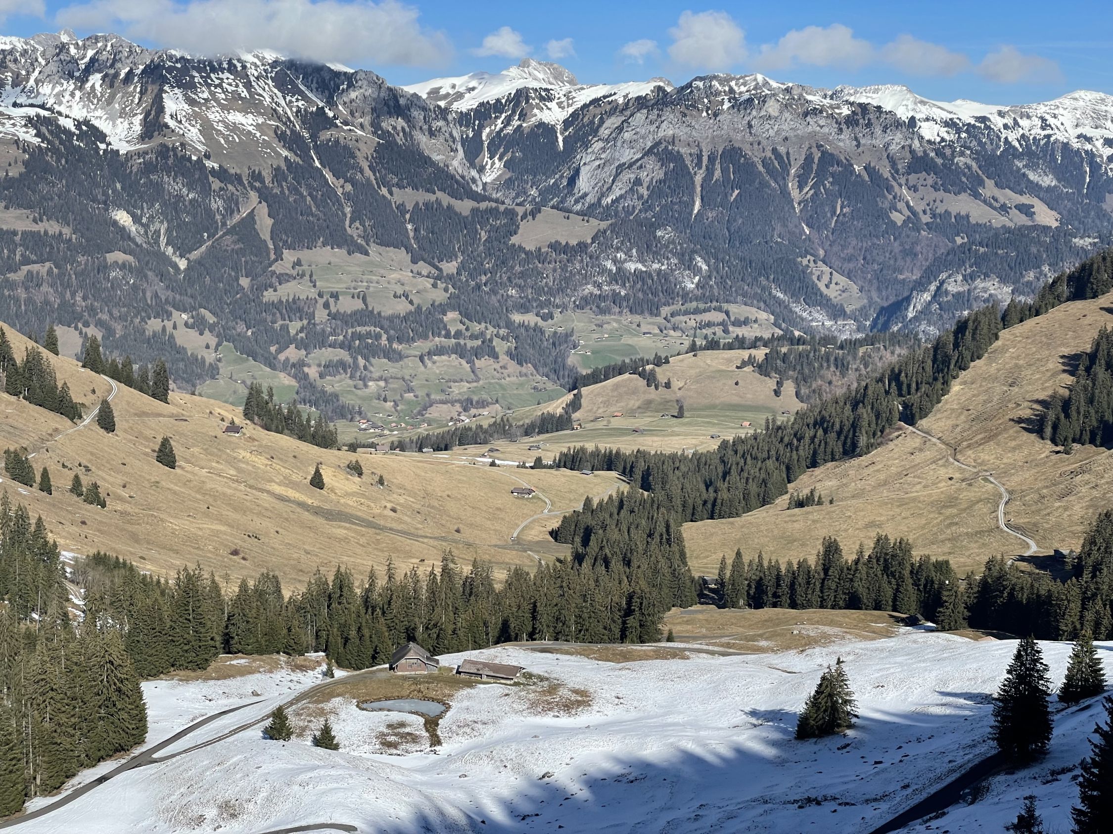 Bei Rossberg ausser etwas Kuntschnee gar nichts an Weiss. Zuerst mal von Schönebode hoch einiges an Skitragen, es hatte viel weniger Schnee, als ich gedacht hatte. Danach mit Ski dem Sommerweg nach hoch, wenige cm Pulver auf sehr harter Unterlage. Gut zum Steigen, an der einzigen steileren Stelle aber ziemlich rutschig. Ich fühlte mich besser mit nochmaligem kurzen Skitragen. Dann über die schönen, offenen Hänge bei Traumwetter zum Gipfel. Ich war heute der Einzige hier, ein Blick in die Runde zeigte einige Spuren am Stand, wenige am Meniggrat und Puur sowie am Gestelegrat. Hübsche kurze Pause, dann Abfahrt: oben könnte es kaum besser sein, Mitte dann ratterte es wegen der alten harten Spuren ziemlich unter dem wenigen Neuschnee. Unten traversierte ich dann rüber in den Grätlihang, wo ich im Aufstieg noch ein Altschneeband gesehen hatte. Auf diesem mit ein paarmal Abziehen noch bis Schönebode fahrbar.