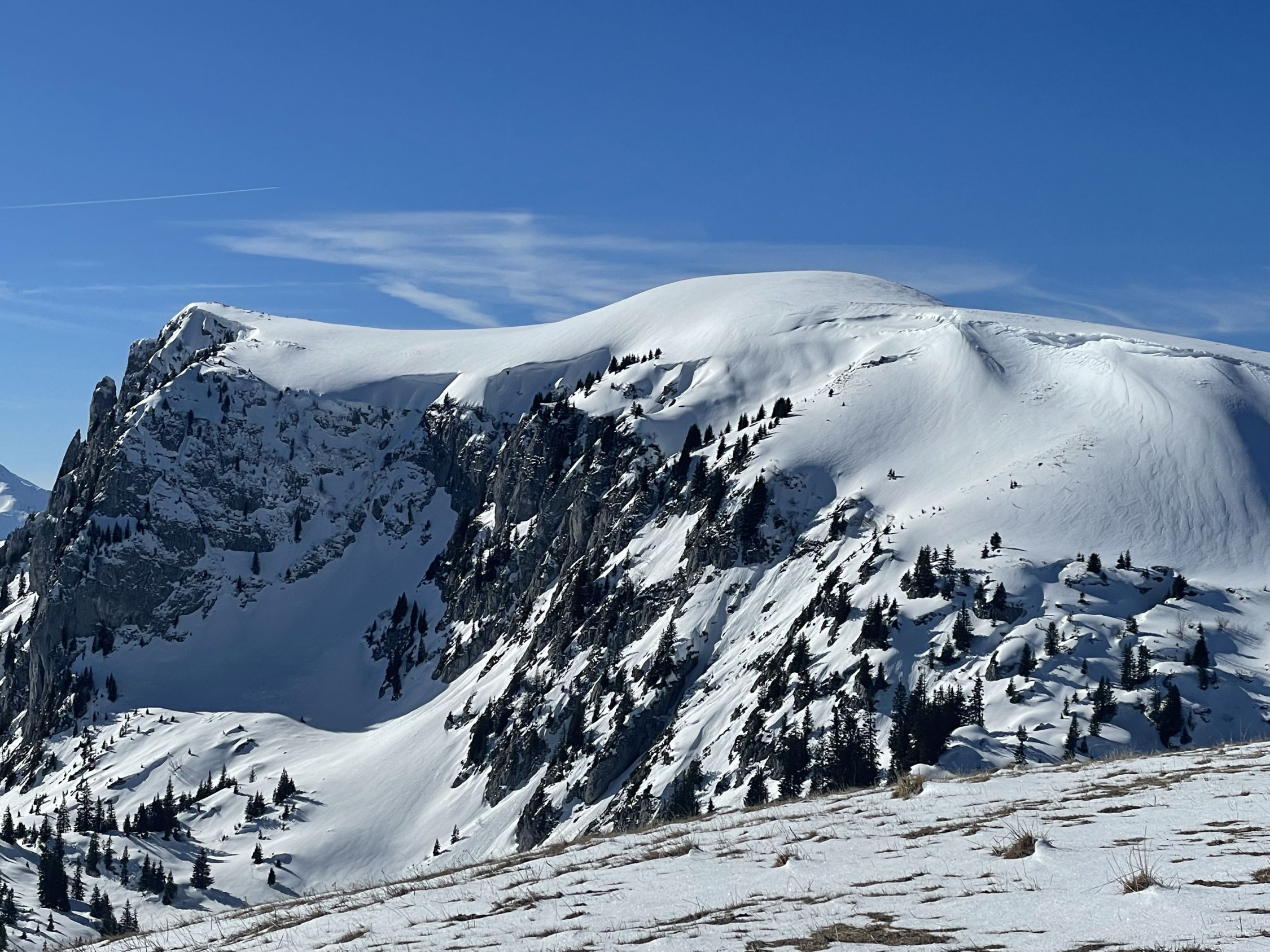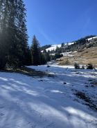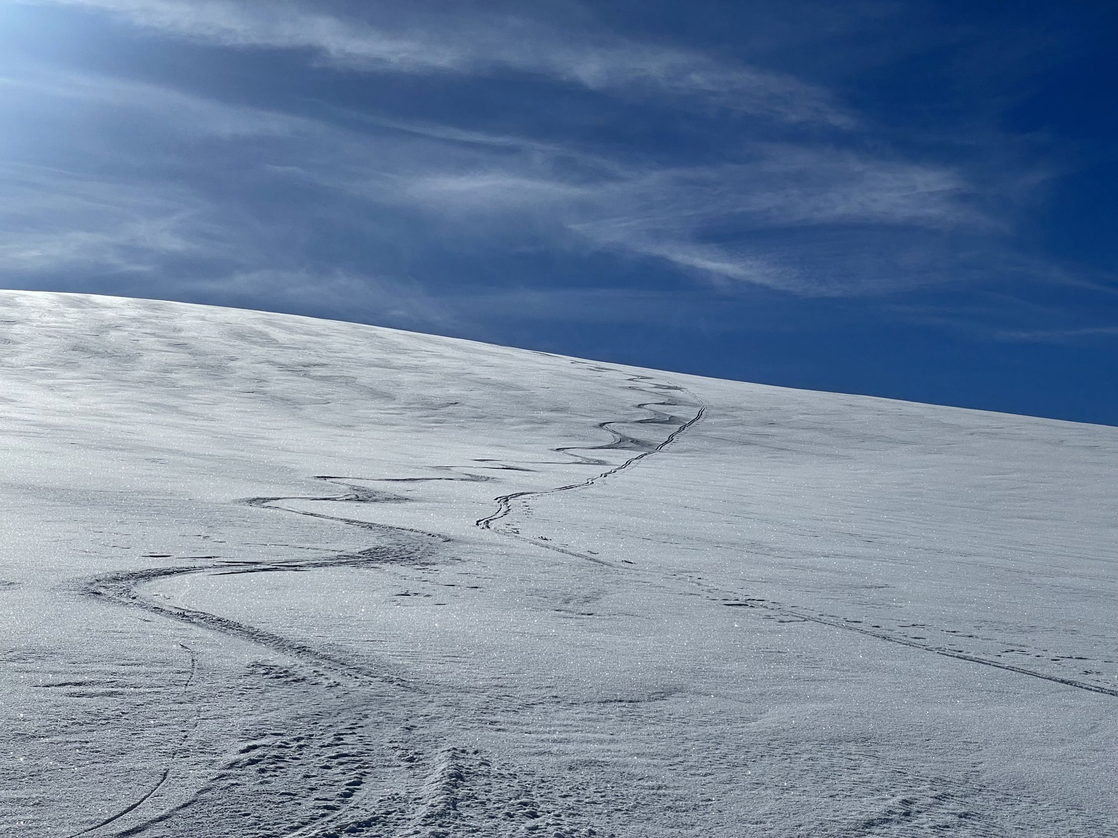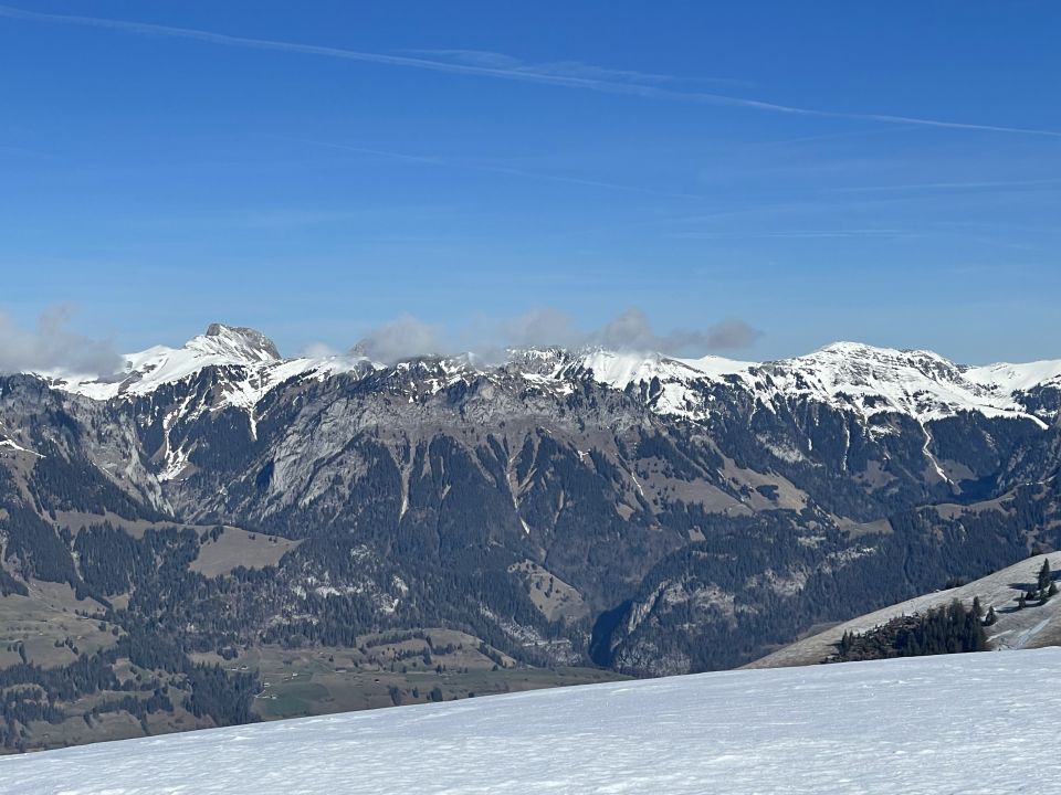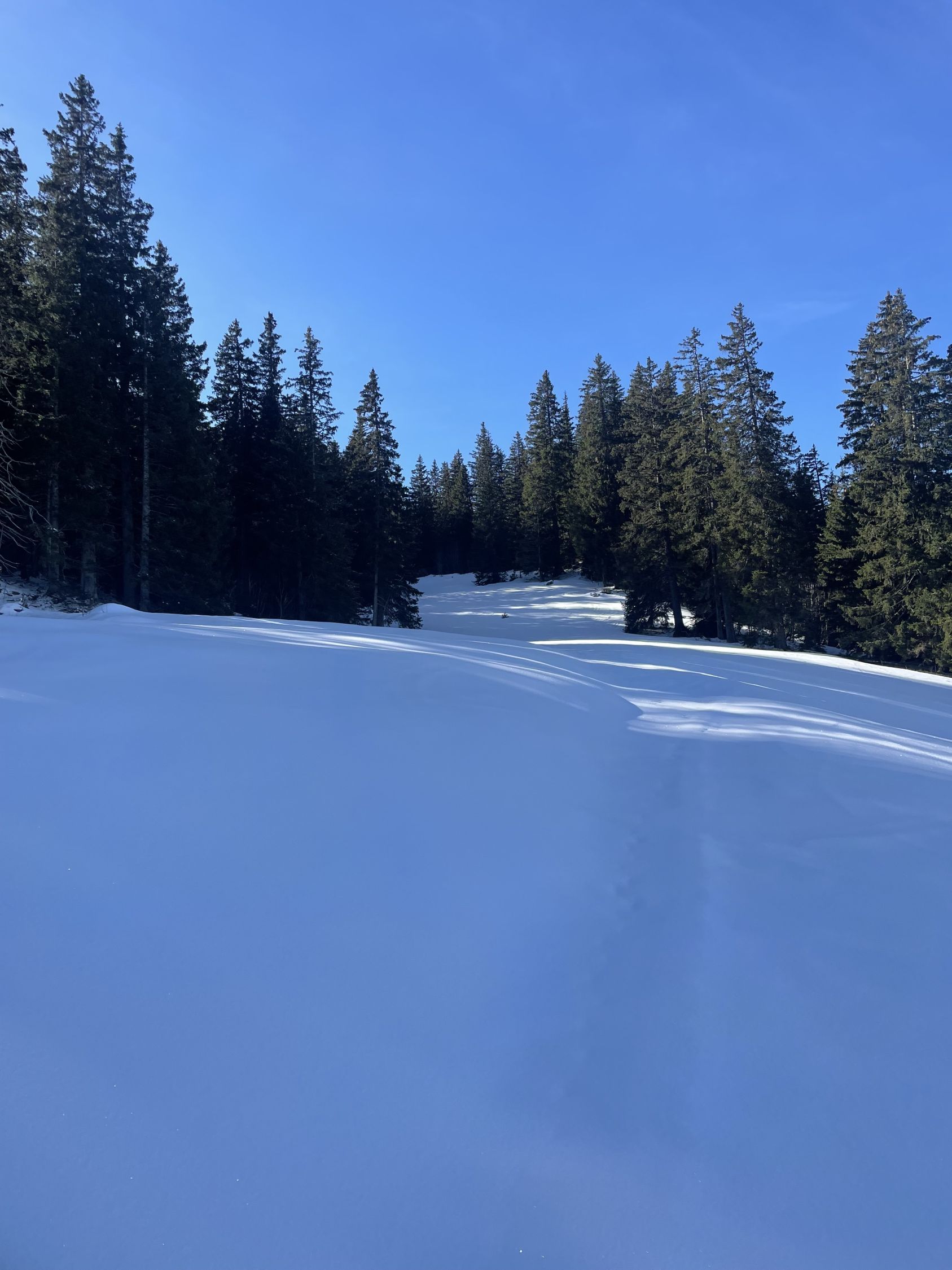 Bei Rossberg ausser etwas Kuntschnee gar nichts an Weiss. Zuerst mal von Schönebode hoch einiges an Skitragen, es hatte viel weniger Schnee, als ich gedacht hatte. Danach mit Ski dem Sommerweg nach hoch, wenige cm Pulver auf sehr harter Unterlage. Gut zum Steigen, an der einzigen steileren Stelle aber ziemlich rutschig. Ich fühlte mich besser mit nochmaligem kurzen Skitragen. Dann über die schönen, offenen Hänge bei Traumwetter zum Gipfel. Ich war heute der Einzige hier, ein Blick in die Runde zeigte einige Spuren am Stand, wenige am Meniggrat und Puur sowie am Gestelegrat. Hübsche kurze Pause, dann Abfahrt: oben könnte es kaum besser sein, Mitte dann ratterte es wegen der alten harten Spuren ziemlich unter dem wenigen Neuschnee. Unten traversierte ich dann rüber in den Grätlihang, wo ich im Aufstieg noch ein Altschneeband gesehen hatte. Auf diesem mit ein paarmal Abziehen noch bis Schönebode fahrbar.