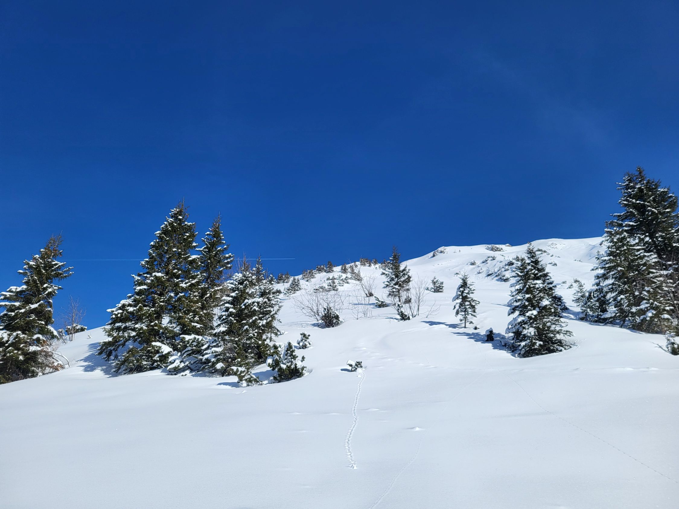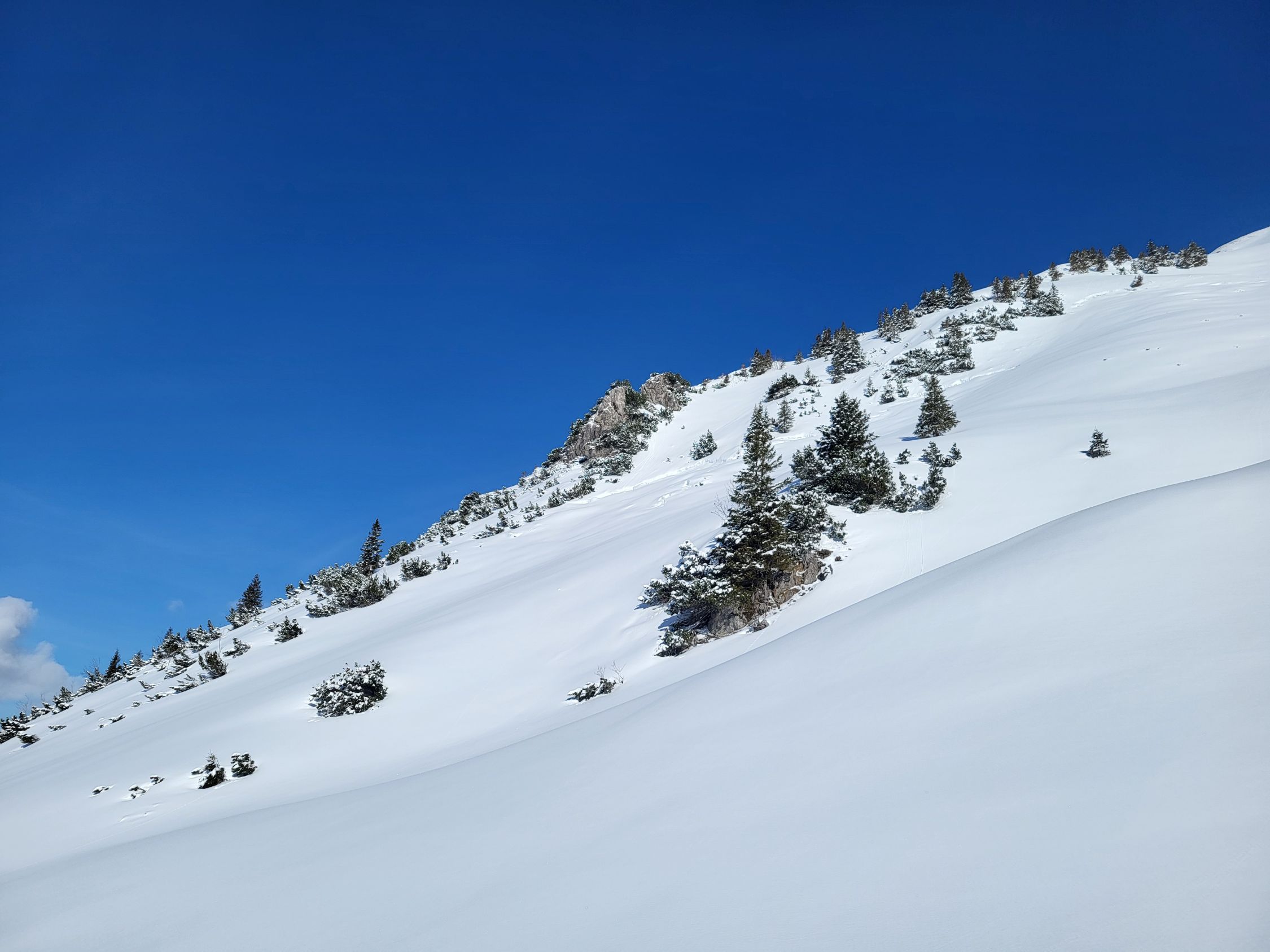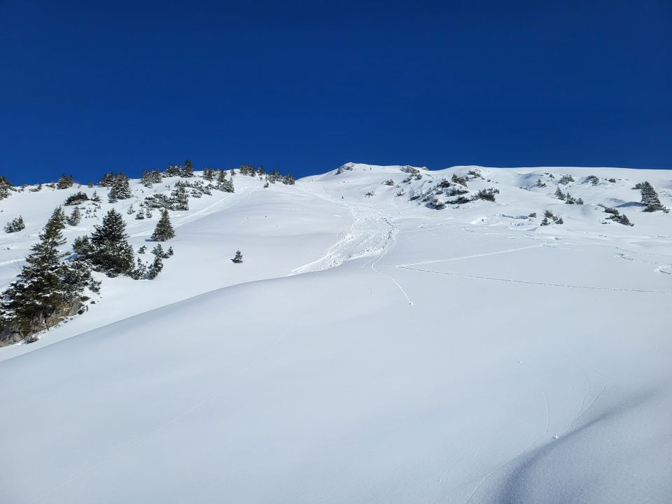 Aufgrund der Sonneneinstrahlung, schnelle durchfeuchtung des Schnees am frühen Nachmittag. Bei der Abfahrt vom Gipfel wurden durch abfahrende Skitourengeher zwei (Nasschnee)-Lawinen ausgelöst. Die mächtigen Gleitschneerisse entlang des Hanges von Bärenkopf hinüber zum kleinen Widderstein sind vom Tal aus nicht zu erkennen.