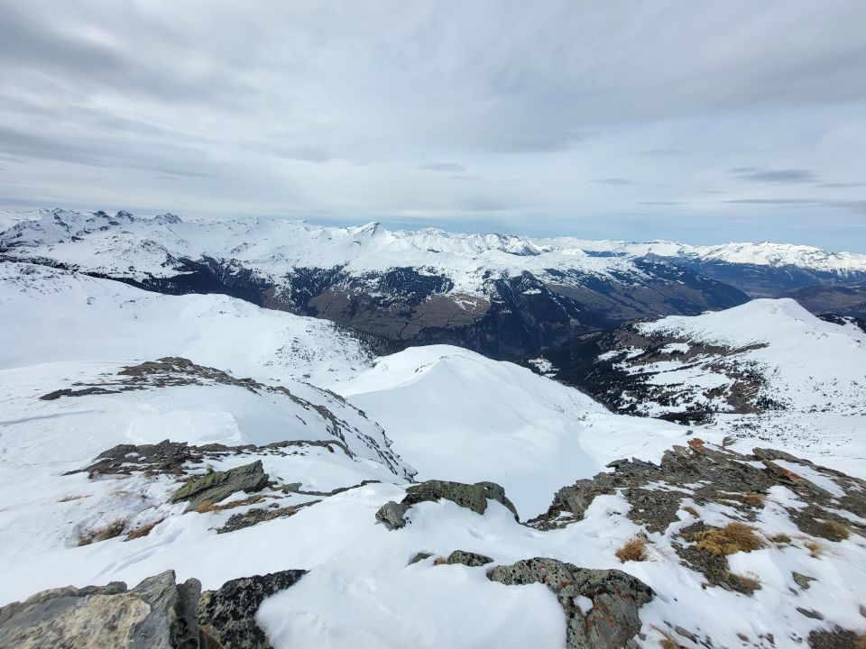 Skitragen bis ca. 1465 m.ü.M., Dann fast durchgängig Schnee für den Aufstieg und Abfahrt. Ein paar Bäume liegen im Weg. Ab Plan Tischatscha ca. 15 cm Pulver zum spuren. Gegen oben leicht zunehmend. Traverse unter der Alp gut zu gehen und vollständig im Schnee. Ich bin unter den Felsen Crap Seala zu Halla und über P. 2358 zum Grat hoch zw. Pintg Neaza und Curver. Dann kurz in die SW Flanke und wieder zurück in die Nordflanke und zum Gipfel hoch.