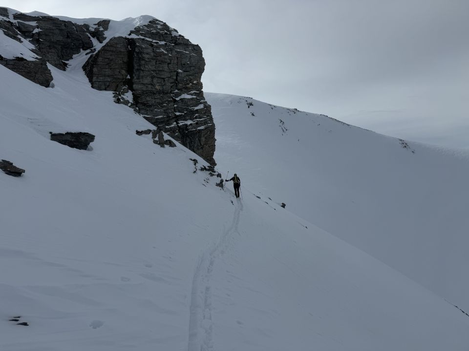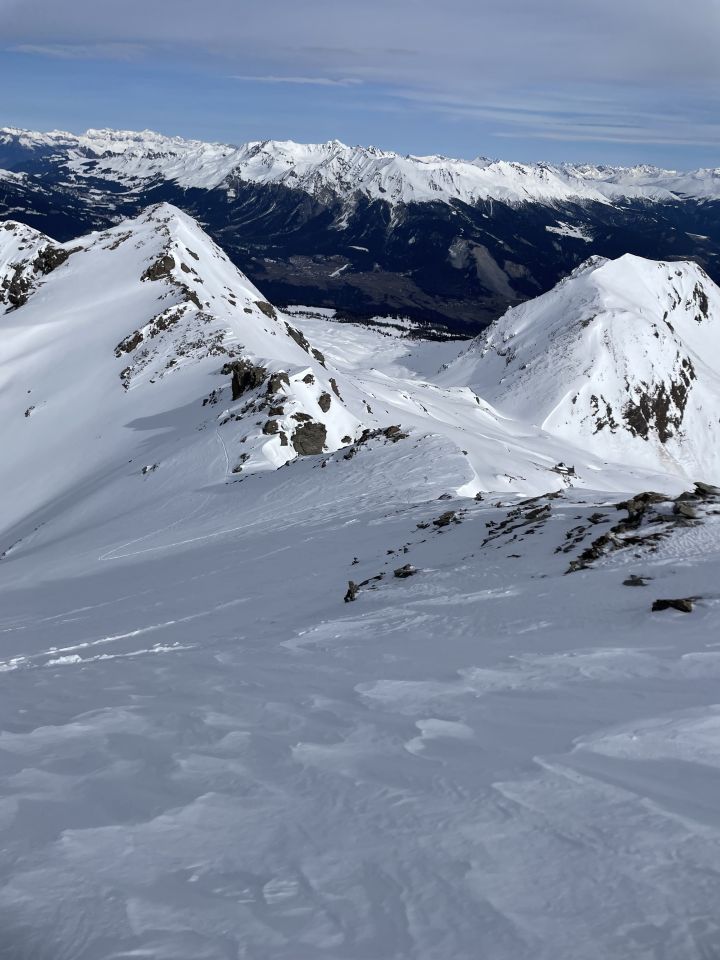 Start 8 Uhr und schnell sehr warm. Felle haben gestollt bis 2600m. Steilstufe gut zu machen. Abfahrt schon sulzig.