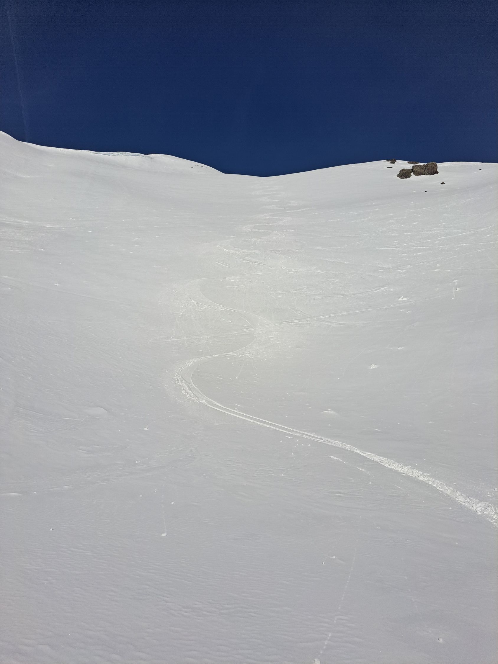 Darum vom Gipfel südostseitig die Wanne runter bei feinstem Firn. Dann abwechselnd Pulver und Firn bis "Inner Urden" weiter dann auf dem Ziehweg bis Clüs ins Skigebiet.