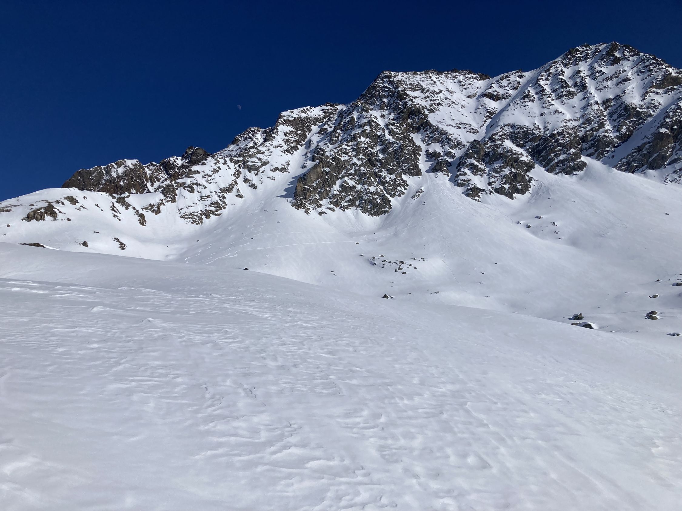 Ich bin vom Helgenhorn bis zum Stausee abgefahren bzw. Bis zum vermeintlichen Ufer. Dort beim wiederanfellen sank ich just bis zur Hüfte in faulem Schnee ein und nahm ich versehentlich ein Fußbad. Von einer Seeúberschreitung ist auch da es ein Stausee ist anzuraten.