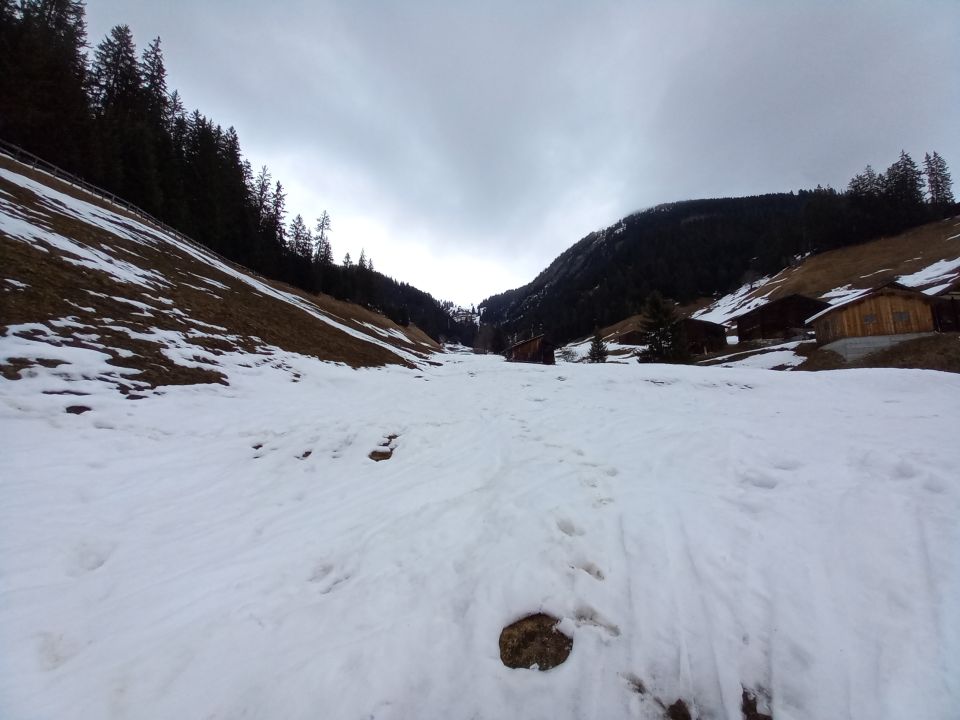 Start um 9 Uhr in Langwies, bei gar nicht winterlichen Verhältnissen: trüb und zu warm. Dem Gleis nach Arosa folgen, dann findet man tatsächlich noch Schnee auf dem man bis ins Dorfzentrum aufsteigen kann.:-) Hinter dem Konsum ist dann ebenfalls wieder knapp Schnee bis zur Verzweigung Pkt. 1490. Ab da der Fahrstrasse nach Pirigen gefolgt, immer wieder kurze Tragestellen, ab ca. 1600m dann durchgehend Schnee auf der Strasse. Bei Pkt. 1667 besser auf der Strasse bleiben, der abkürzende Wanderweg führt geradewegs ins steile Trageverderben! Ab Pirigen dann eigentlich ordentlich Schnee, sehr feucht, man bricht ein. Der neblige Nieselregen wurde zudem stärker, sodass wir bei Ober Prigen umkehrten. Abfahrt auf der Strasse, gar nicht so schlimm, Bremsschnee.