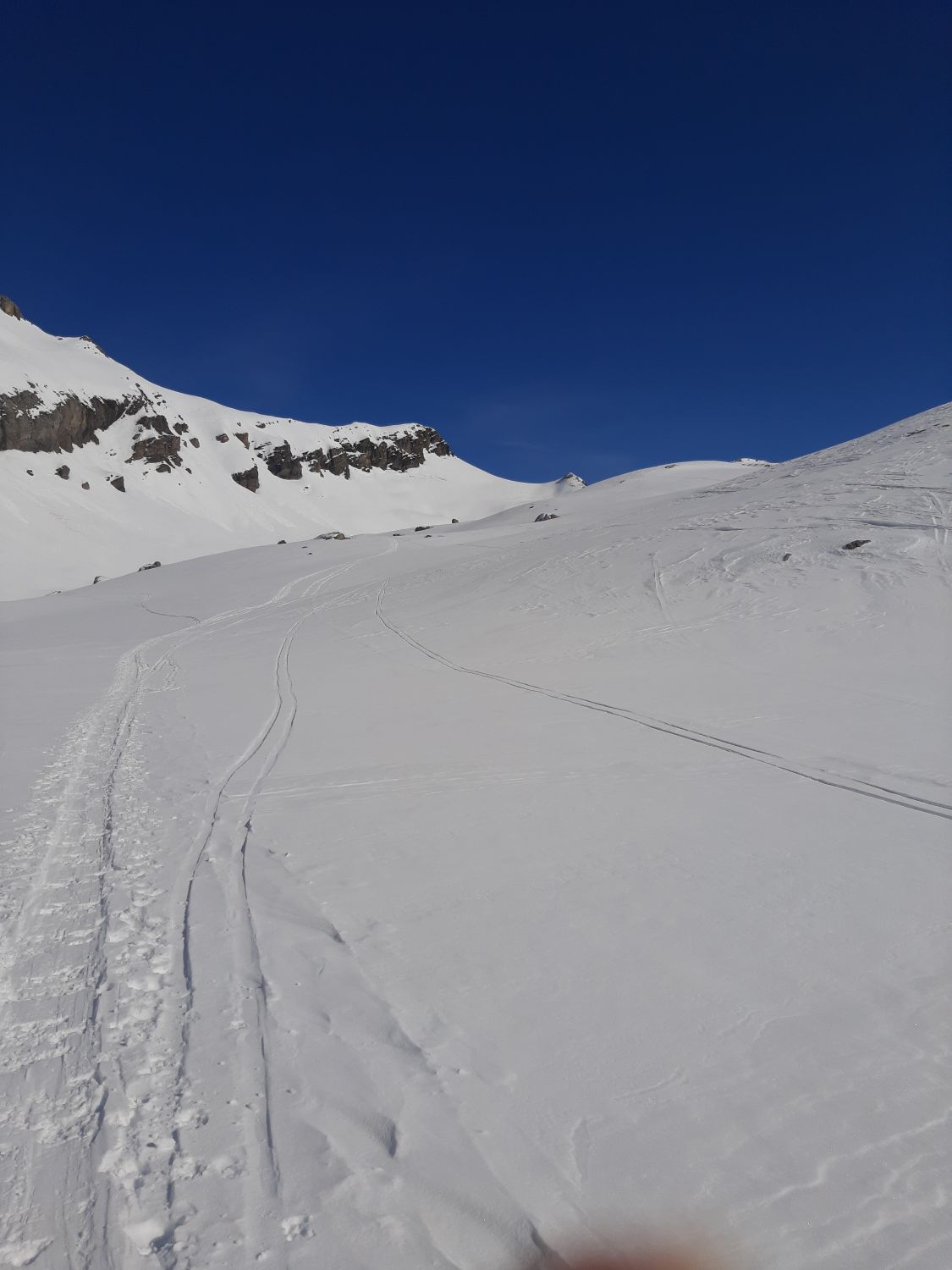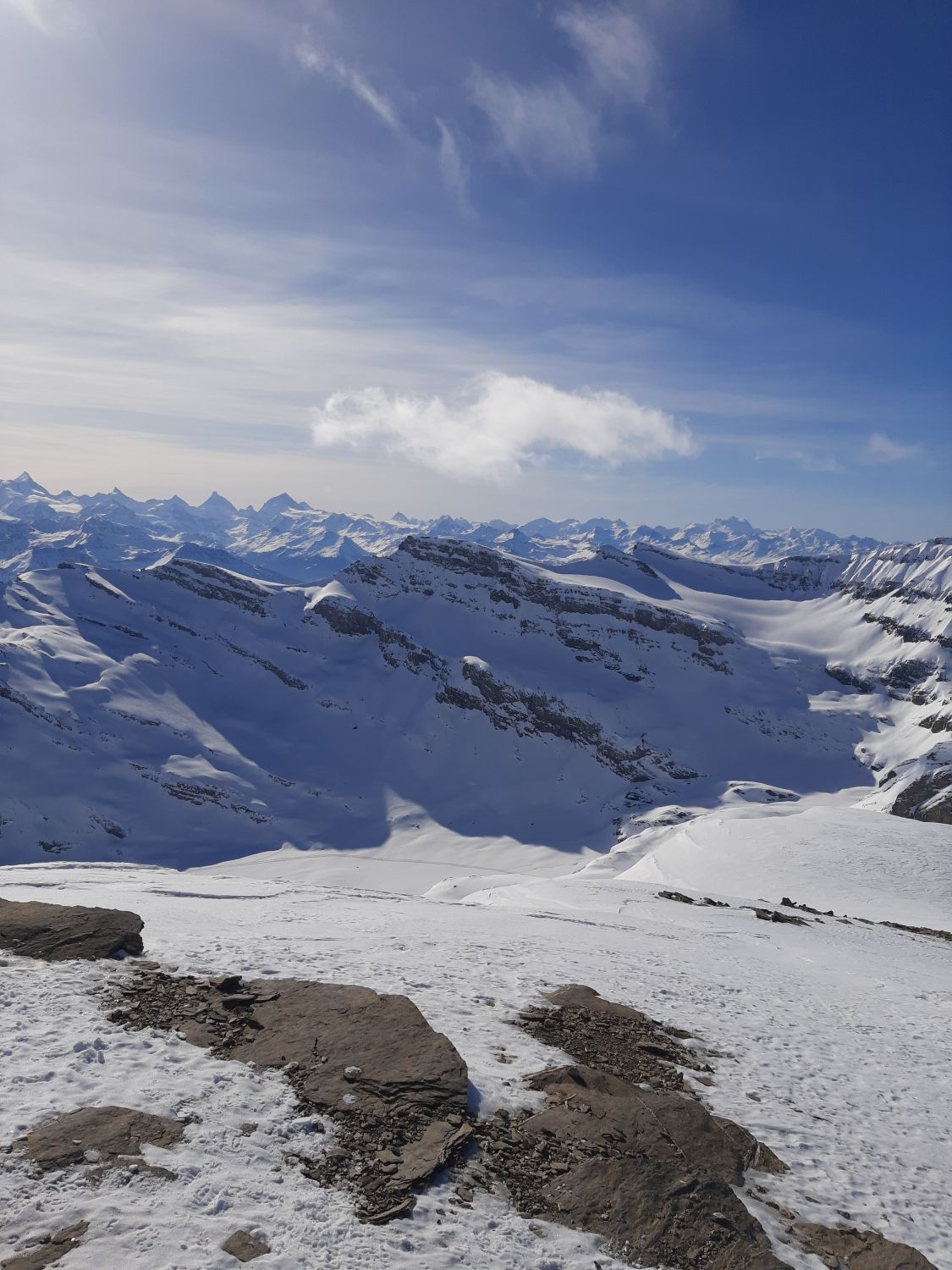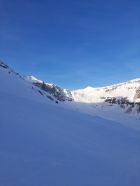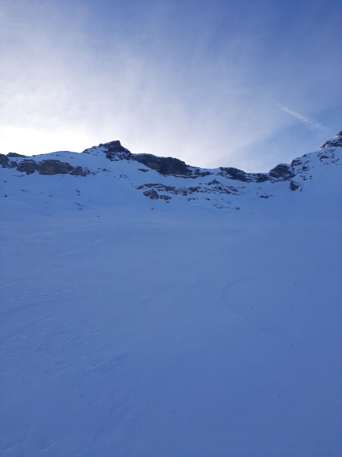 Es herrschten heute erstaunlich gute Verhältnisse (bezogen auf den Schnee und das Wetter). Der Übergang von der Engstligenalp via Felsriegel ist mit Fixseilen gesichert. Es liegt aber pickelharter Schnee in der Rinne und man muss sich hochziehen (war etwas ein Krampf!) Nach dem Felsriegel die ca. 60m "Schneewand" hoch mit guten Tritten machbar heute. Nach dem Gipfel entschied ich mich für die Rundtour via Lämmerhütte (oben schöne Abfahrt mit pulvrigen Stellen), Aufstieg zur Rote Totz Lücke. Abfahrt bis unterhalb Chindbettipass dann wieder superschöner pulvriger Schnee. Wiederaufstieg heute dann im Nebelwolkengemisch. Abfahrt Chindbettipass zurück zur Engstligenalp zum Teil auch noch einige schöne Schwünge möglich.