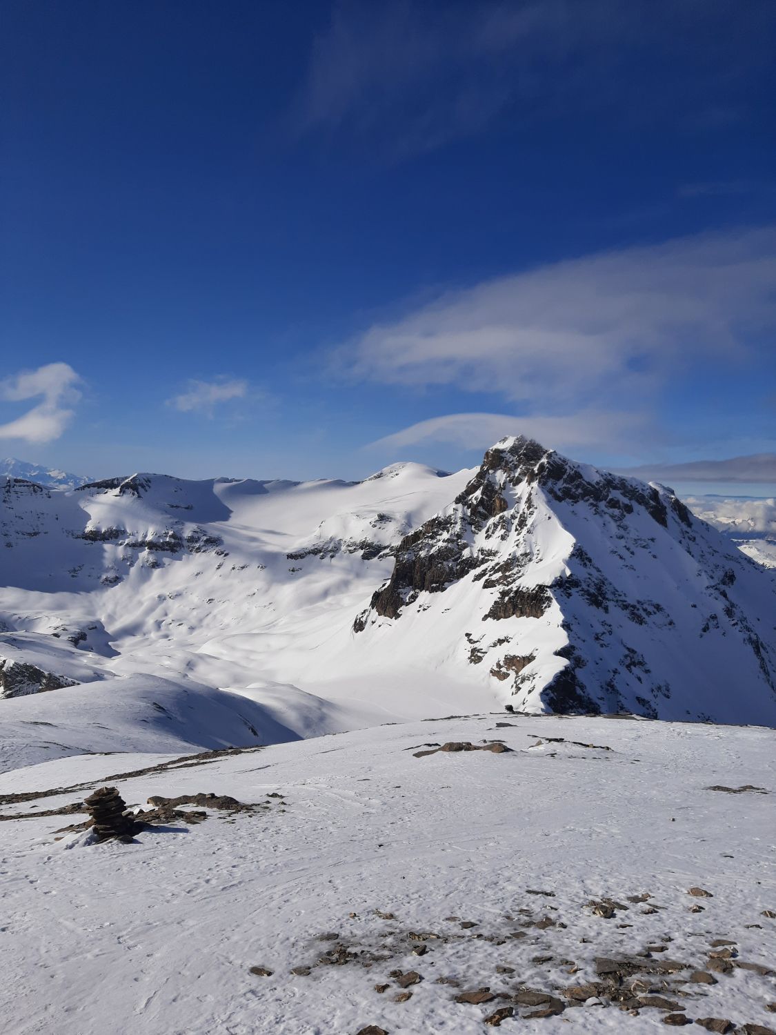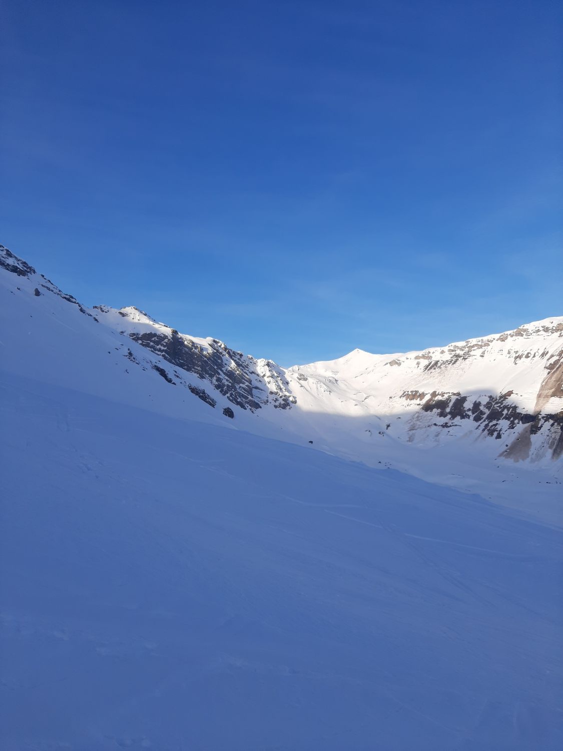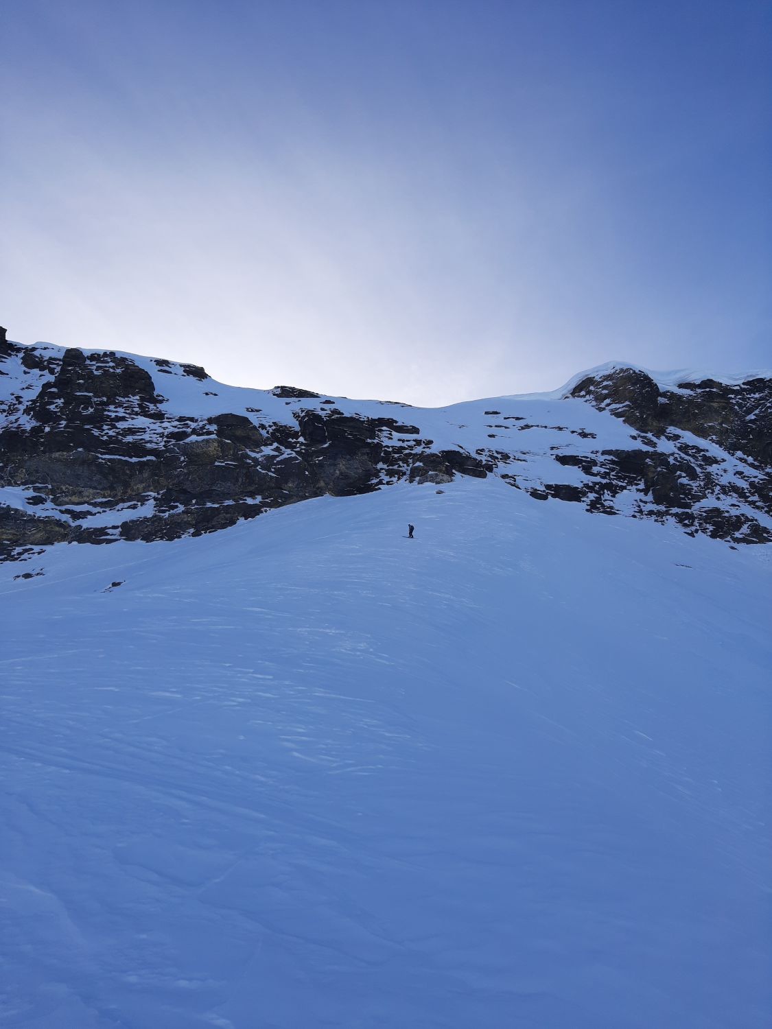 Es herrschten heute erstaunlich gute Verhältnisse (bezogen auf den Schnee und das Wetter). Der Übergang von der Engstligenalp via Felsriegel ist mit Fixseilen gesichert. Es liegt aber pickelharter Schnee in der Rinne und man muss sich hochziehen (war etwas ein Krampf!) Nach dem Felsriegel die ca. 60m "Schneewand" hoch mit guten Tritten machbar heute. Nach dem Gipfel entschied ich mich für die Rundtour via Lämmerhütte (oben schöne Abfahrt mit pulvrigen Stellen), Aufstieg zur Rote Totz Lücke. Abfahrt bis unterhalb Chindbettipass dann wieder superschöner pulvriger Schnee. Wiederaufstieg heute dann im Nebelwolkengemisch. Abfahrt Chindbettipass zurück zur Engstligenalp zum Teil auch noch einige schöne Schwünge möglich.
