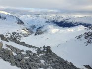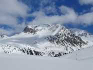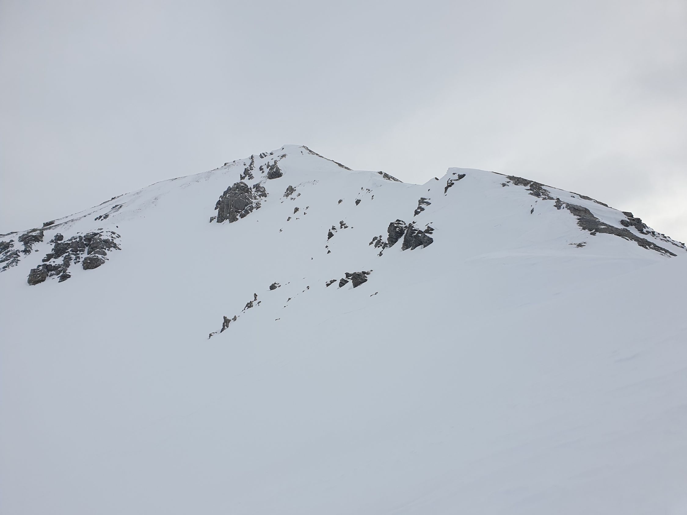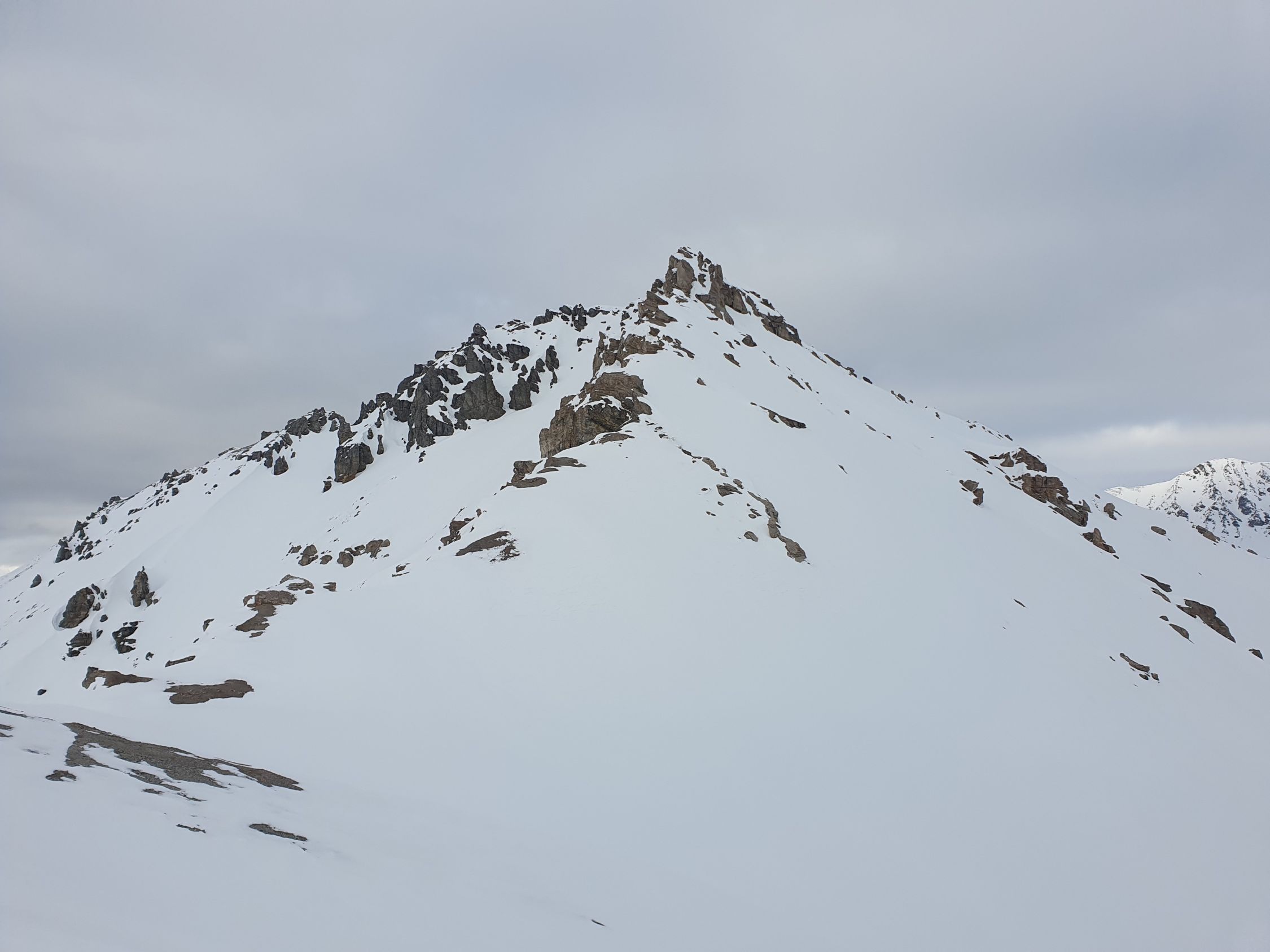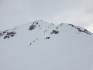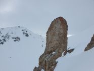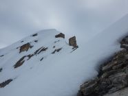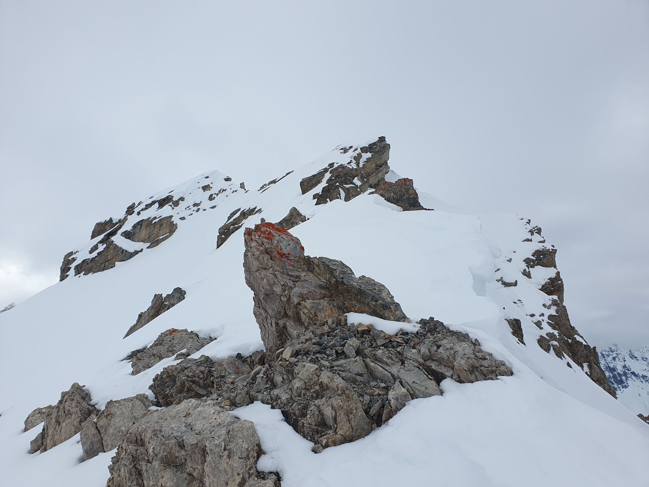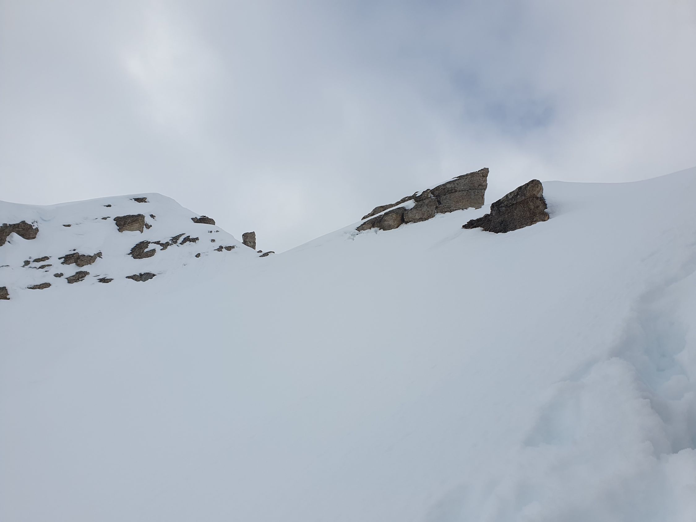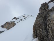 Zum Piz Mezdi geht's steil hoch (bis 40°) in Richtung Grat. Kurz vor dem Grat ist ein markanter Felsbrocken mit Eiszapfen dran zu erkennen, hier eine gute Stelle um den Skidepot einzurichten. Zu Fuss zuerst steil hoch neben den Felsen in ziemlich nassem Schnee (stark einsinkend) zum Grat und in westlicher Richtung weiter zu einem markanten hochstehenden Felsbrocken. Dieser kann südlich umgangen werden. Aufgrund des nassen Schnees auf einer grossen Felsplatte musste ich den Hauptgipfel, der 10 Meter vor mit lag, auslassen. Auf der Platte lag viel zu wenig Schnee und ein Weiterkommen wäre hier fatal gewesen. Alternativ wäre ein Überklettern des Felses möglich gewesen (II+). Wenn die Schneequalität besser gewesen wäre, hätte man den ganzen Hang weiter unterhalb des Grats, resp. beim Skidepot auf gleicher Höhe mehr westlich mit Skis oder zu Fuss weiter und dann nur zu Fuss direkt hoch zum Grat (ohne diese Problemstelle zu begehen) und ausgesetzt zum Gipfel machen können. Aber dafür müsste der Schnee viel härter und komapter sein!