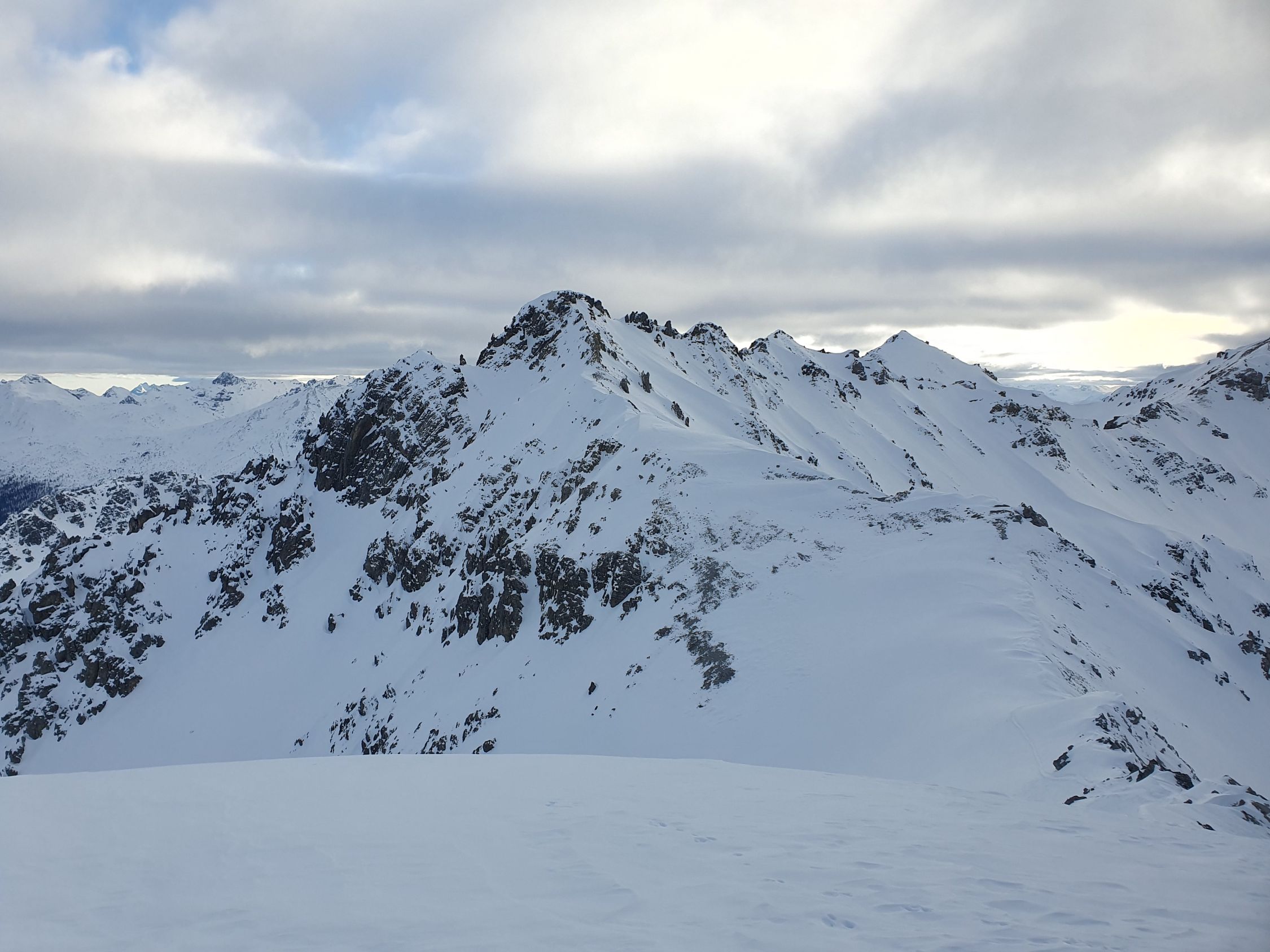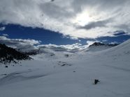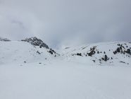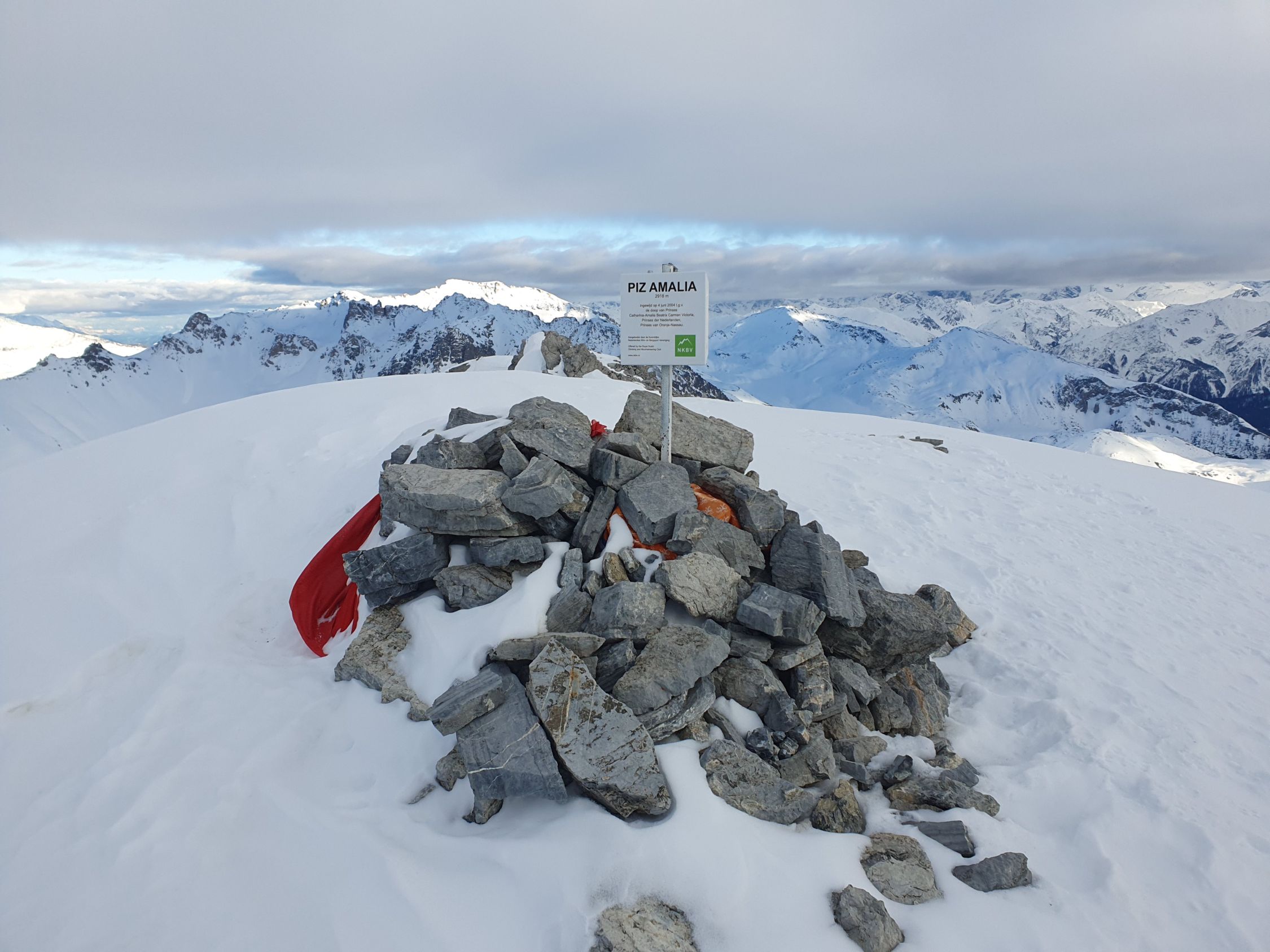 Skiabfahrt mit Fellen hinab querend bis oberhalb der Mulde und hoch via P2772 zum Nordgrat des Piz Amalia. Heute war er stark abgeblasen, deshalb habe ich meine Skis auf dem Grat gelassen und unschwierig zu Fuss hoch zum Piz Amalia. Eine direkte Nordabfahrt mit den Skis wäre möglich gewesen (keine Spuren gesichtet), es sah gut aus, aber für mein Geschmack war das Licht einfach zu diffus; deshalb habe ich die Skis auch auf dem Grat zurückgelassen.