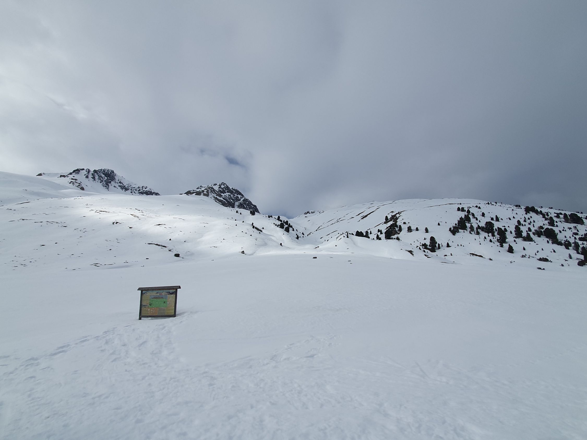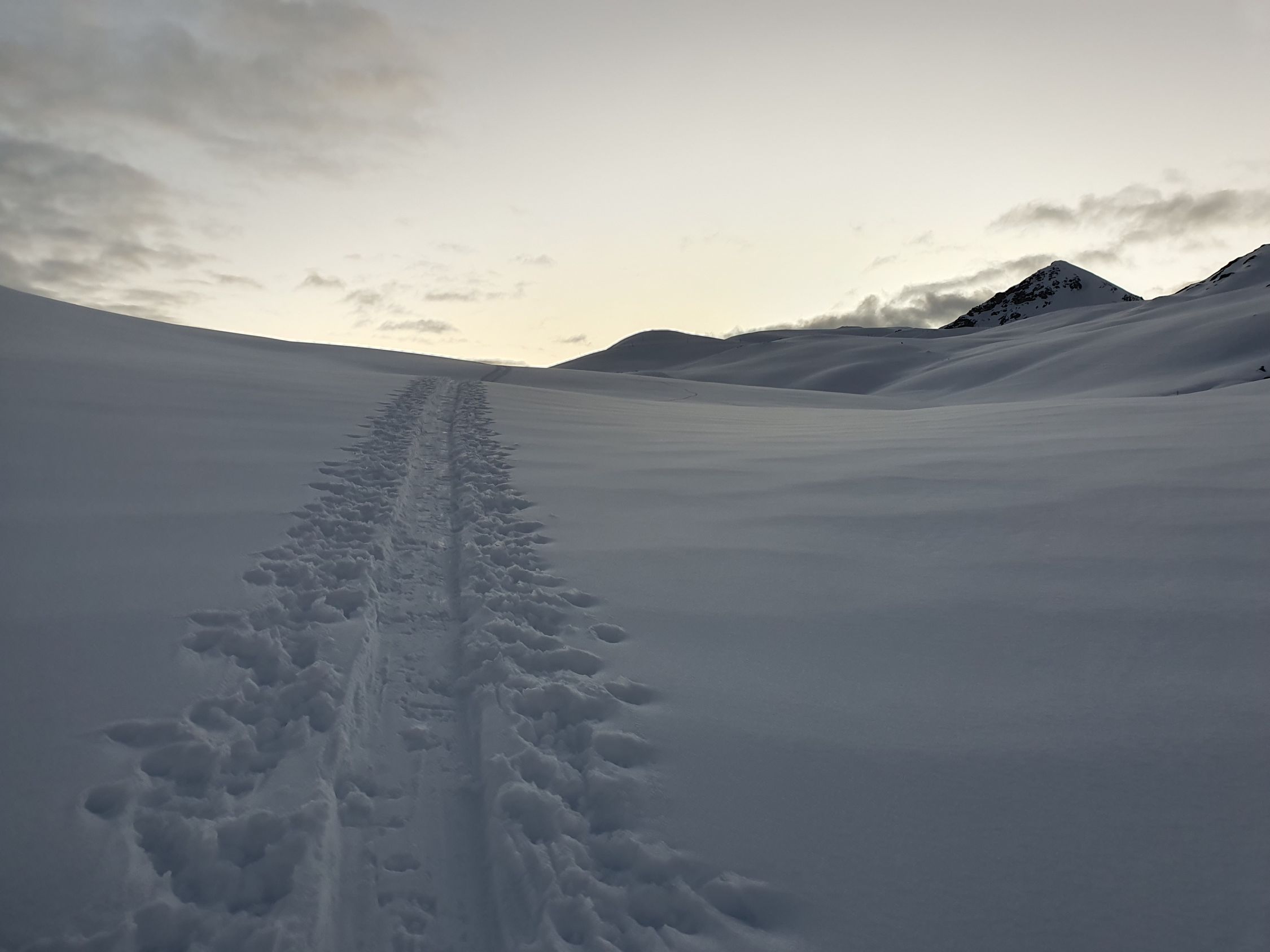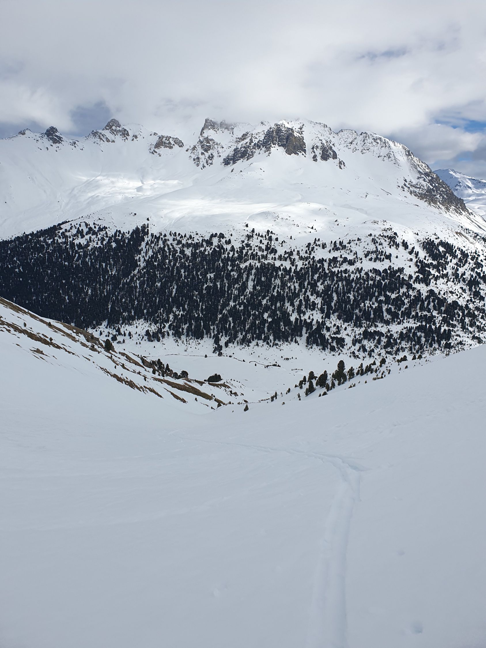 Als Abfahrt habe ich die oberen Hänge von Astras Dadora traversiert und somit bis ca. 2'290Hm ohne anzufellen rüberfahren können. Danach angefellt bis zum unteren Skilift von Vallatscha, resp. Fuorcla Funtana da S-charl (erst um 18:00 angekommen). Dann mit Stirnlampe auf der Piste bis Tschierv.