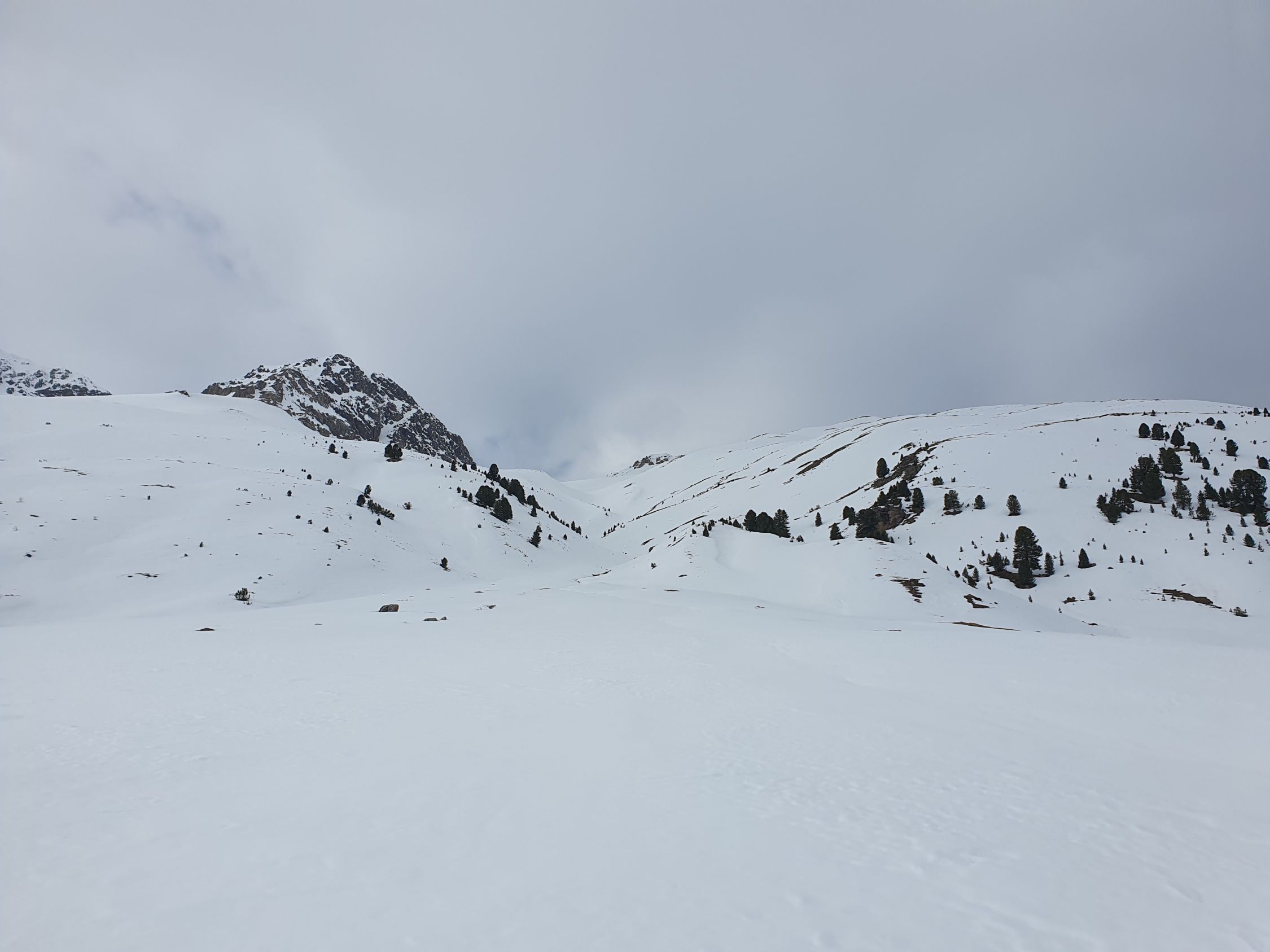 Mit dem Lift bis Minschuns (P2520), dann Abfahrt (sehr spät, ca. 14:00) über die Piste bis Fuorcla Funtana da S-charl, dann im Pulver und im Val S-charl auf klebrigem Sulz etwas mühsam via Alp Astras bis kurz vor der Alp Praditschöl. Hier Anfellen und dem Bächlein entlang in nordwestlichen Richtung leicht steigend, resp. ohne Spitzkehren, zuerst einsinkend, dann tragend hoch bis zur Mulde zwischen Piz Amalia und Piz Mezdi.