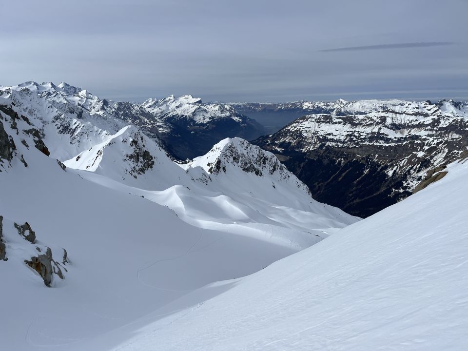 Wenig Schnee bis Unt. Trift, bis hier zu Fuss. Dann Hartschnee bis ins Drosi. Ab etwa 2200 m oberflächlich aufgesulzt. Wunderbarer Pulverschnee auf dem Gigligletscher und bis etwa 2200 m, dann zunehmend Sulz.